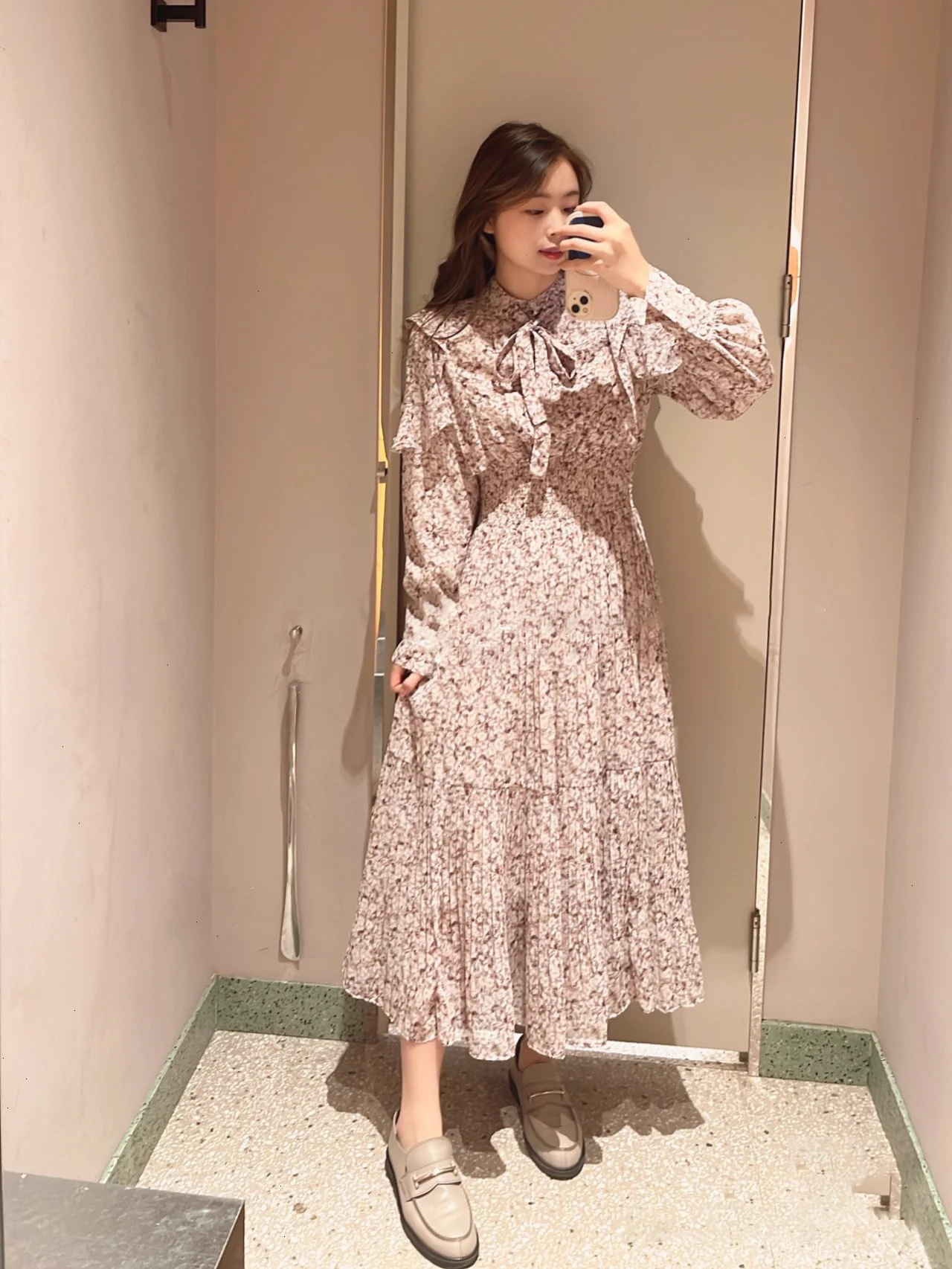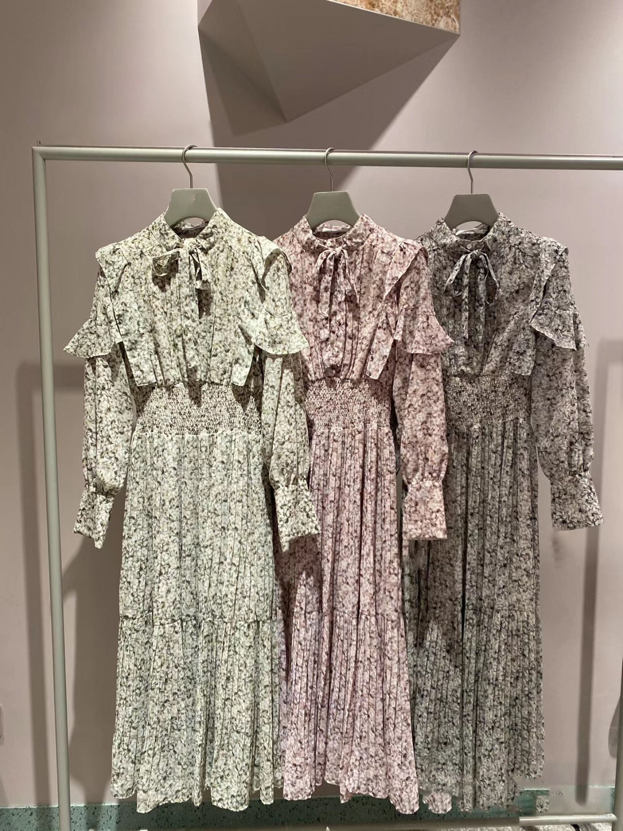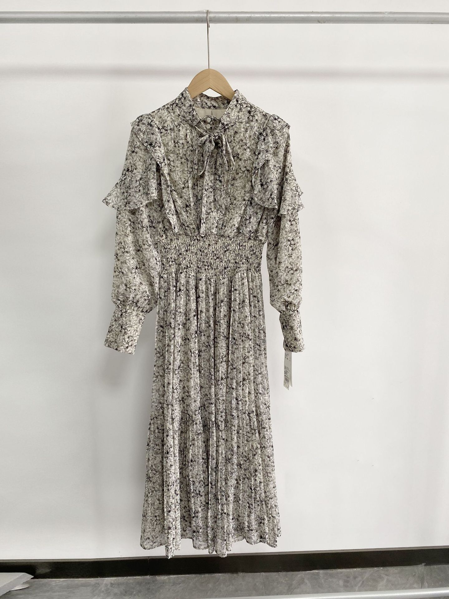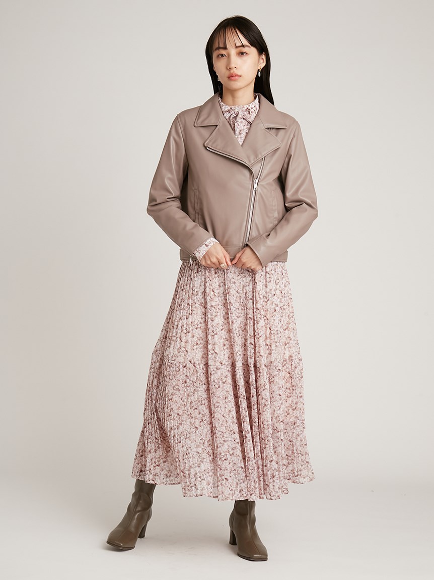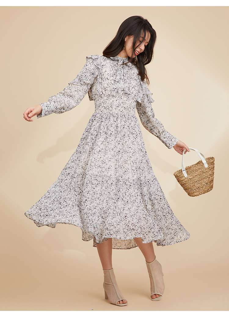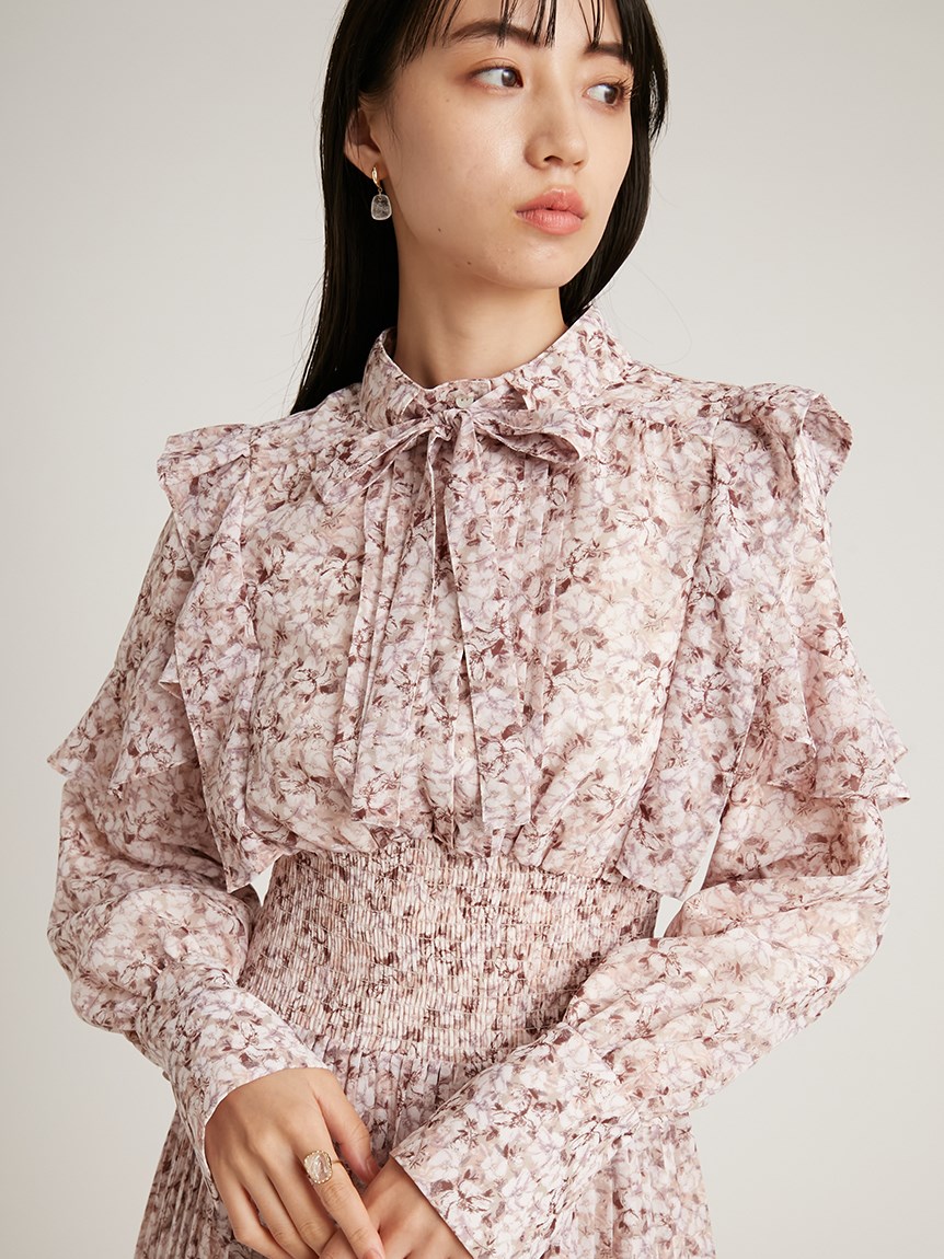 一面に浮かべたオリジナルのフラワープリントが印象的な、春らしいムードを感じさせるスワンピース。細やかなプリーツをふんだんに施したフレアラインが歩くたびになびき、女性らしく軽やかな表情を演出しています。トップ部分にはフリルやリボンをあしらい、どこまでも女性らしい仕上がりに。袖も裏地付きなので長袖インナーとの併用ができ、まだ寒い時期から着られるので、ロングシーズン活躍してくれるアイテムです。