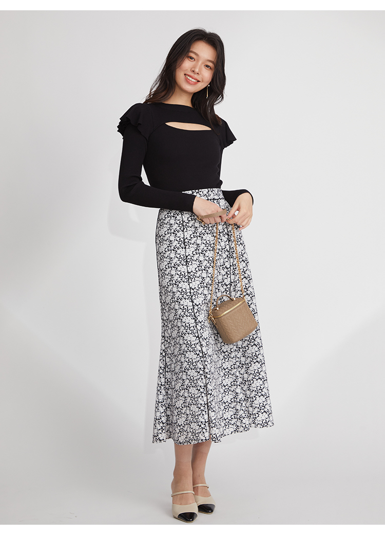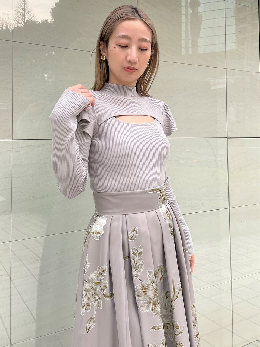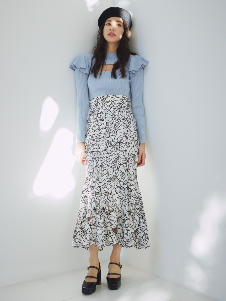 デコルテのカッティングが印象的な、今年らしい肌見せを叶えてくれるニットトップス。袖にはフリルパーツを挟み込むことで「SNIDEL」らしさをプラス。1枚でも華やかに決まる優秀アイテムです。ボディラインにフィットするタイトなシルエットなので合わせるボトムを選ばず幅広く活躍してくれます。