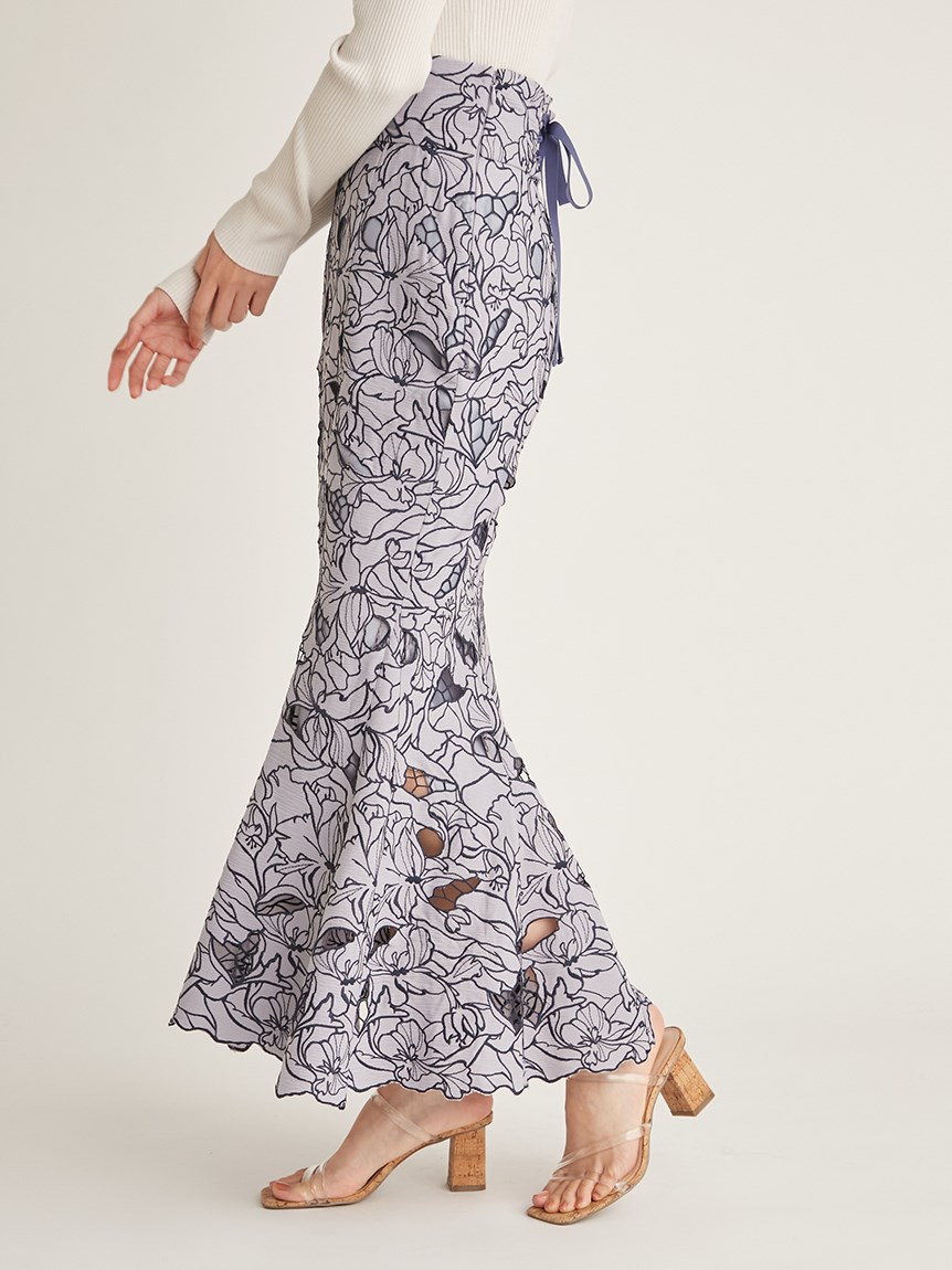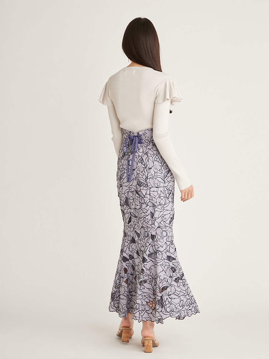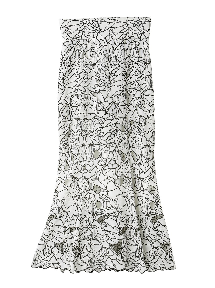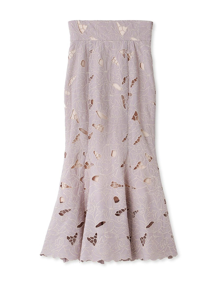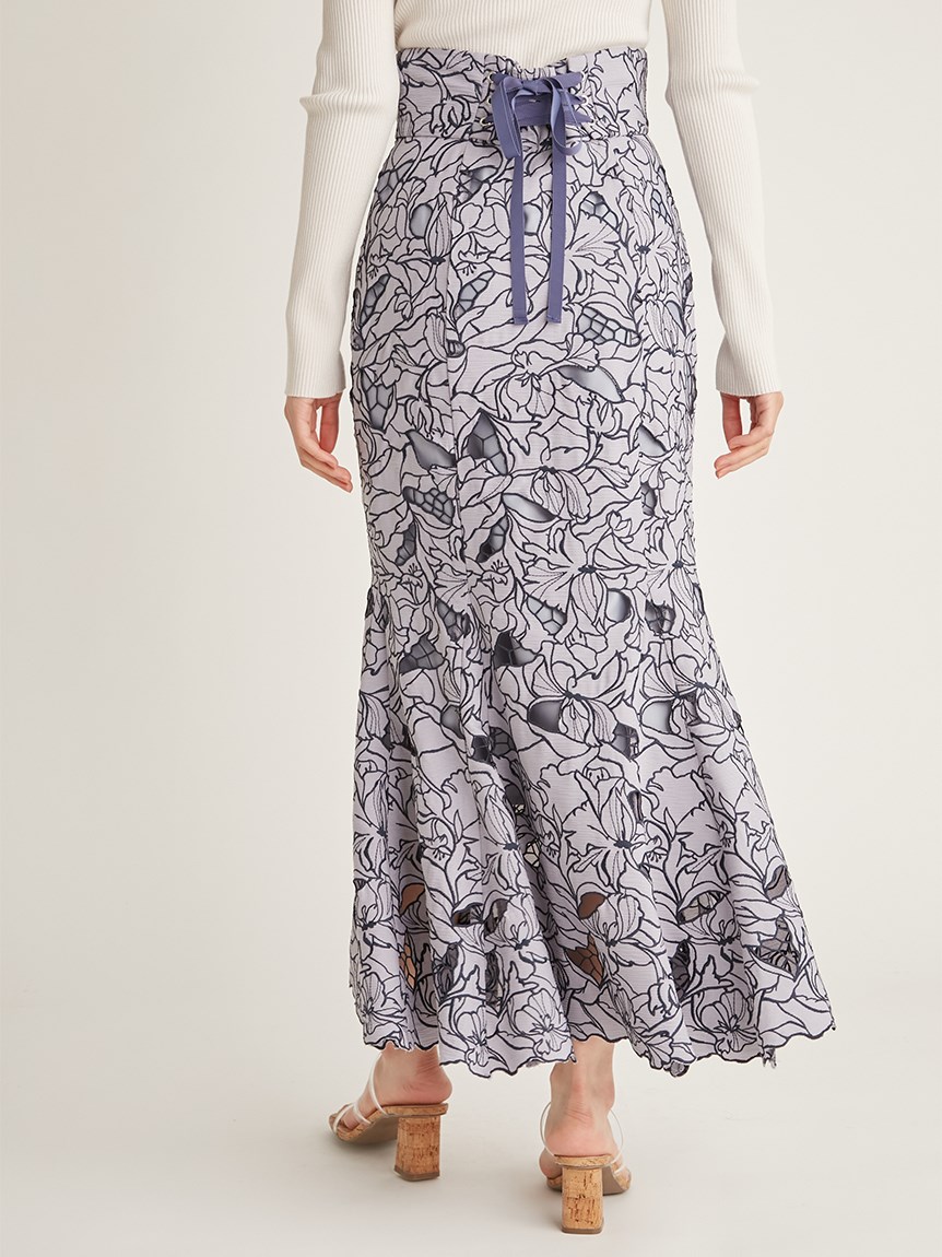 オリジナルの柄を落とし込んだ華やかなカッティングレースのマーメイドスカート。女性らしいメリハリのあるラインでスタイルアップを叶えてくれます。バックウエストにはレースアップデザインを採用し、後ろ姿まで愛らしさを演出。トップスはウエストにINしてすっきりとまとめるのがおすすめです。