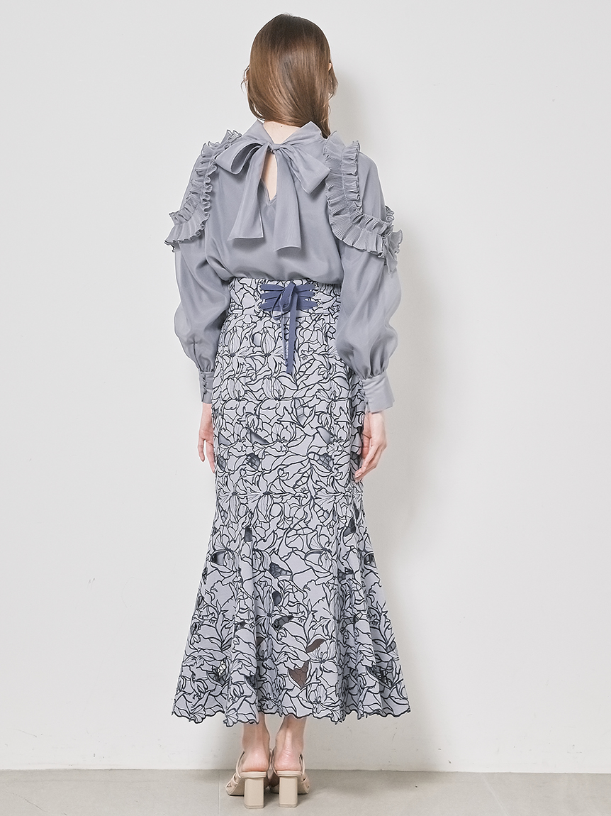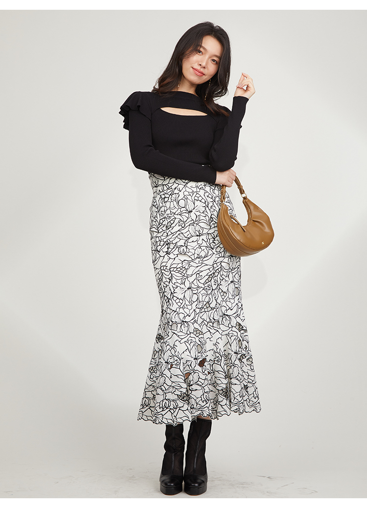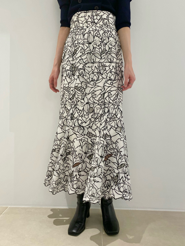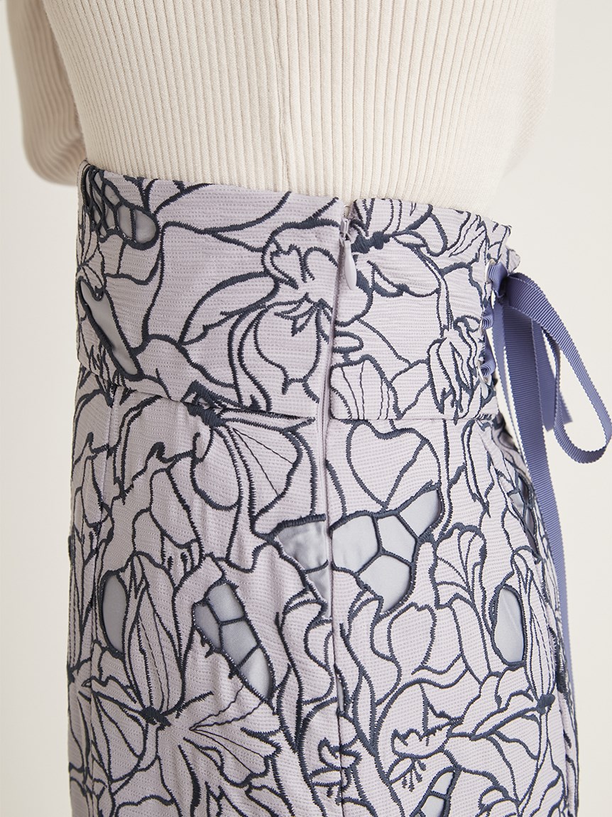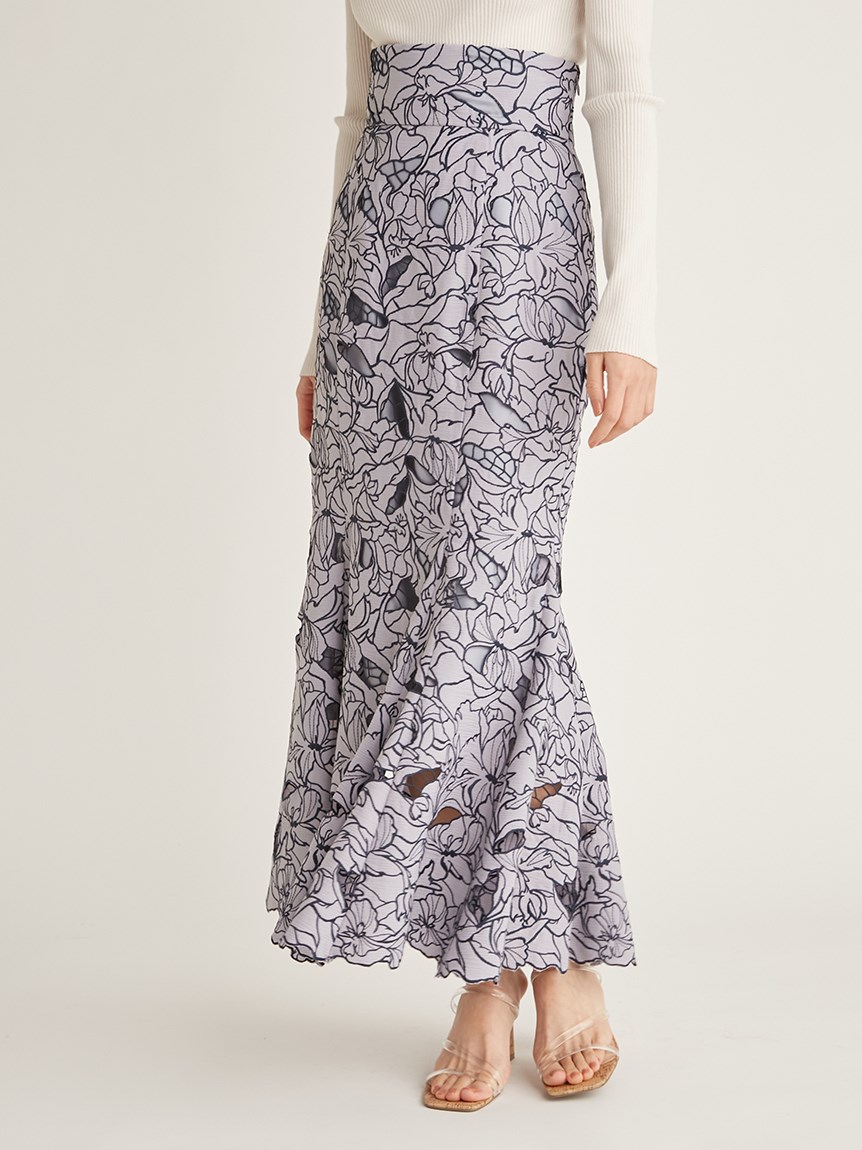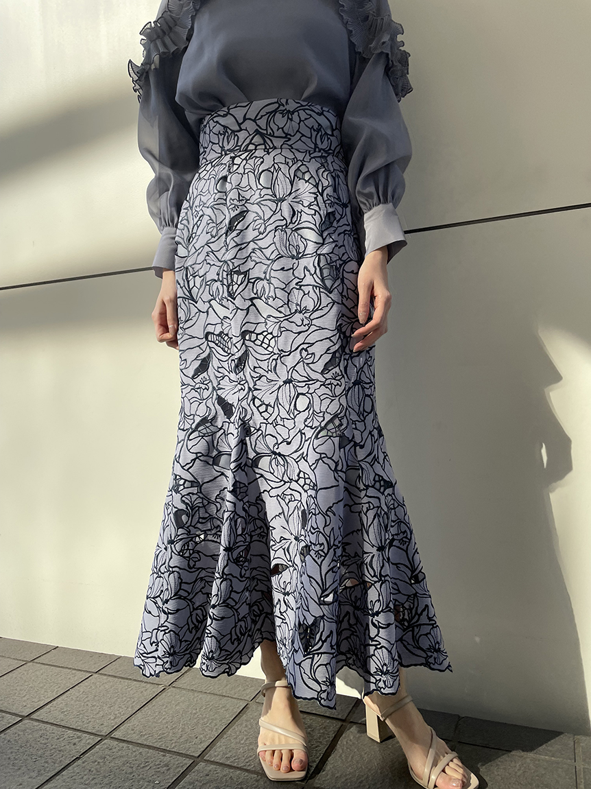 オリジナルの柄を落とし込んだ華やかなカッティングレースのマーメイドスカート。女性らしいメリハリのあるラインでスタイルアップを叶えてくれます。バックウエストにはレースアップデザインを採用し、後ろ姿まで愛らしさを演出。トップスはウエストにINしてすっきりとまとめるのがおすすめです。
