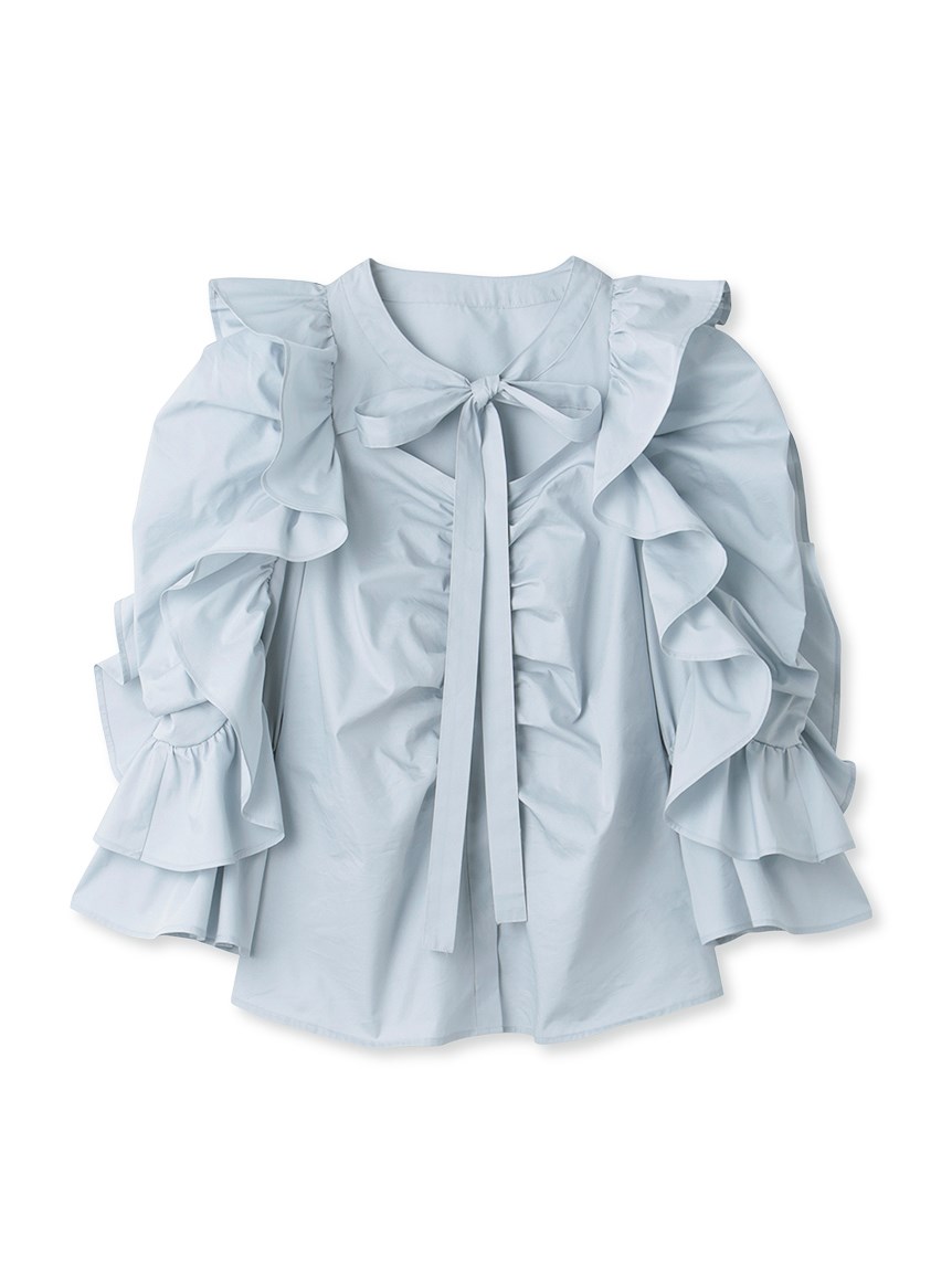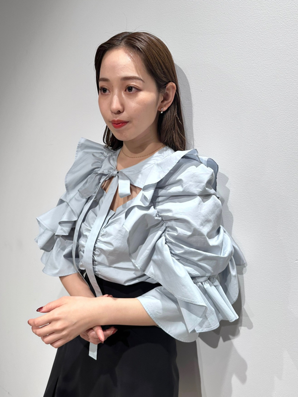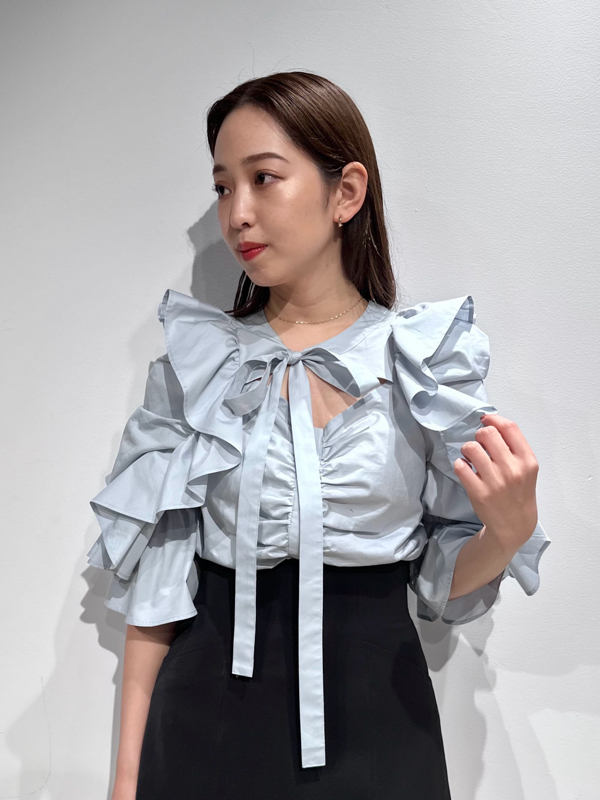 袖にあしらわれたボリュームのあるフリルが印象的な、華やかな雰囲気のブラウス。袖付け位置よりも内側からフリルを配置することでさり気なく華奢見えを演出。トレンドのフロント開きデザインは、広めの襟ぐりと細めのボウタイをプラスし上品に仕上げました。ウエストが緩やかにシェイプされたすっきりとした身頃なので様々なボトムとバランスが取りやすく、スタイリング力も◎です。