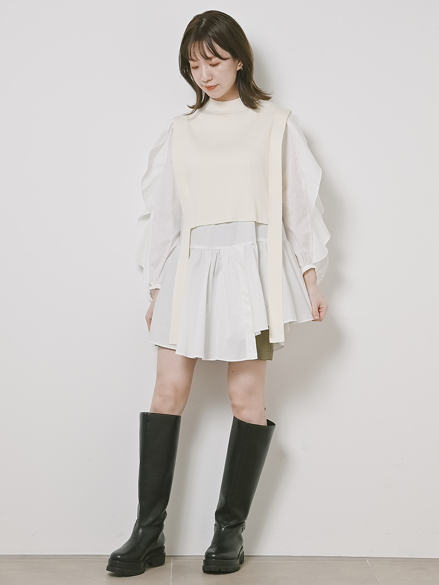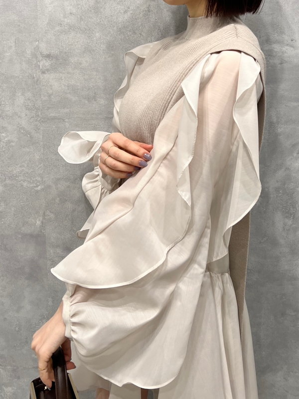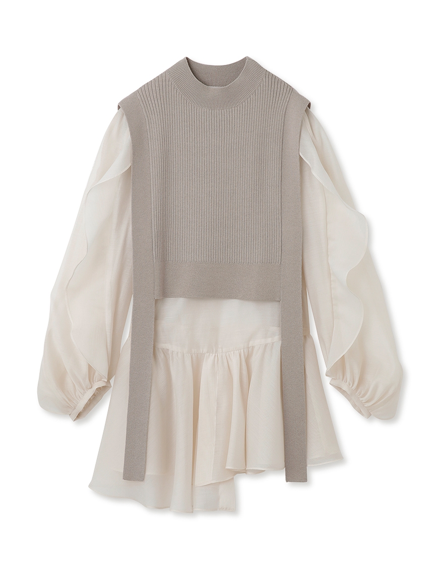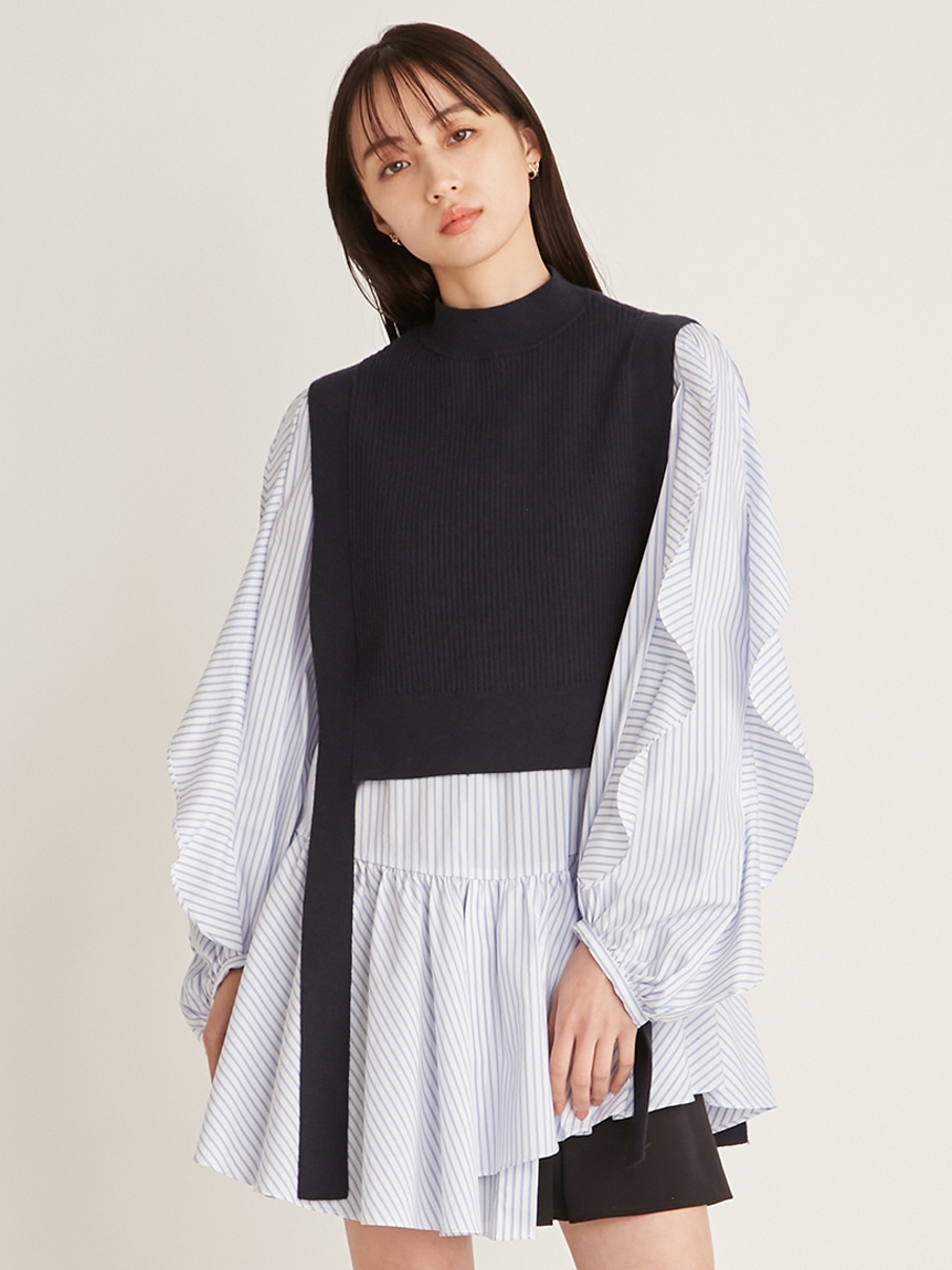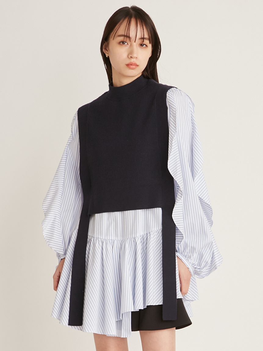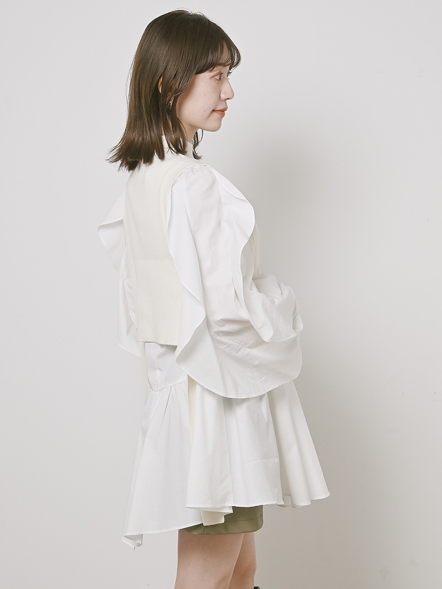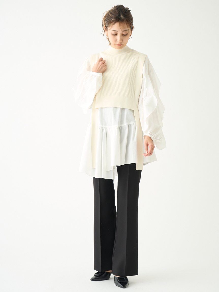 大胆な袖のフリルが目を引くチュニックブラウスにニットベストを組み合わせたセットアイテム。これだけで今年らしいレイヤードスタイルが完成する優秀アイテムです。アシンメトリーなヘムデザインで、フェミニンな中にモードなエッセンスをプラス。それぞれ単品でも活躍してくれるので、コーディネートの幅は一気に広がります。