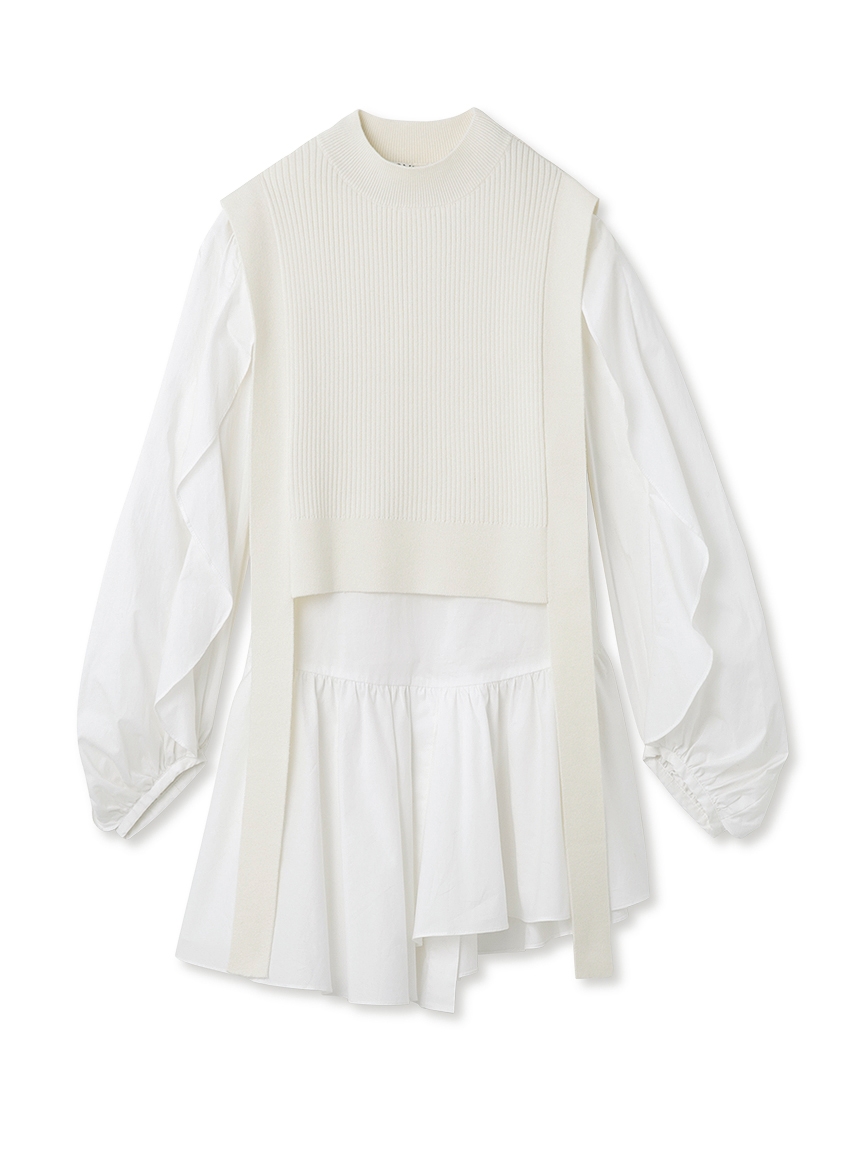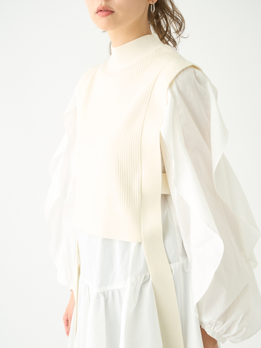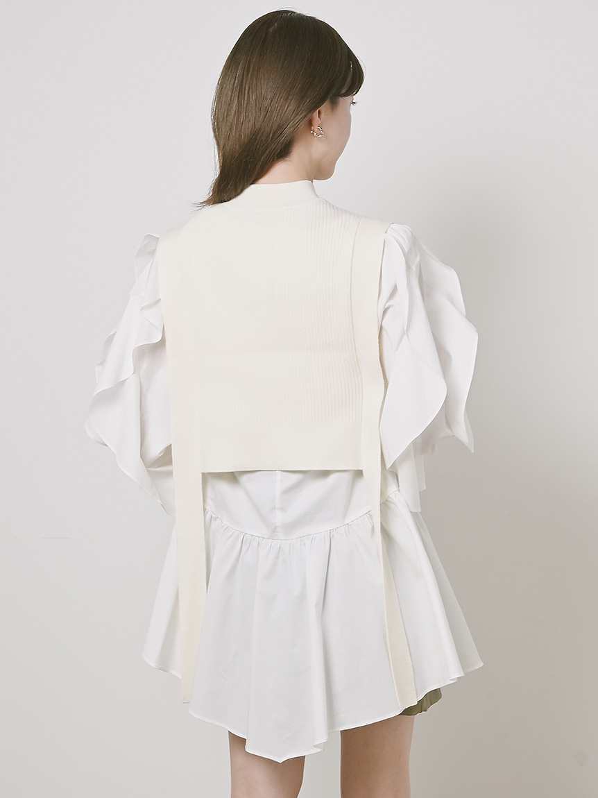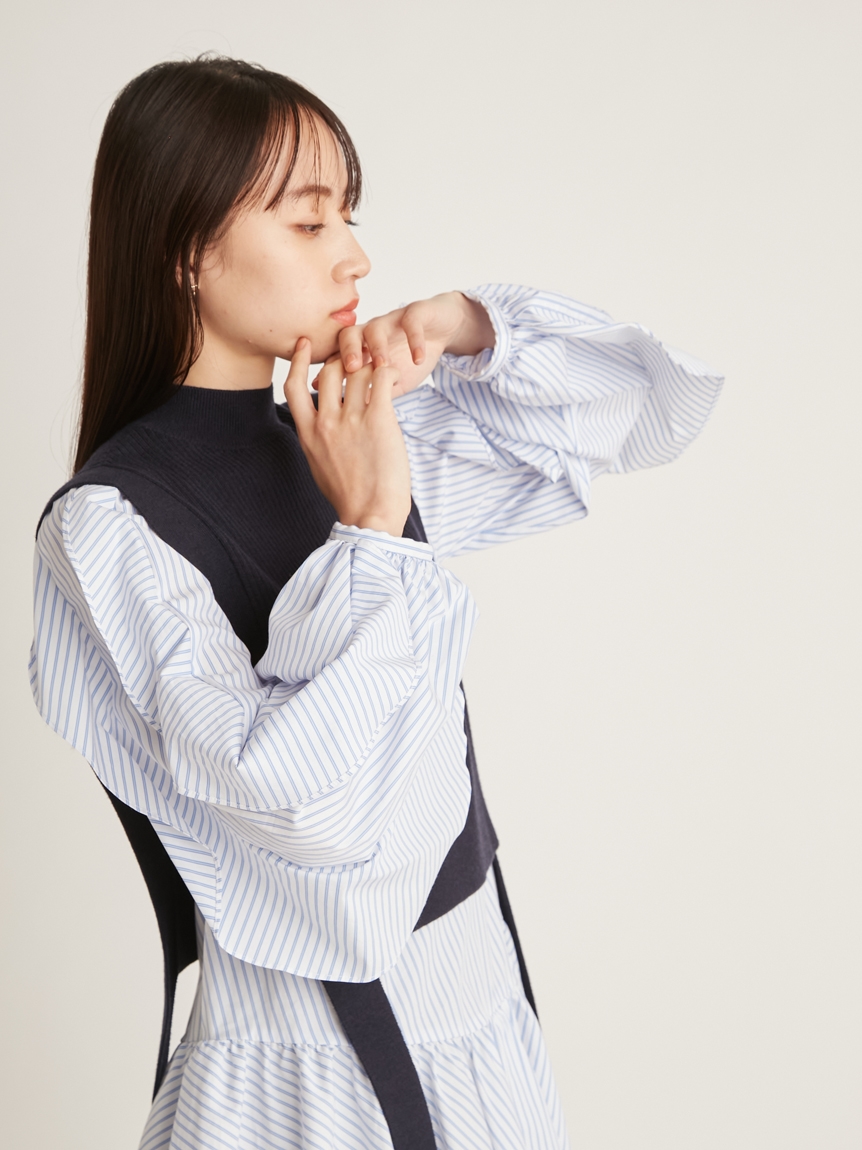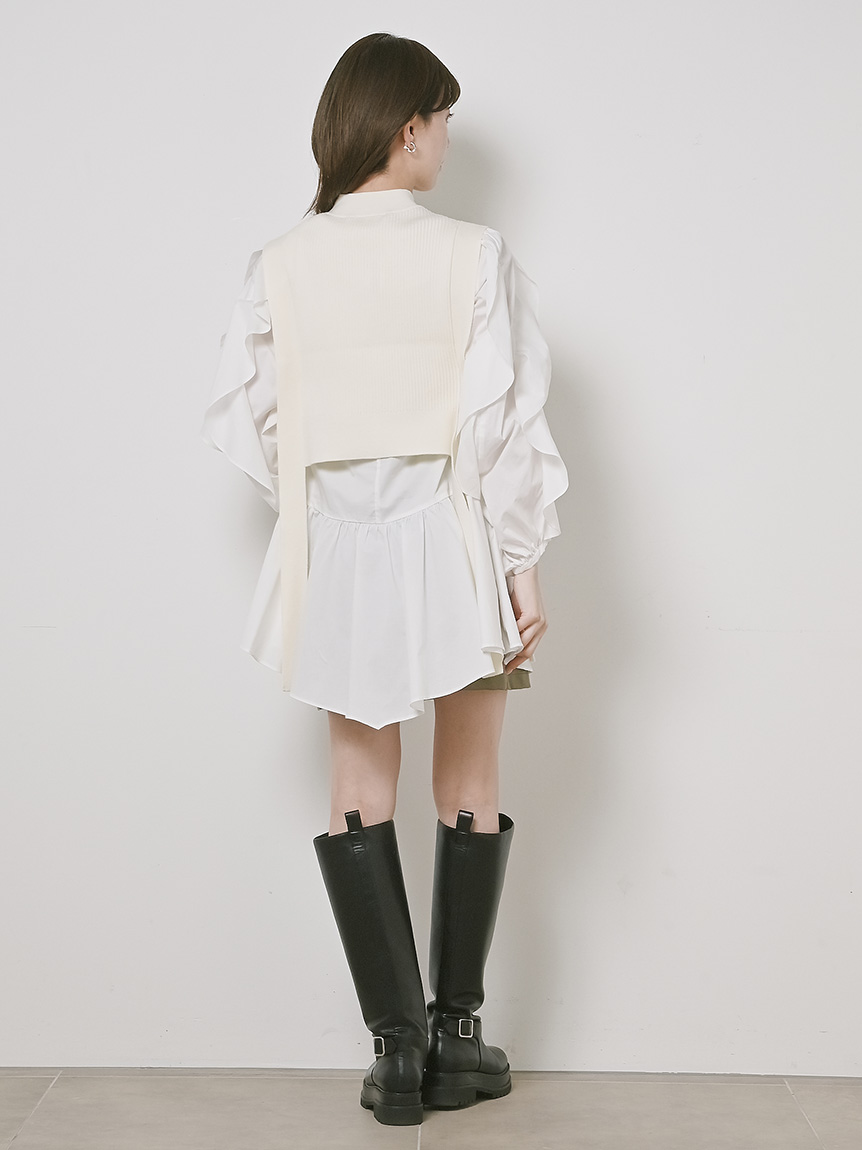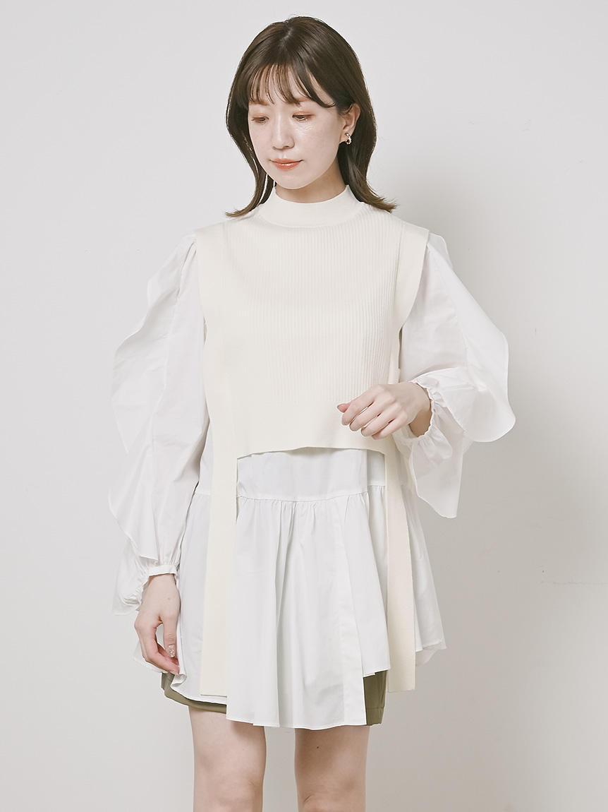 大胆な袖のフリルが目を引くチュニックブラウスにニットベストを組み合わせたセットアイテム。これだけで今年らしいレイヤードスタイルが完成する優秀アイテムです。アシンメトリーなヘムデザインで、フェミニンな中にモードなエッセンスをプラス。それぞれ単品でも活躍してくれるので、コーディネートの幅は一気に広がります。