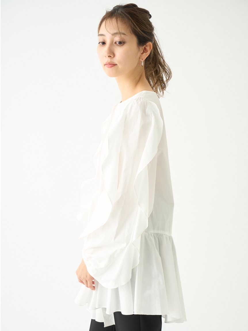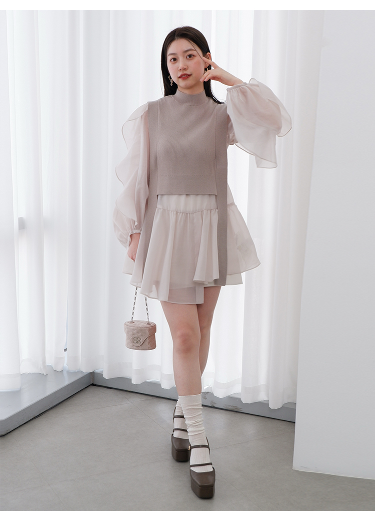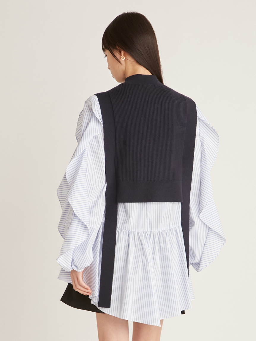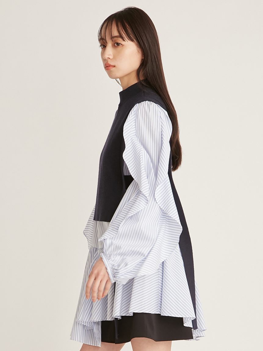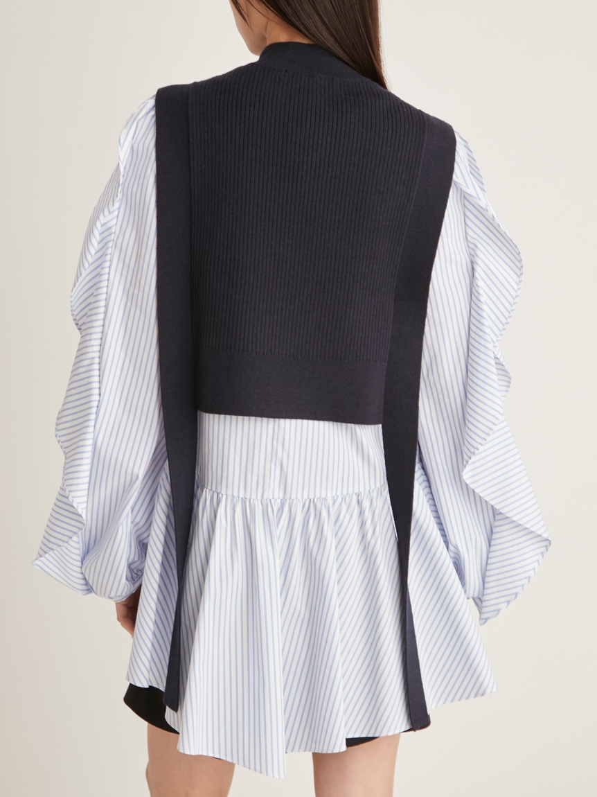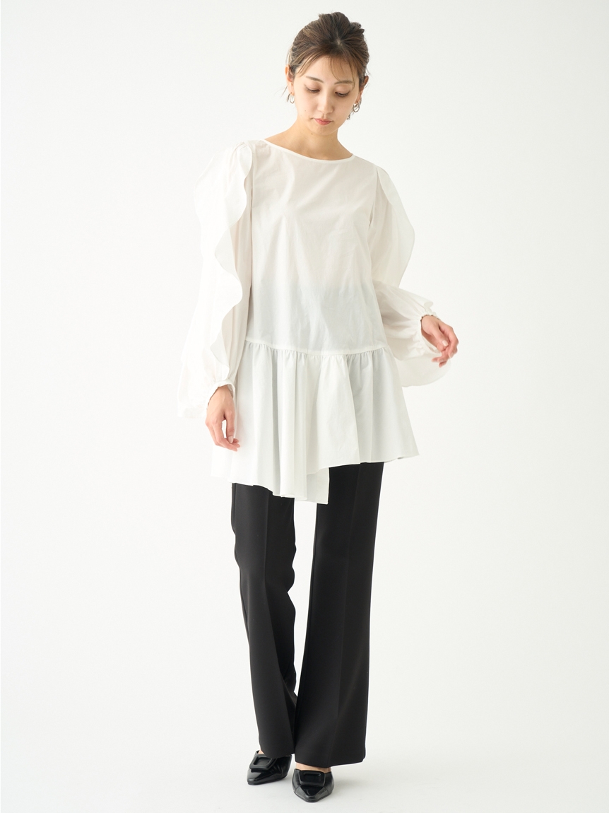 大胆な袖のフリルが目を引くチュニックブラウスにニットベストを組み合わせたセットアイテム。これだけで今年らしいレイヤードスタイルが完成する優秀アイテムです。アシンメトリーなヘムデザインで、フェミニンな中にモードなエッセンスをプラス。それぞれ単品でも活躍してくれるので、コーディネートの幅は一気に広がります。