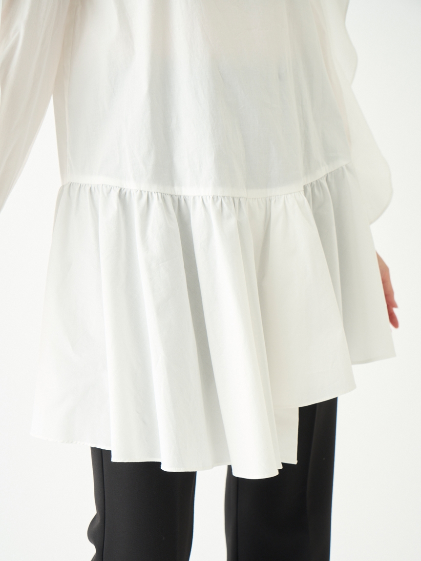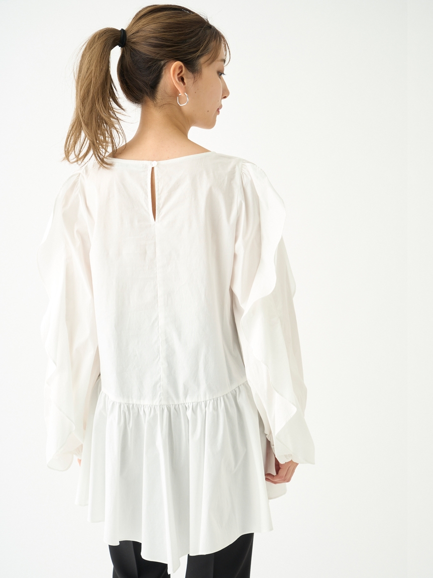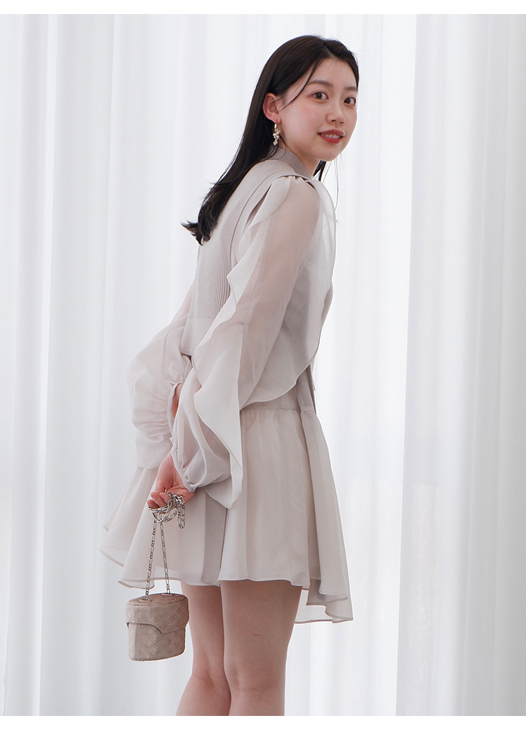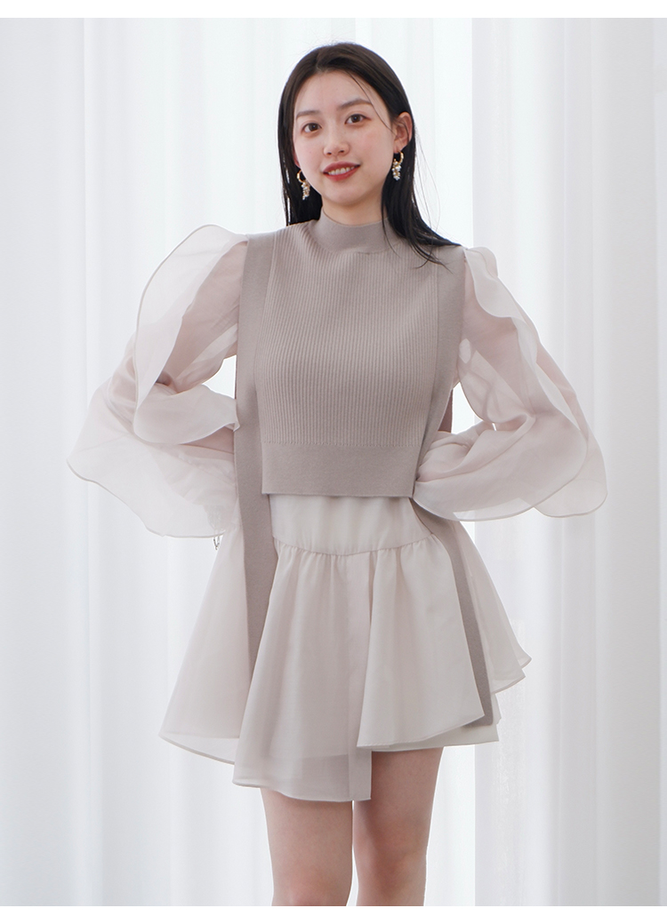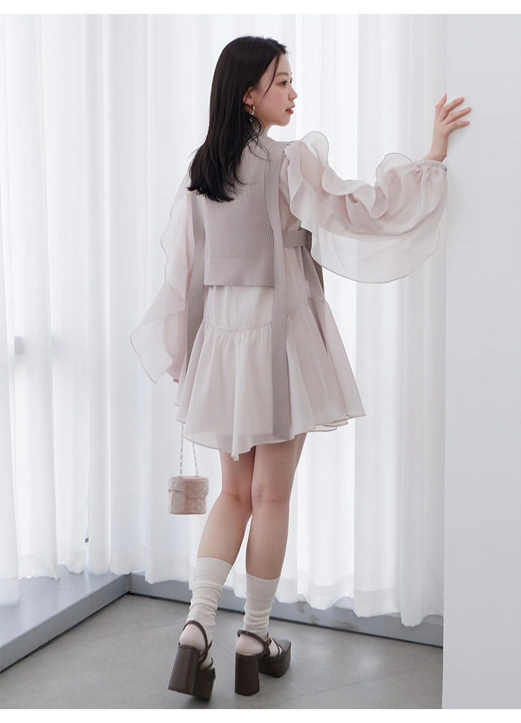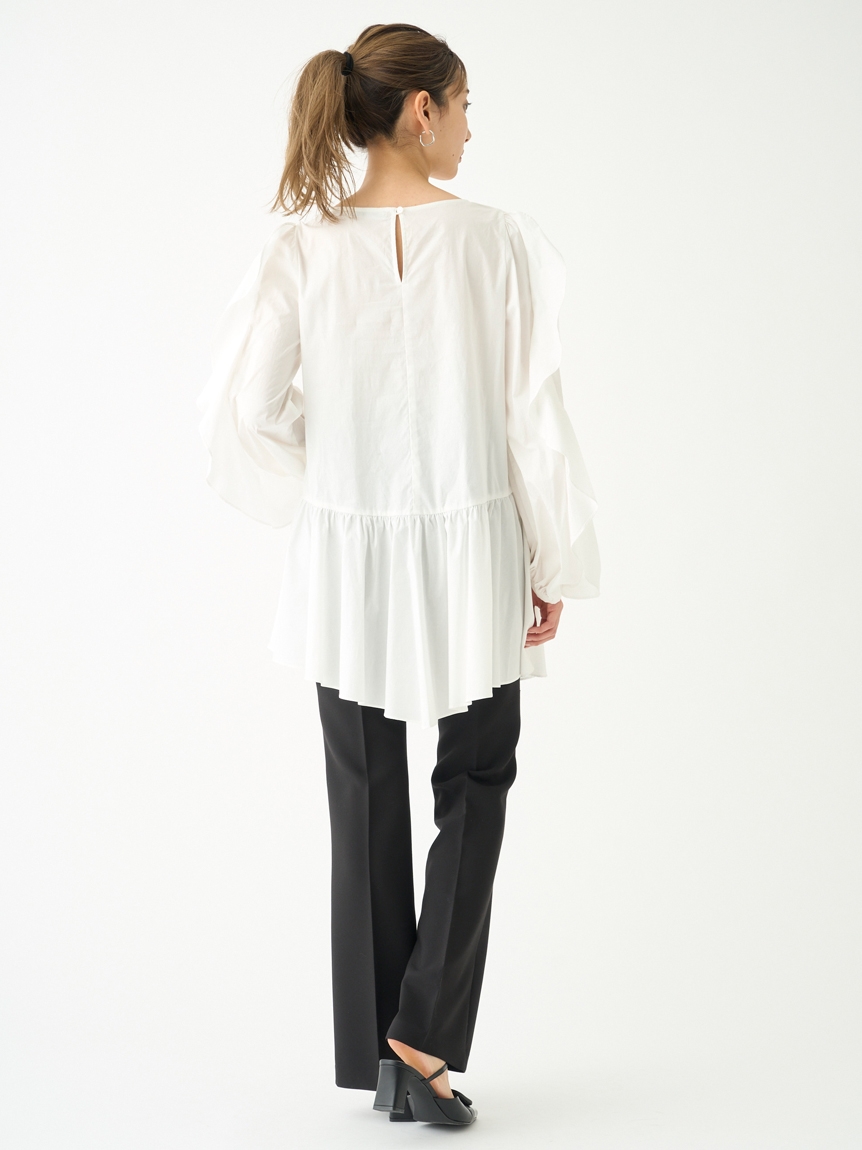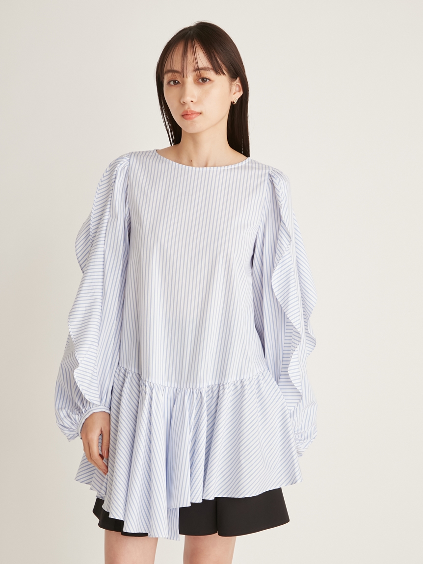 大胆な袖のフリルが目を引くチュニックブラウスにニットベストを組み合わせたセットアイテム。これだけで今年らしいレイヤードスタイルが完成する優秀アイテムです。アシンメトリーなヘムデザインで、フェミニンな中にモードなエッセンスをプラス。それぞれ単品でも活躍してくれるので、コーディネートの幅は一気に広がります。