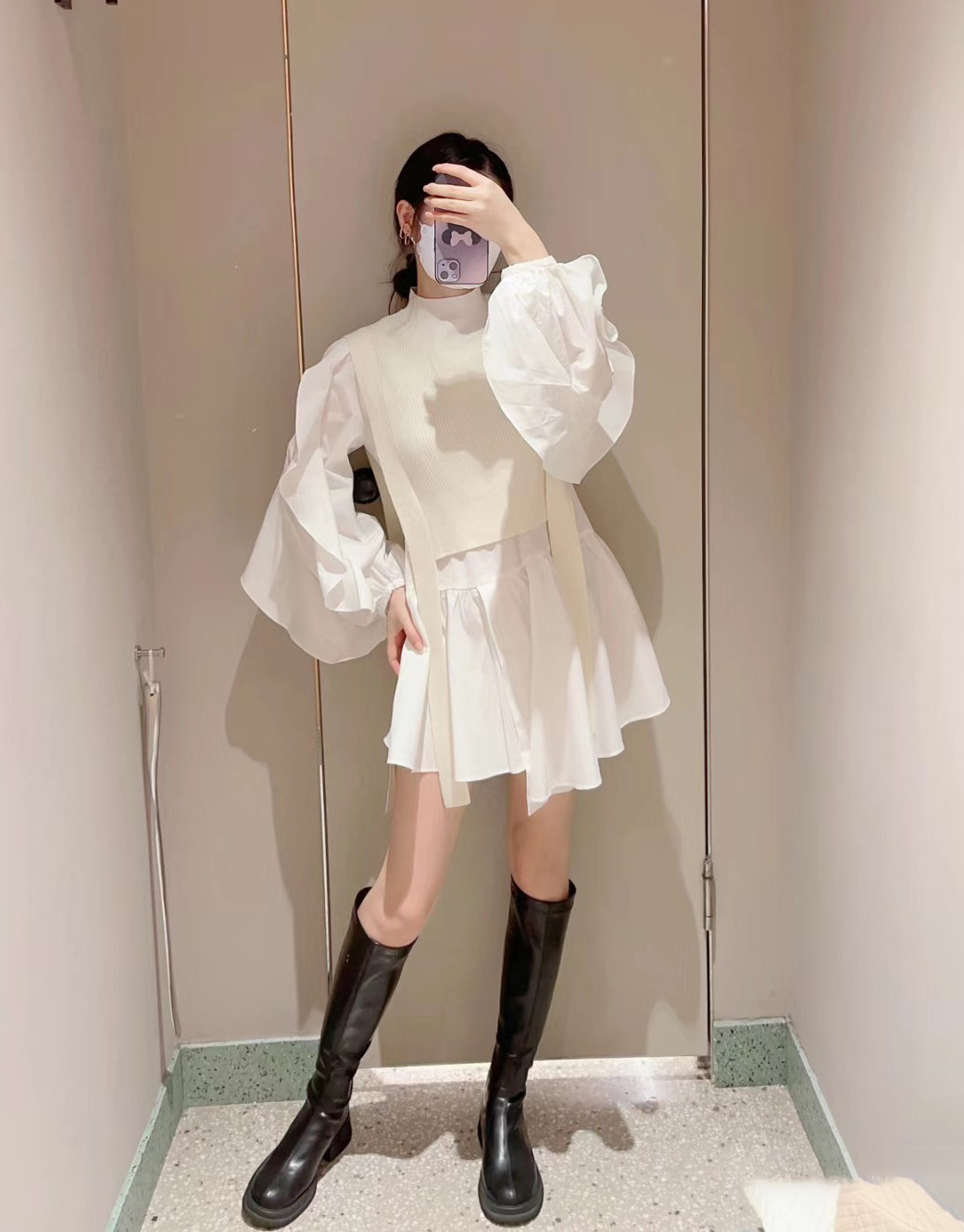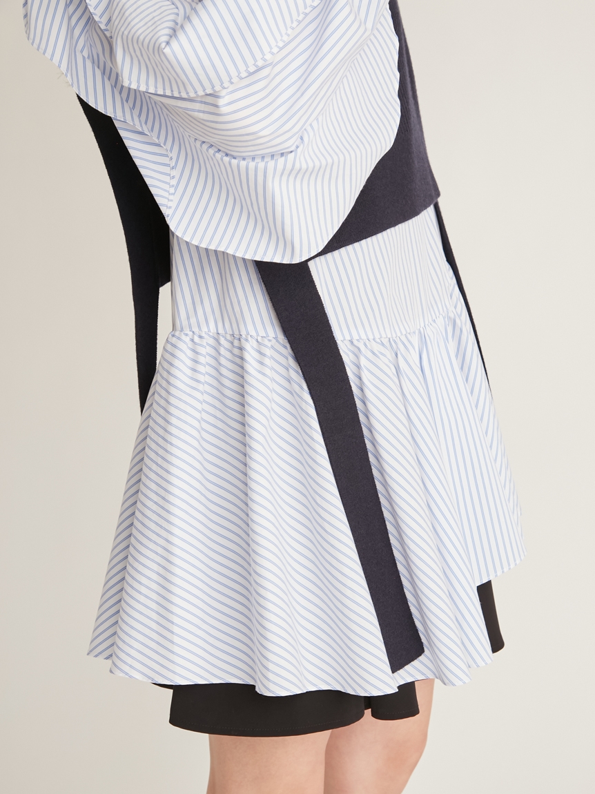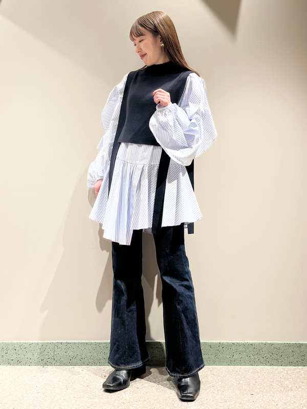 きれいめな質感のリブニットとシンプルなシャツ地を組み合わせました。優しい色合いのアイボリー、ニュアンスカラーのグレーベージュ、バイカラーがモードなネイビーの3色をご用意。