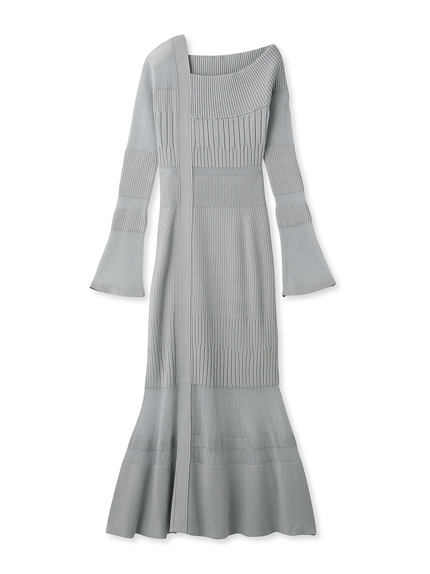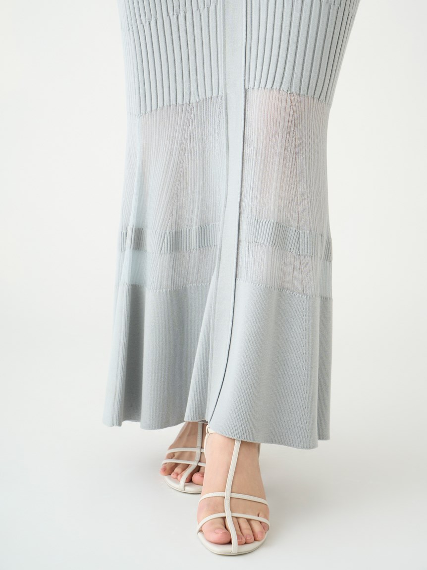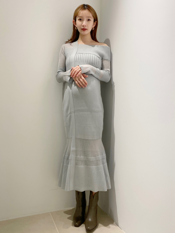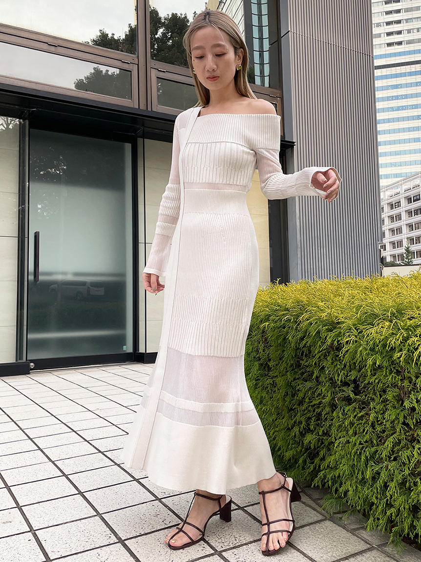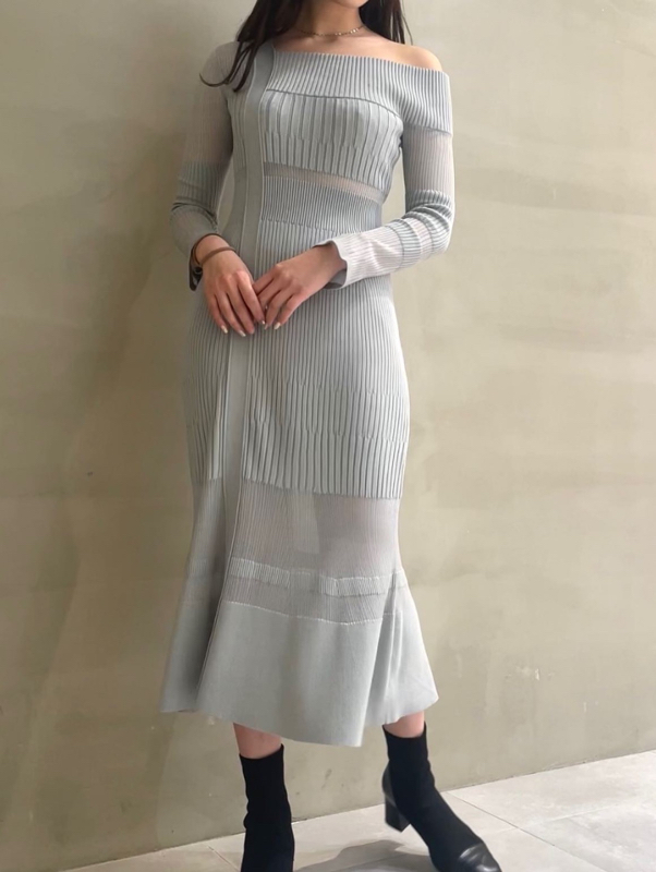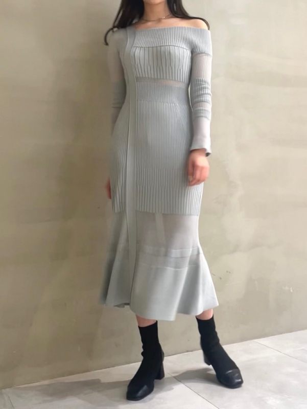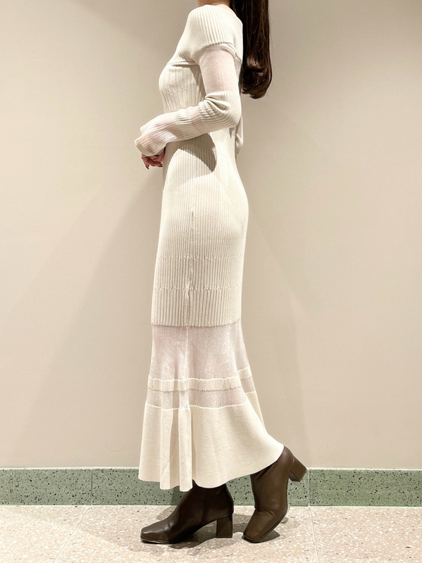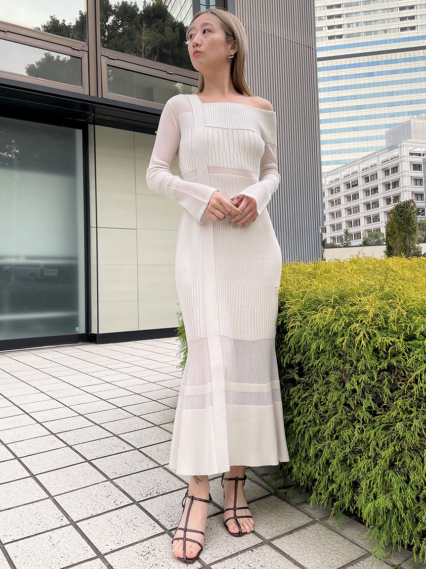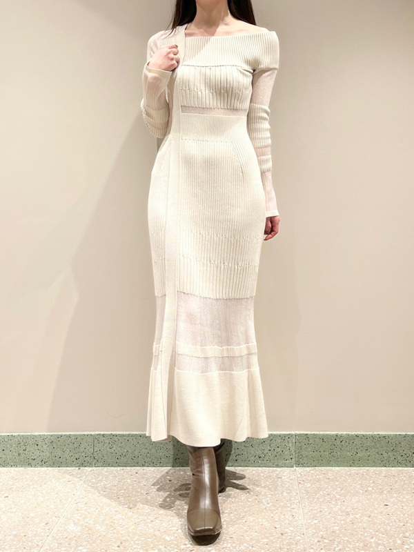 シアーパーツとリブパーツを綺麗なリズムでランダムに繋ぎ合わせたニットワンピース。モード感溢れるデザインで抜群の存在感を放つ今年らしい1着です。程よい透け感と高めの位置からのマーメイドラインで色香漂うルックスに。ボディラインを美しく見せスタイルアップへと導いてくれます。