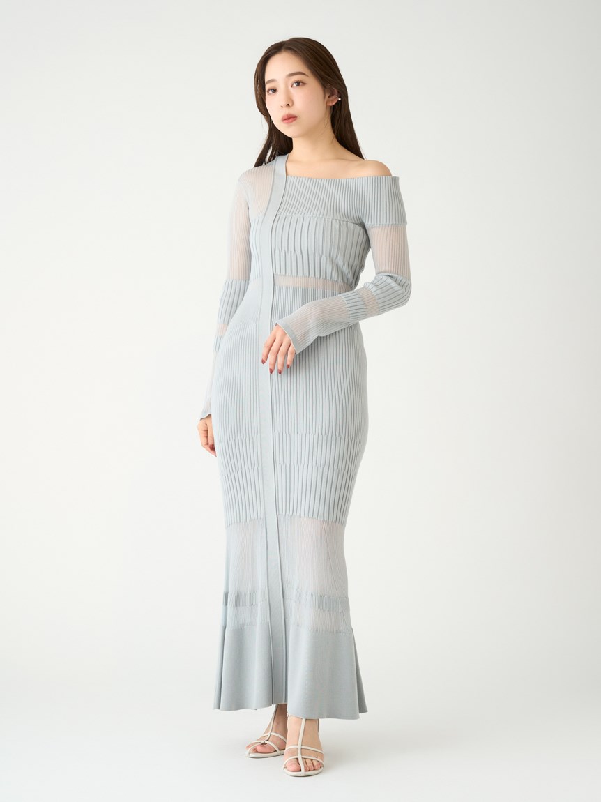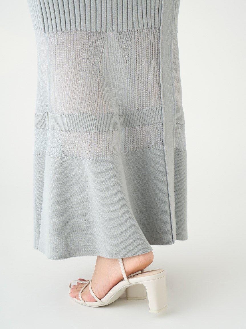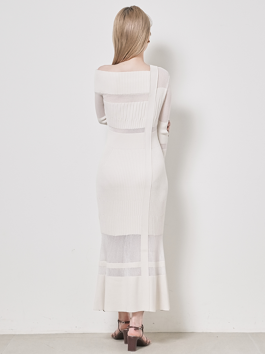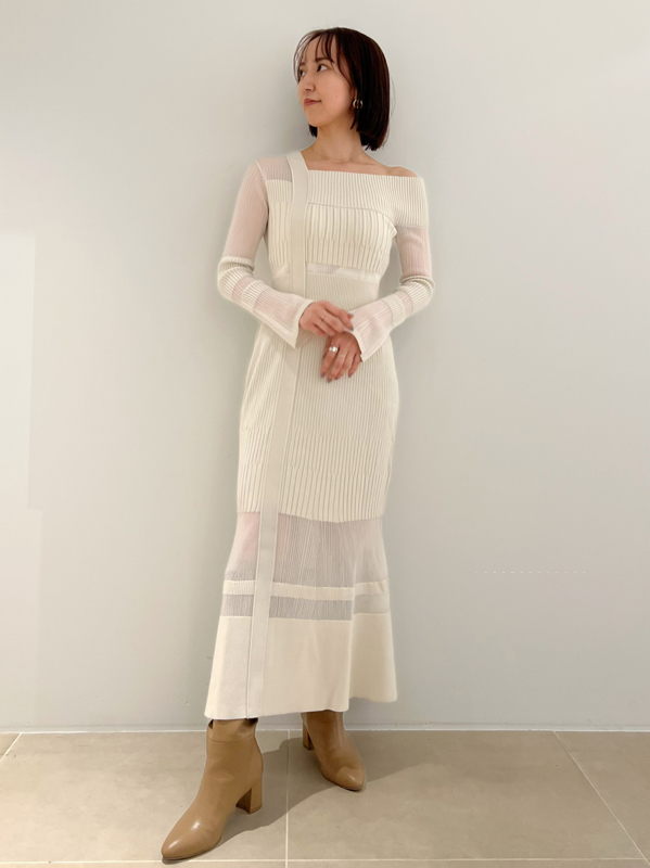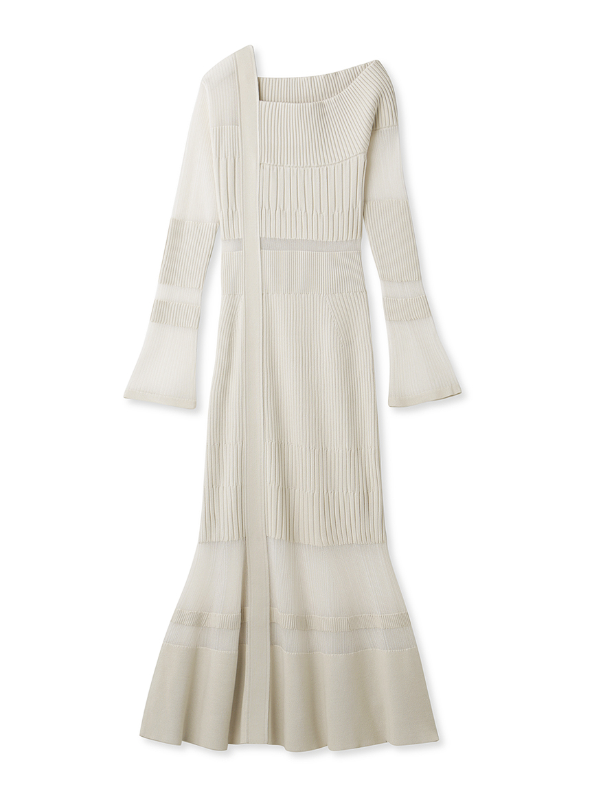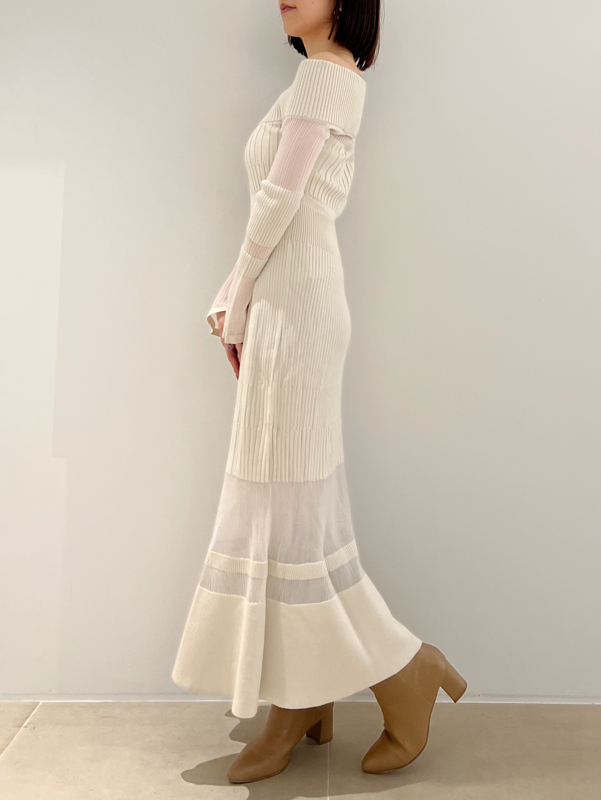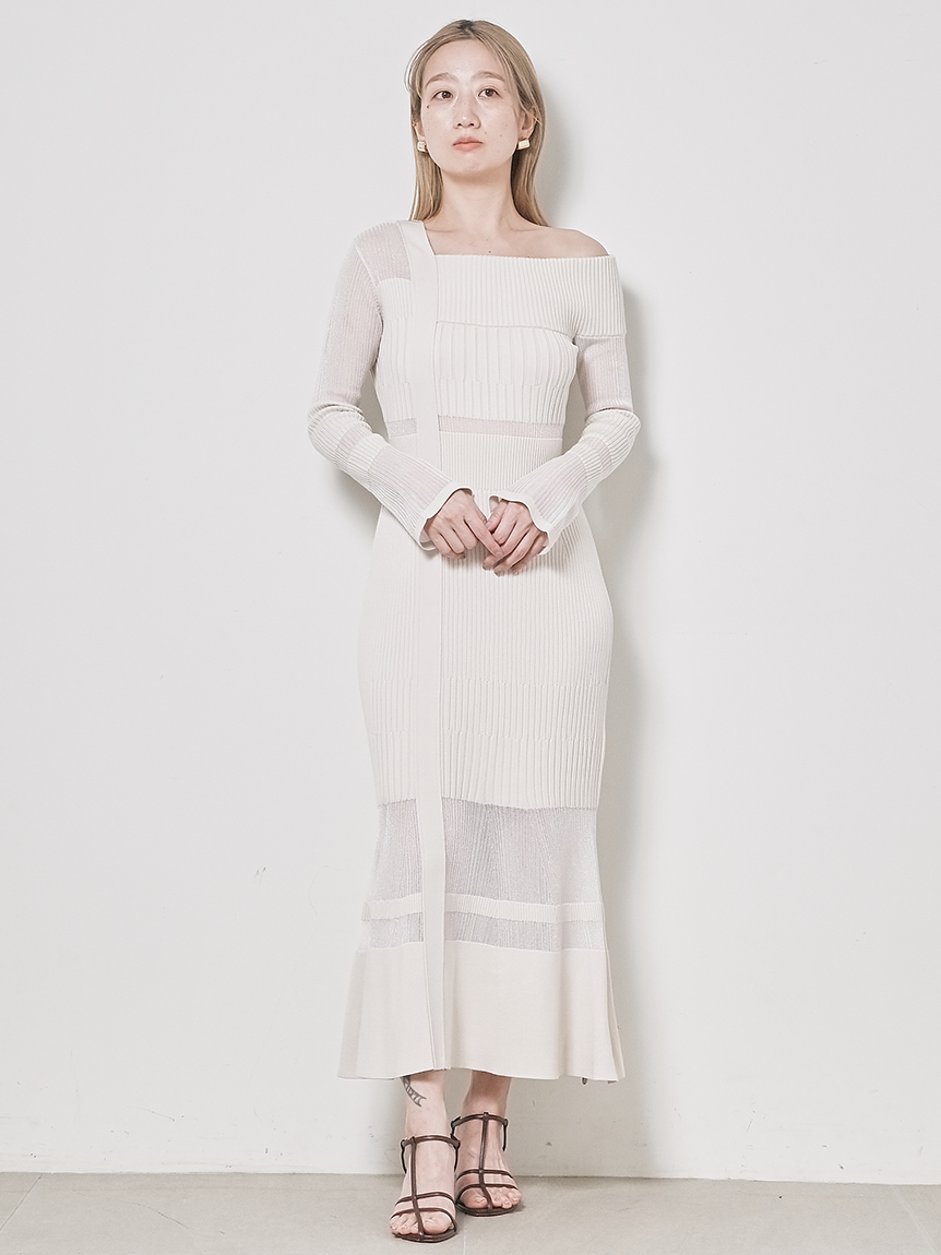 シアーパーツとリブパーツを綺麗なリズムでランダムに繋ぎ合わせたニットワンピース。モード感溢れるデザインで抜群の存在感を放つ今年らしい1着です。程よい透け感と高めの位置からのマーメイドラインで色香漂うルックスに。ボディラインを美しく見せスタイルアップへと導いてくれます。