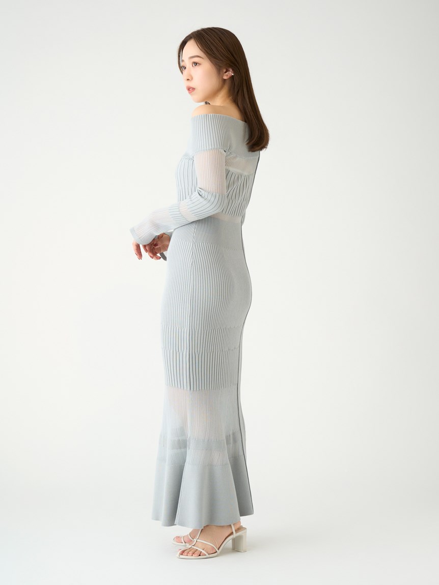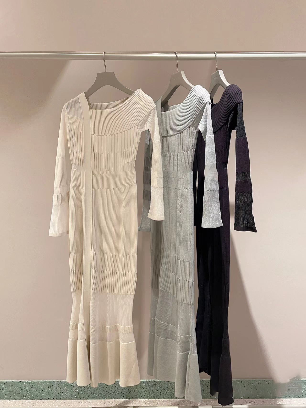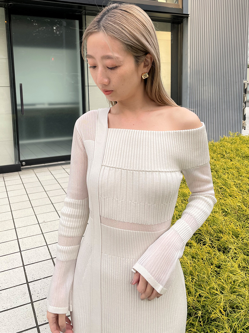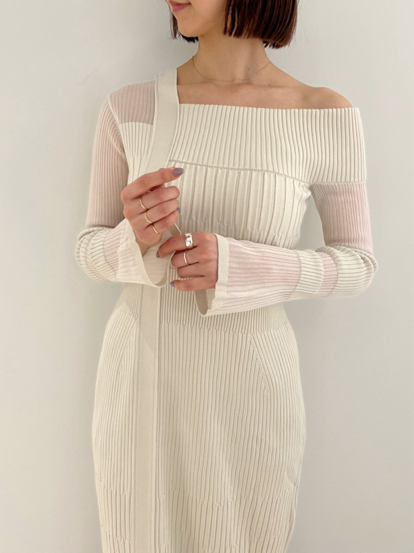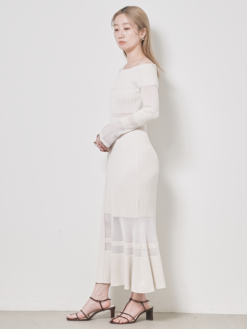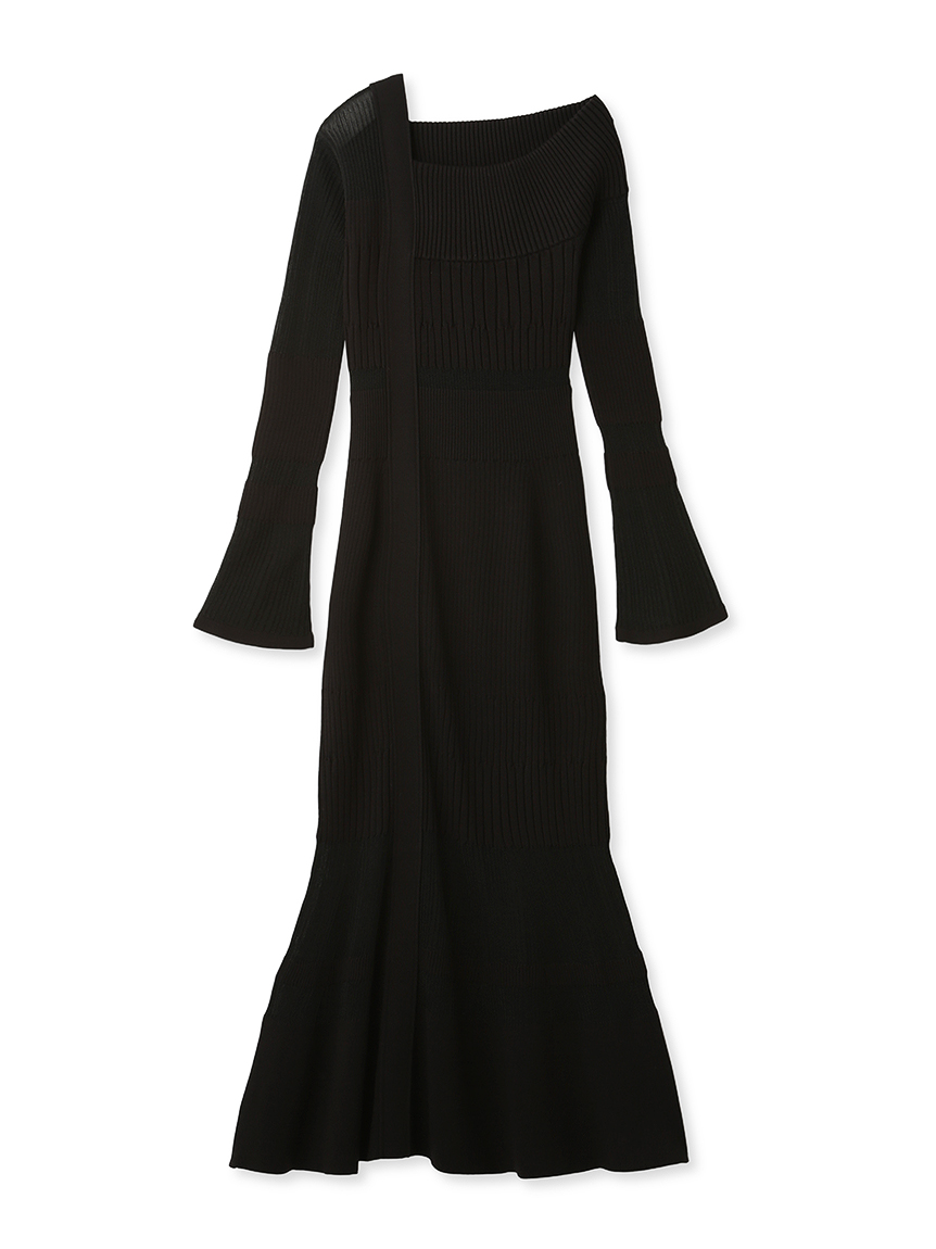 シアーパーツとリブパーツを綺麗なリズムでランダムに繋ぎ合わせたニットワンピース。モード感溢れるデザインで抜群の存在感を放つ今年らしい1着です。程よい透け感と高めの位置からのマーメイドラインで色香漂うルックスに。ボディラインを美しく見せスタイルアップへと導いてくれます。