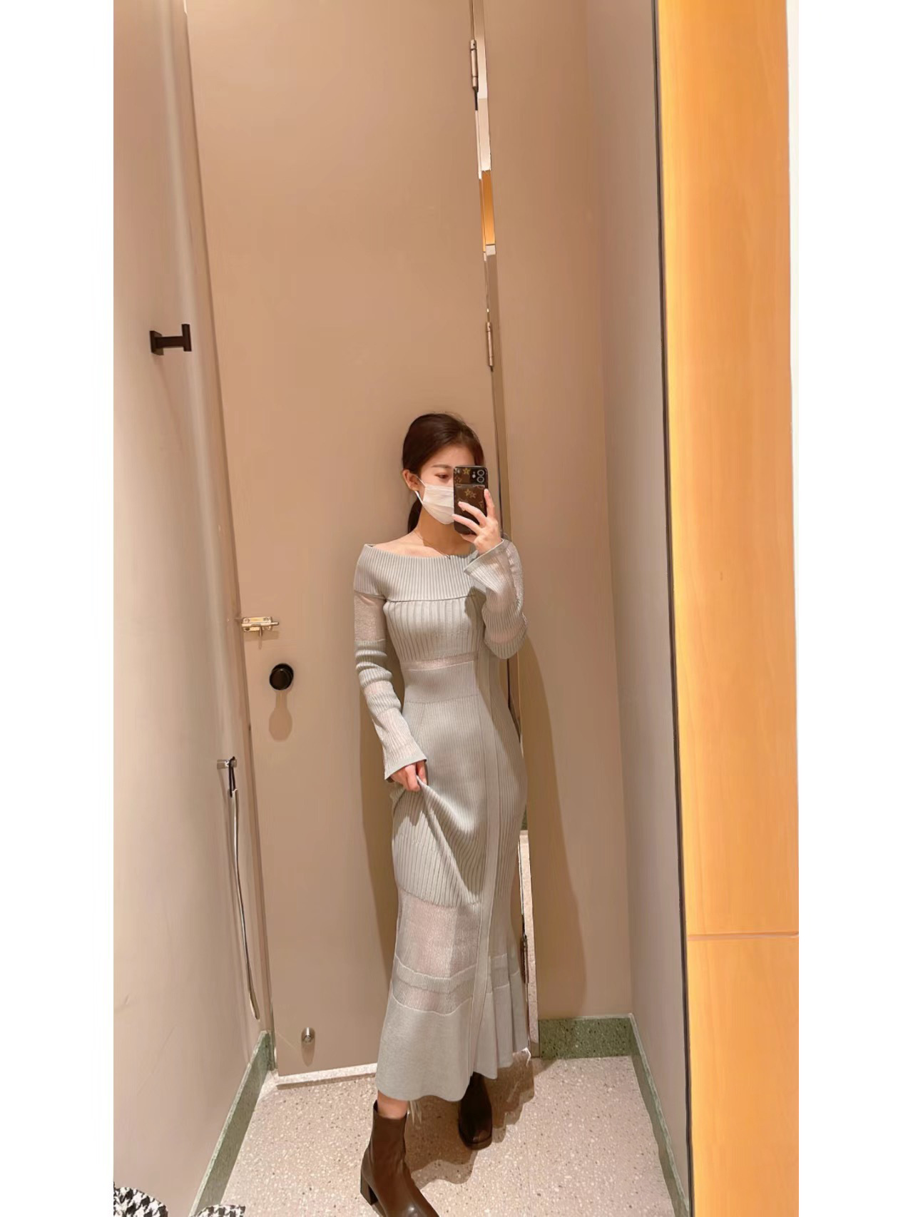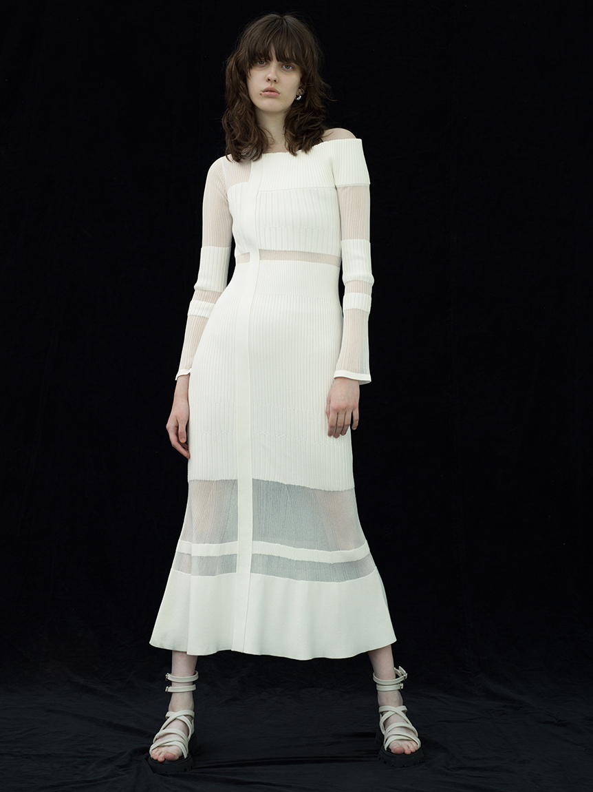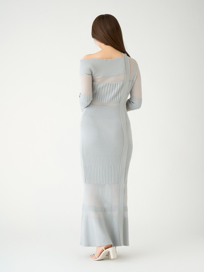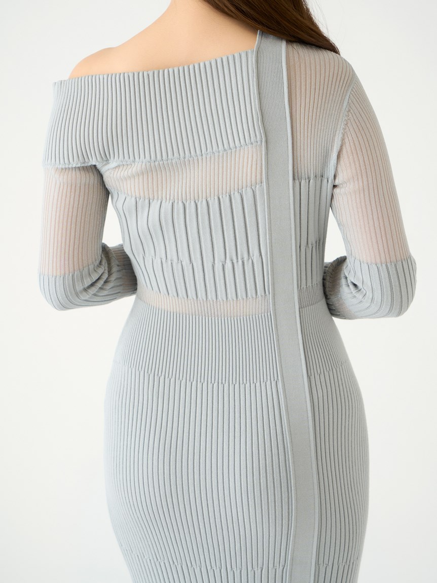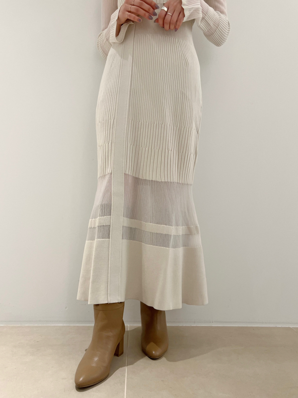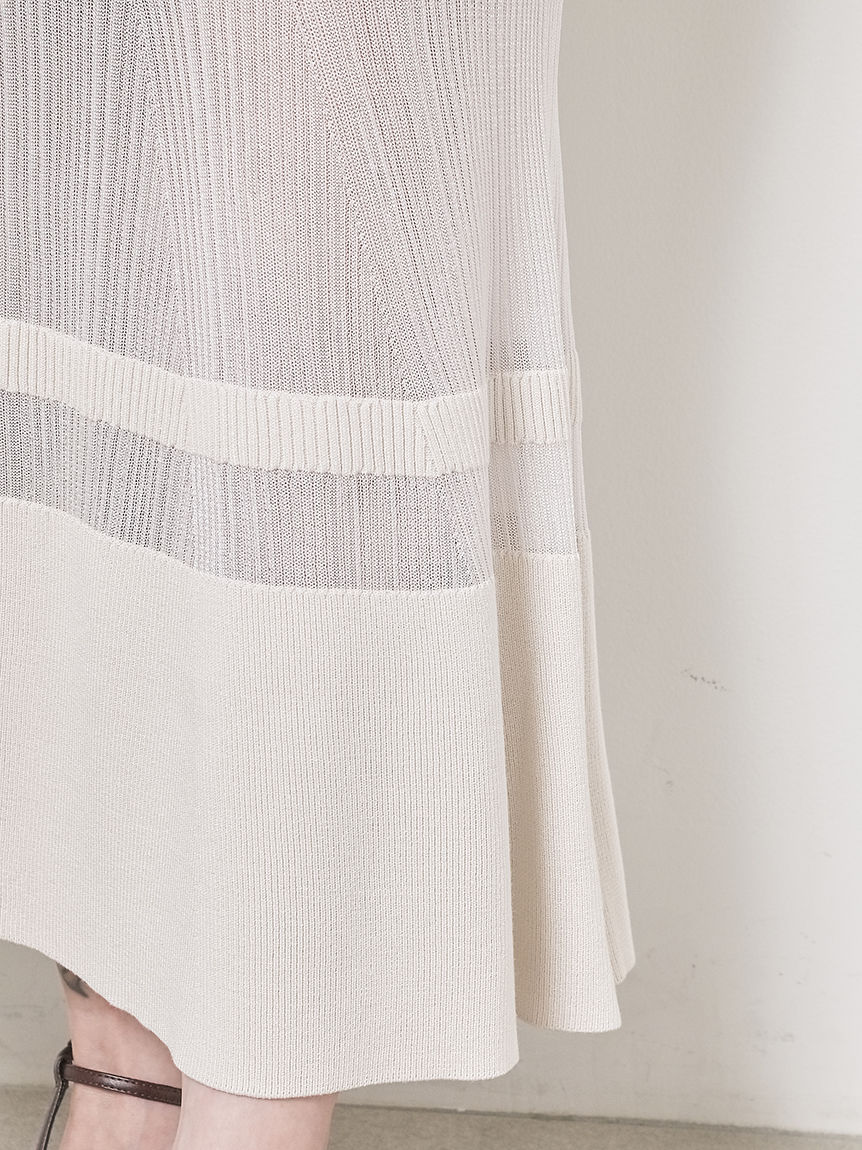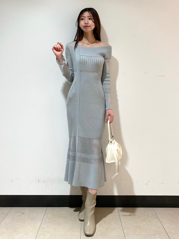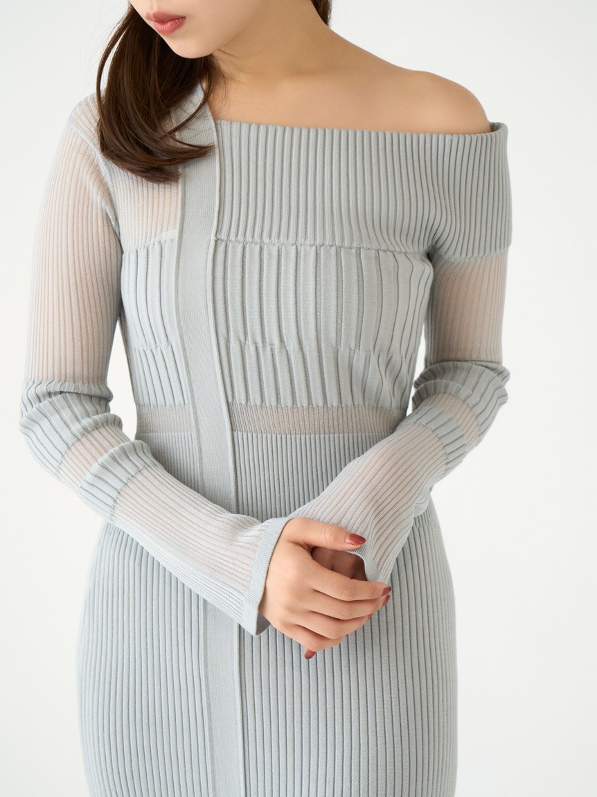 シアーパーツとリブパーツを綺麗なリズムでランダムに繋ぎ合わせたニットワンピース。モード感溢れるデザインで抜群の存在感を放つ今年らしい1着です。程よい透け感と高めの位置からのマーメイドラインで色香漂うルックスに。ボディラインを美しく見せスタイルアップへと導いてくれます。
