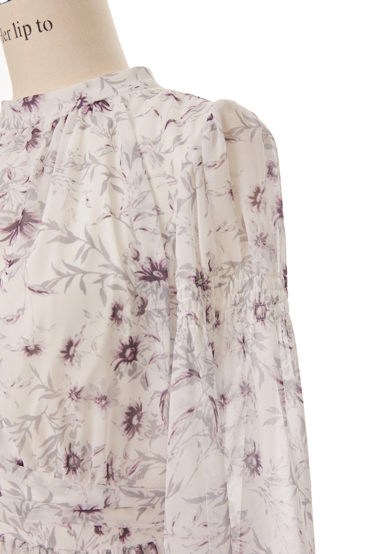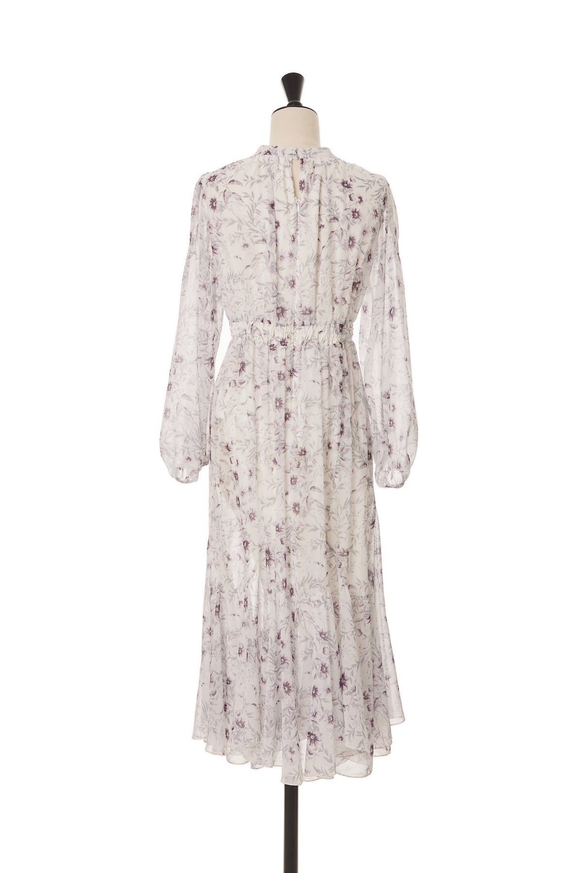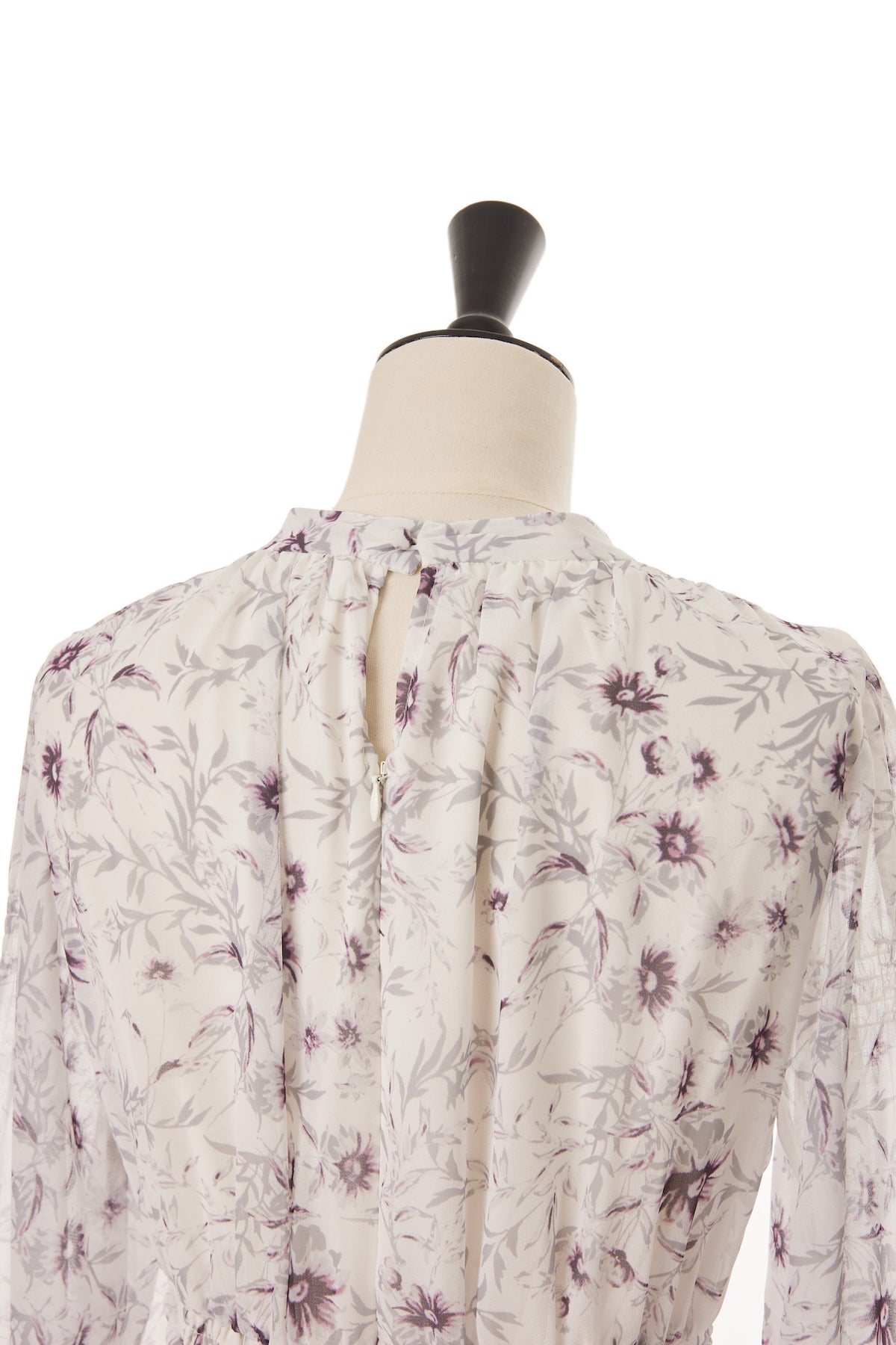 首元はスタンドカラーを配し、胸元にはフロントからバストトップに掛けてギャザーを施すことで上品な立体感を演出。