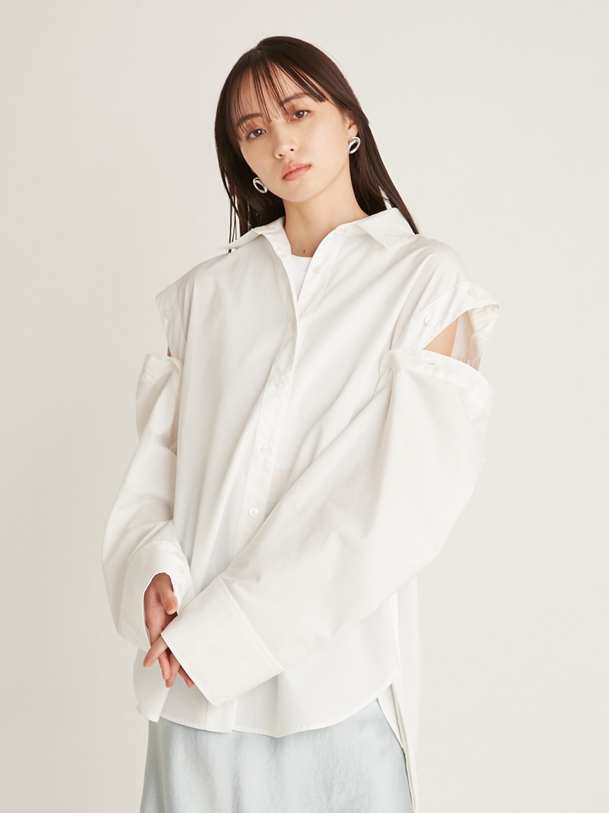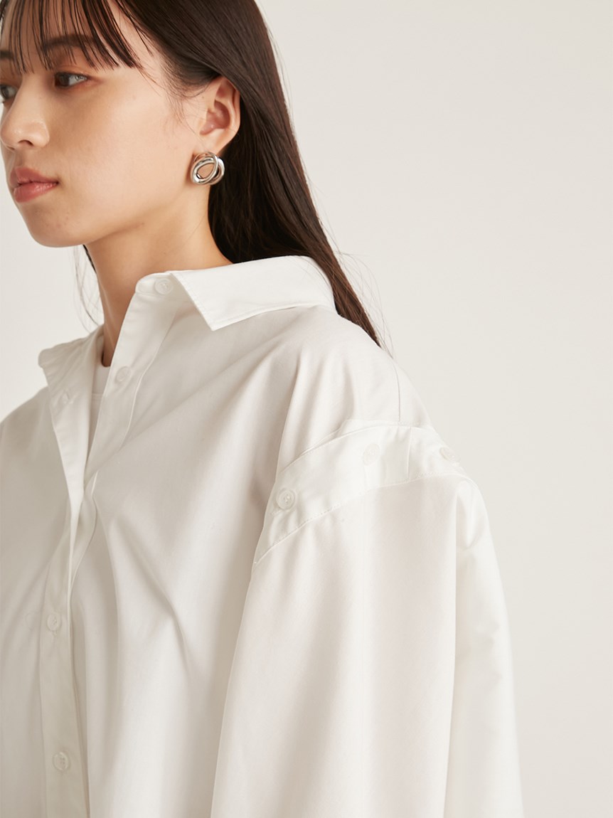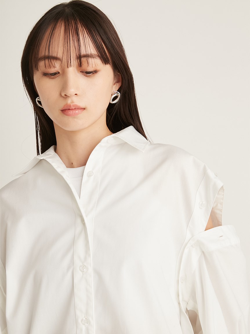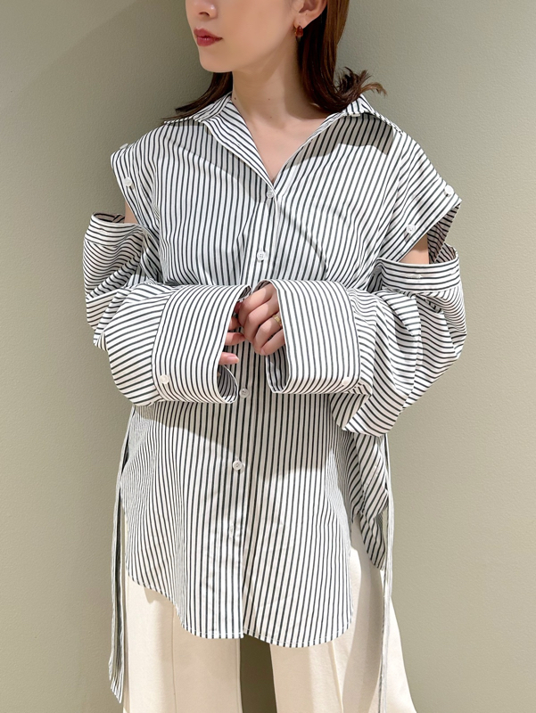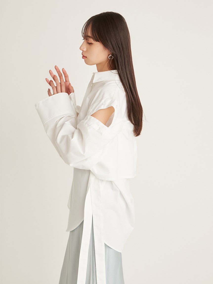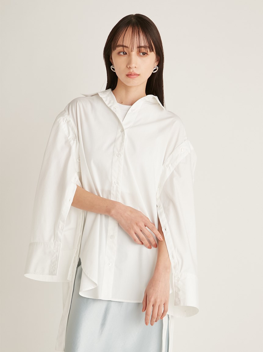 人気の2WAYシャツがアップグレードして登場。袖下にスリットと釦を備え、開閉してトレンドの肌見せができるデザインに。また、ストレート状の袖カフスの奥に釦をもう1つプラスし、袖を畳んでその釦で留めると、普通のブラウスのような細めのシルエットにもアレンジできるようにしています。ボレロの留め位置も落ち感が出るように設定し、より様々なスタイルが楽しめるアイテムへと仕上げました。