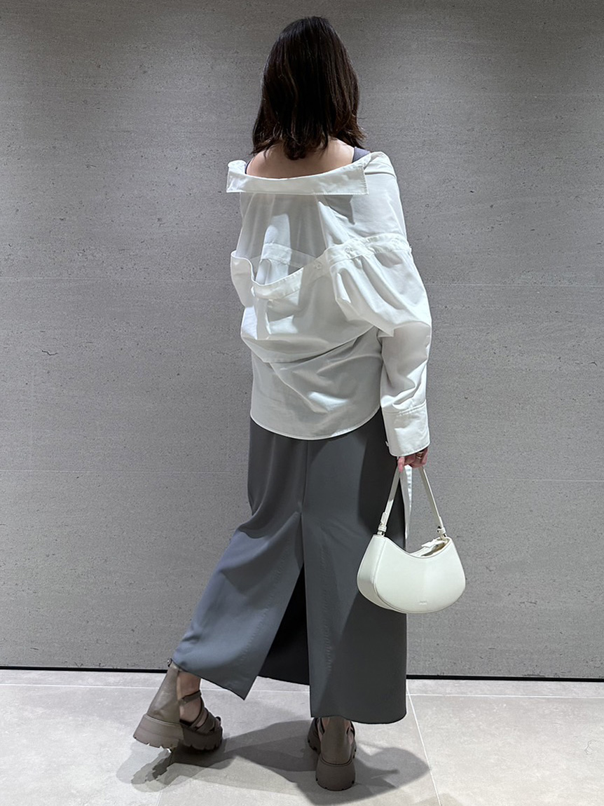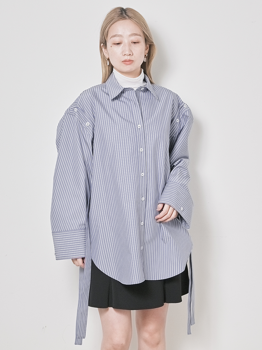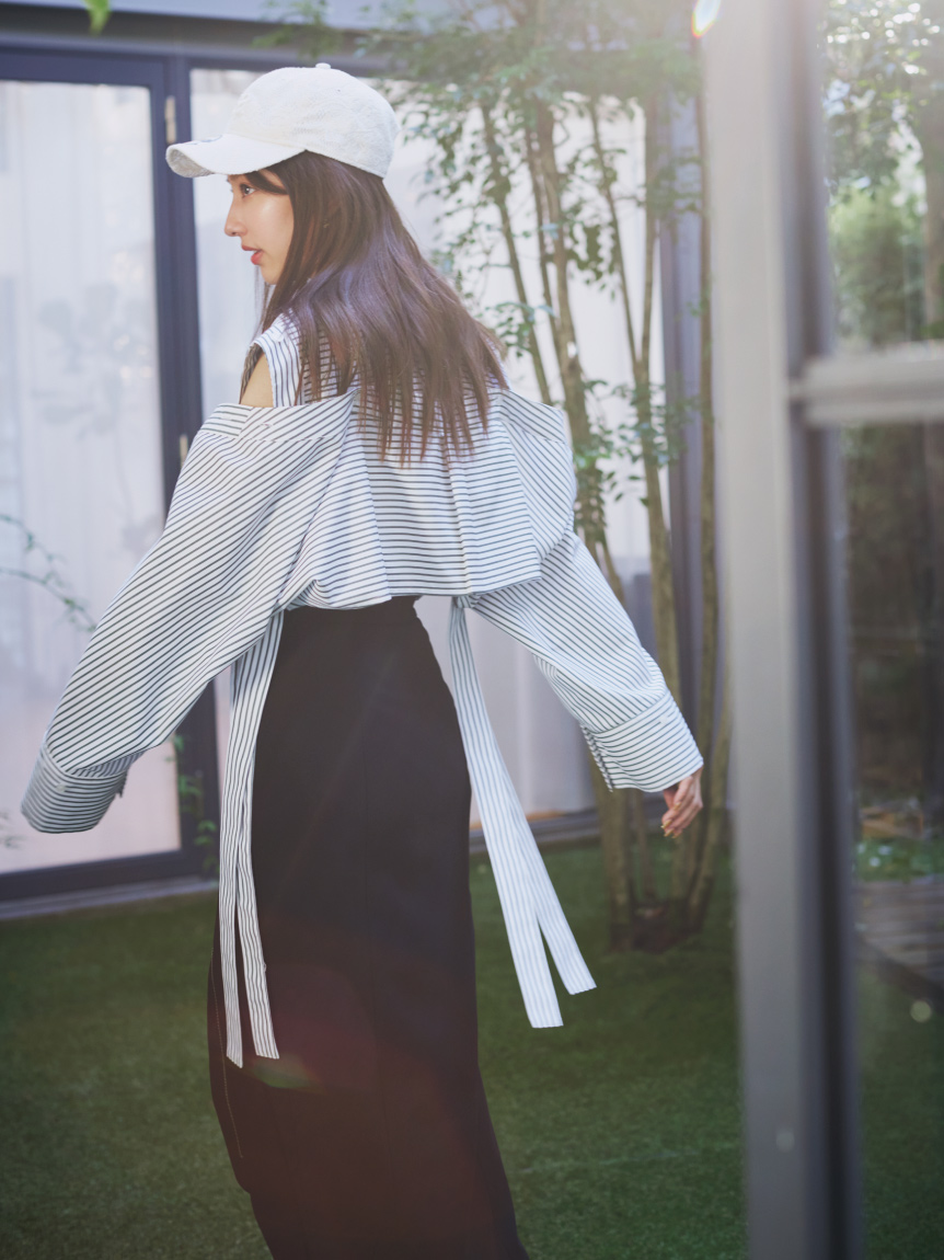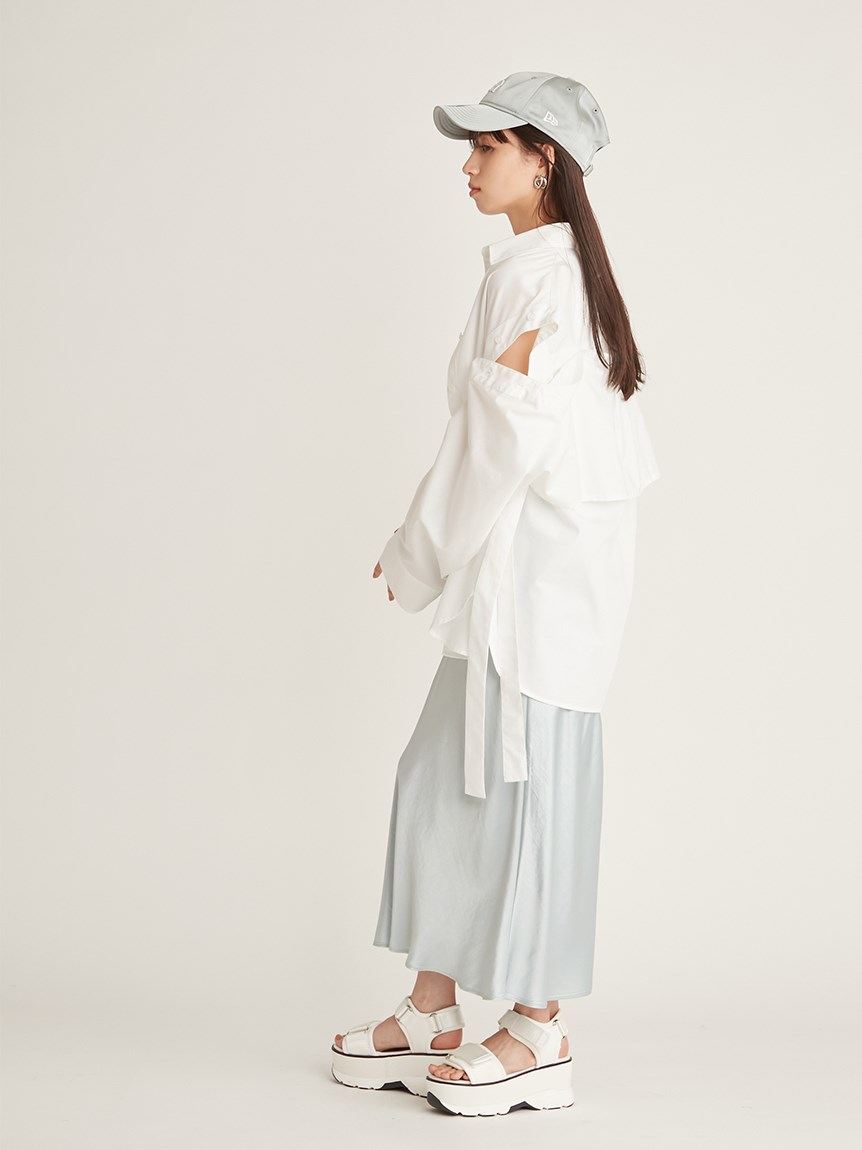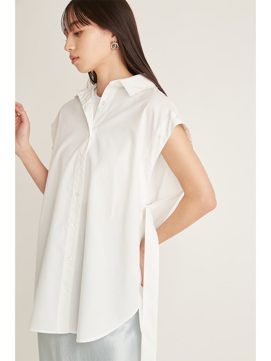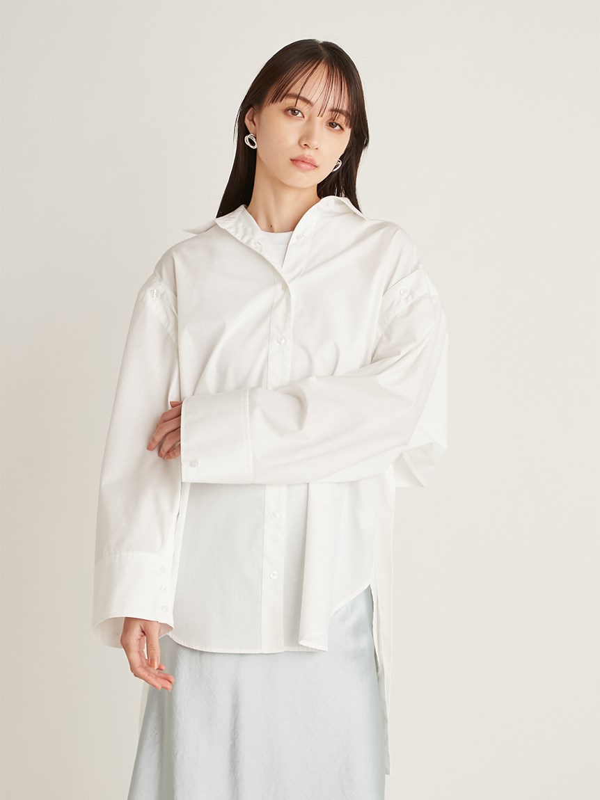 人気の2WAYシャツがアップグレードして登場。袖下にスリットと釦を備え、開閉してトレンドの肌見せができるデザインに。また、ストレート状の袖カフスの奥に釦をもう1つプラスし、袖を畳んでその釦で留めると、普通のブラウスのような細めのシルエットにもアレンジできるようにしています。ボレロの留め位置も落ち感が出るように設定し、より様々なスタイルが楽しめるアイテムへと仕上げました。