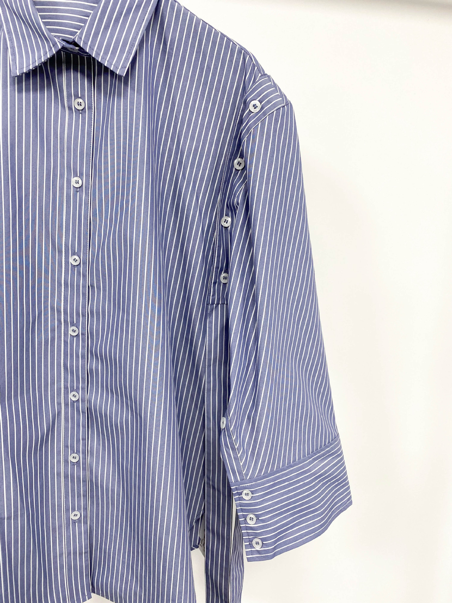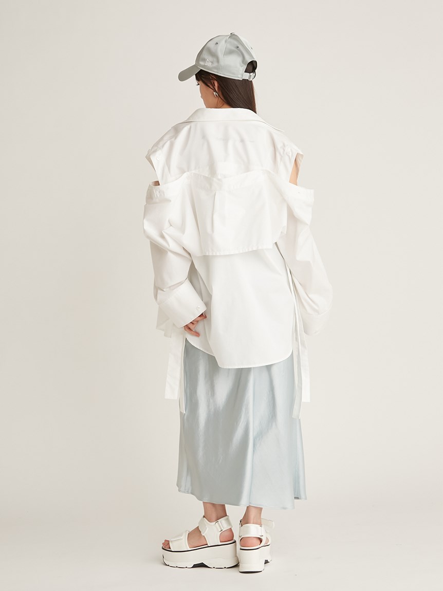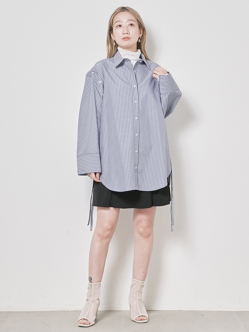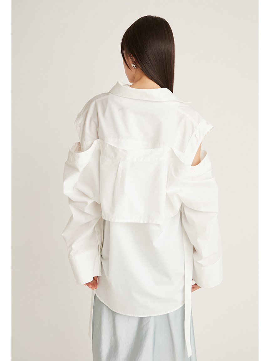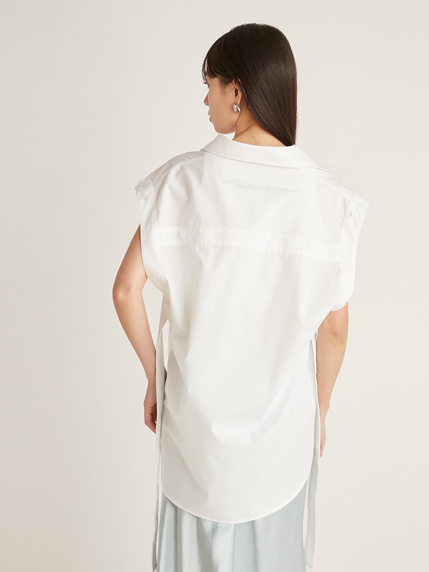 人気の2WAYシャツがアップグレードして登場。袖下にスリットと釦を備え、開閉してトレンドの肌見せができるデザインに。また、ストレート状の袖カフスの奥に釦をもう1つプラスし、袖を畳んでその釦で留めると、普通のブラウスのような細めのシルエットにもアレンジできるようにしています。ボレロの留め位置も落ち感が出るように設定し、より様々なスタイルが楽しめるアイテムへと仕上げました。