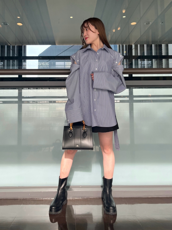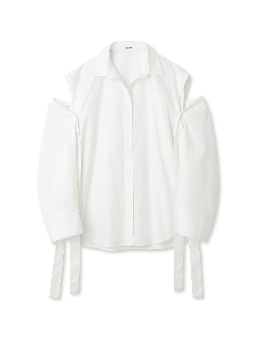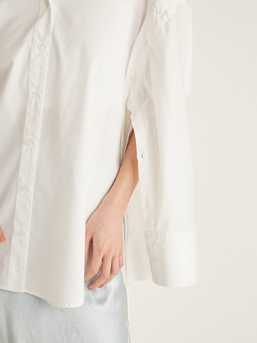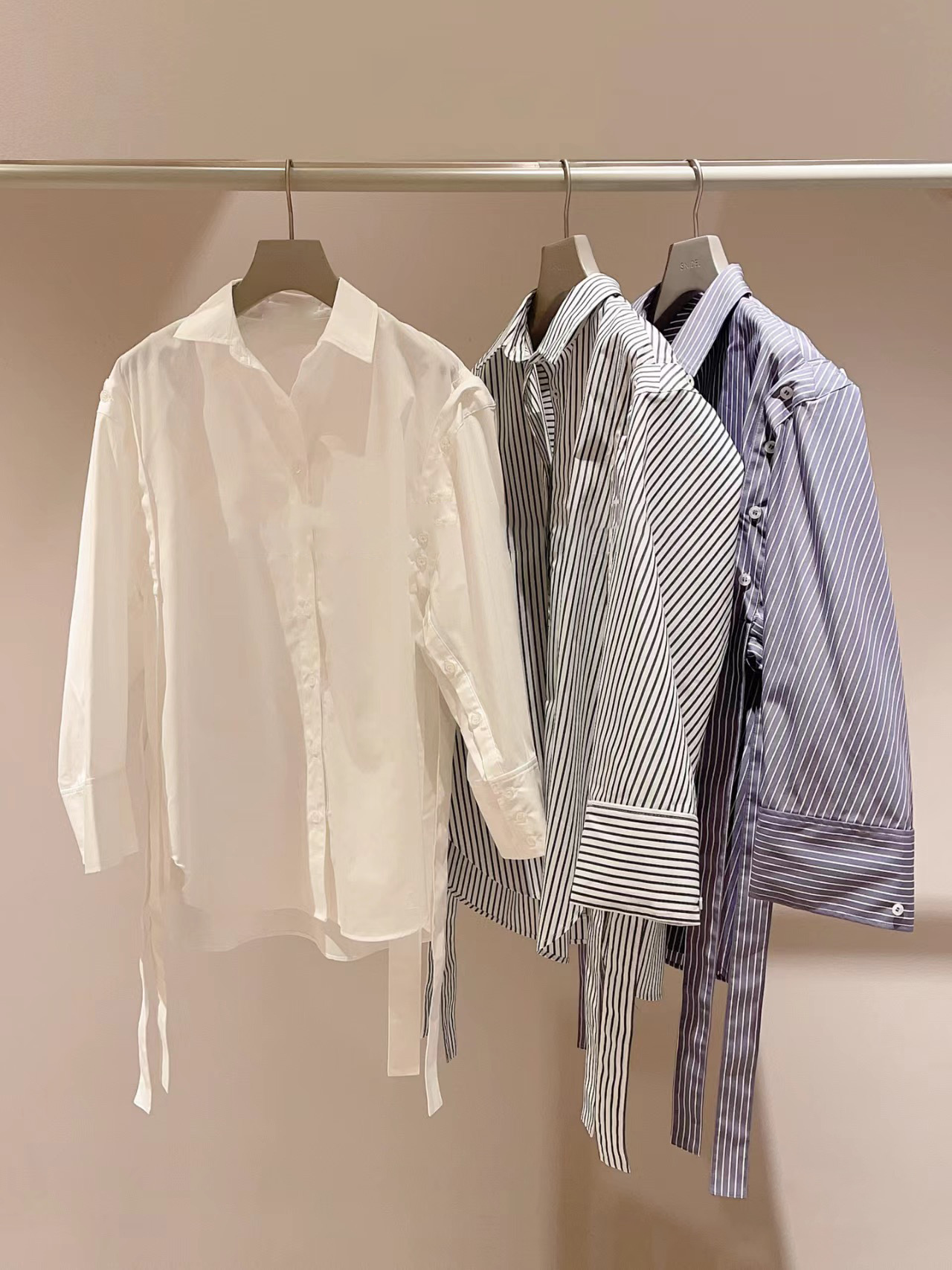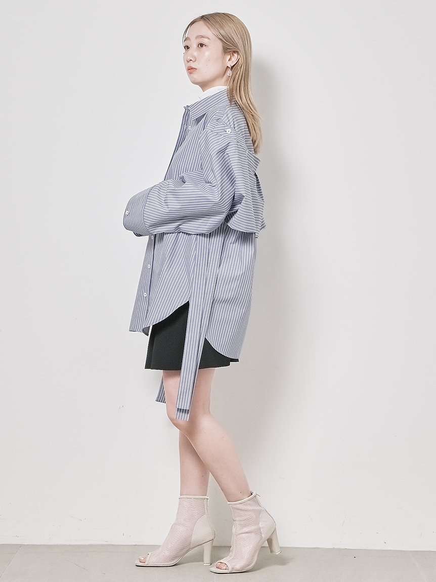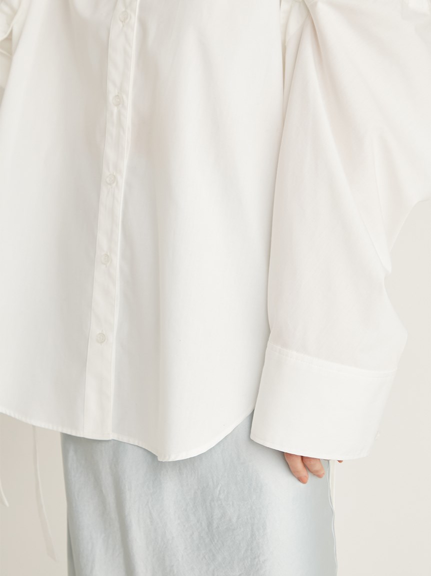 人気の2WAYシャツがアップグレードして登場。袖下にスリットと釦を備え、開閉してトレンドの肌見せができるデザインに。また、ストレート状の袖カフスの奥に釦をもう1つプラスし、袖を畳んでその釦で留めると、普通のブラウスのような細めのシルエットにもアレンジできるようにしています。ボレロの留め位置も落ち感が出るように設定し、より様々なスタイルが楽しめるアイテムへと仕上げました。