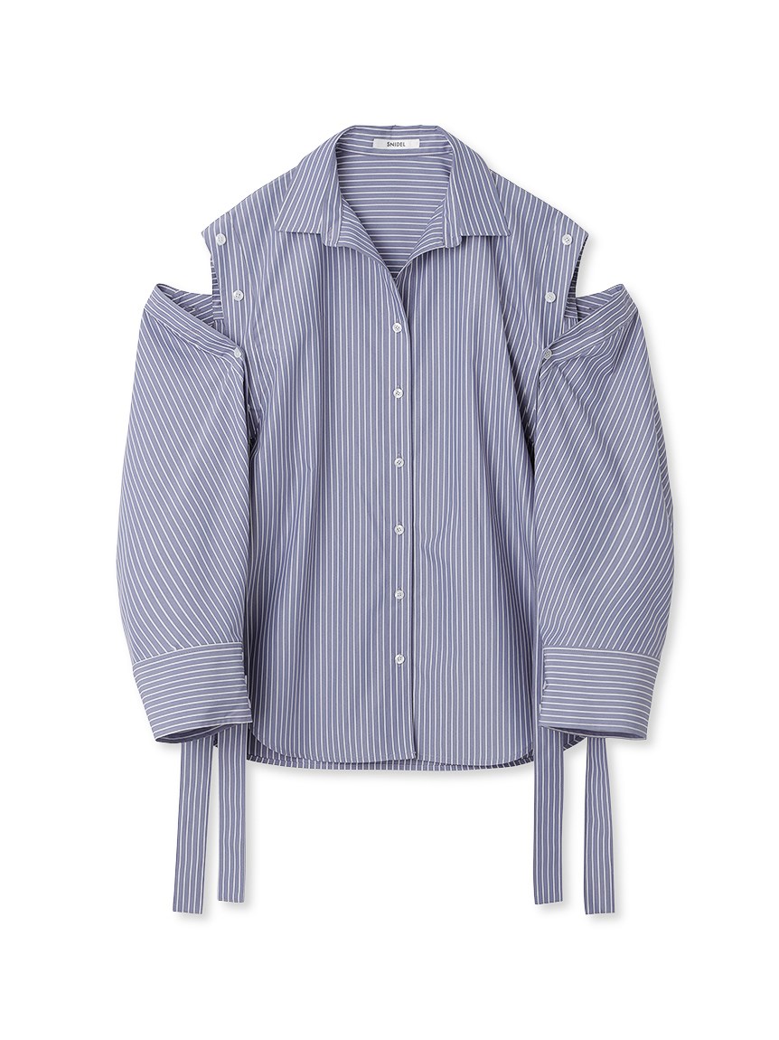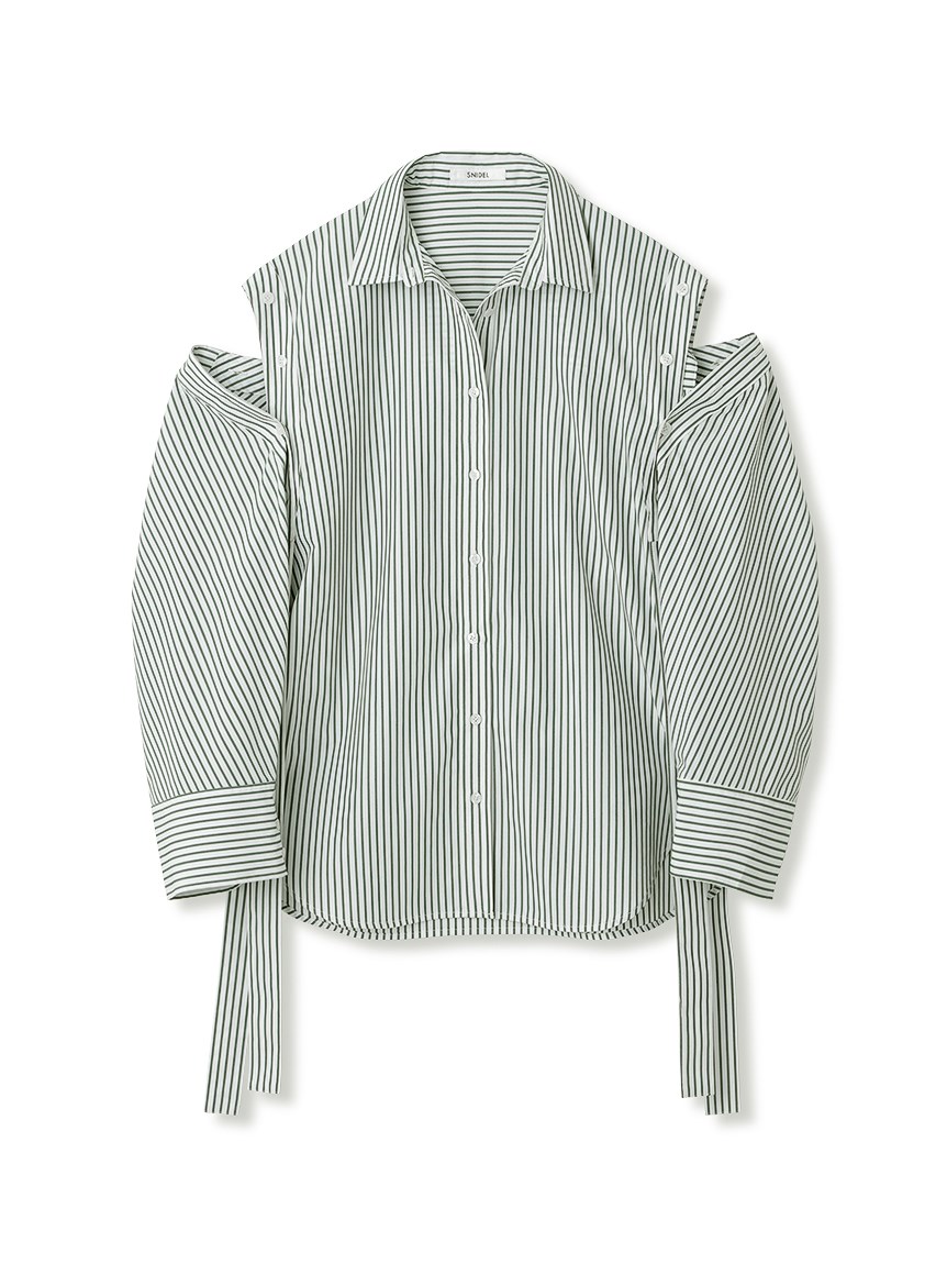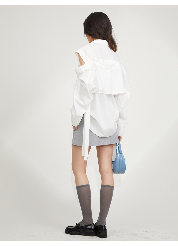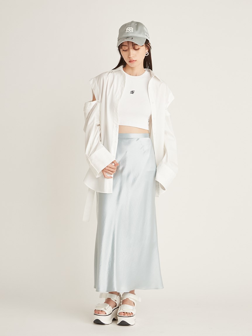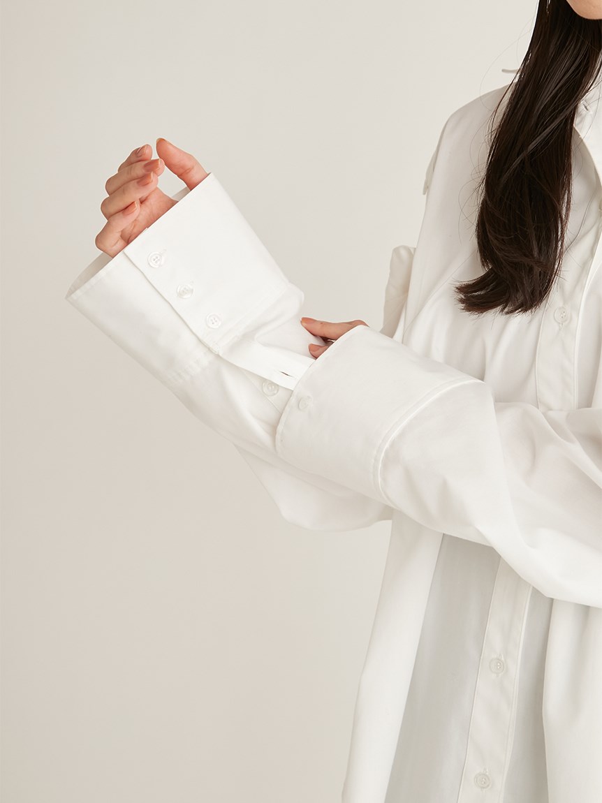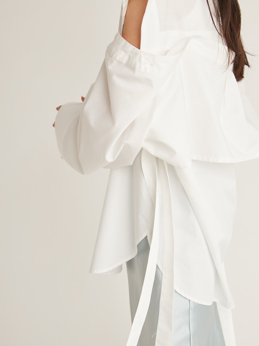 人気の2WAYシャツがアップグレードして登場。袖下にスリットと釦を備え、開閉してトレンドの肌見せができるデザインに。また、ストレート状の袖カフスの奥に釦をもう1つプラスし、袖を畳んでその釦で留めると、普通のブラウスのような細めのシルエットにもアレンジできるようにしています。ボレロの留め位置も落ち感が出るように設定し、より様々なスタイルが楽しめるアイテムへと仕上げました。