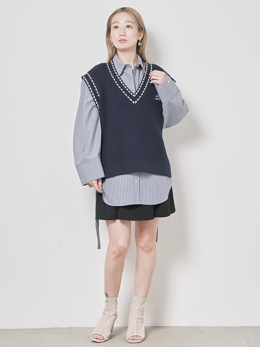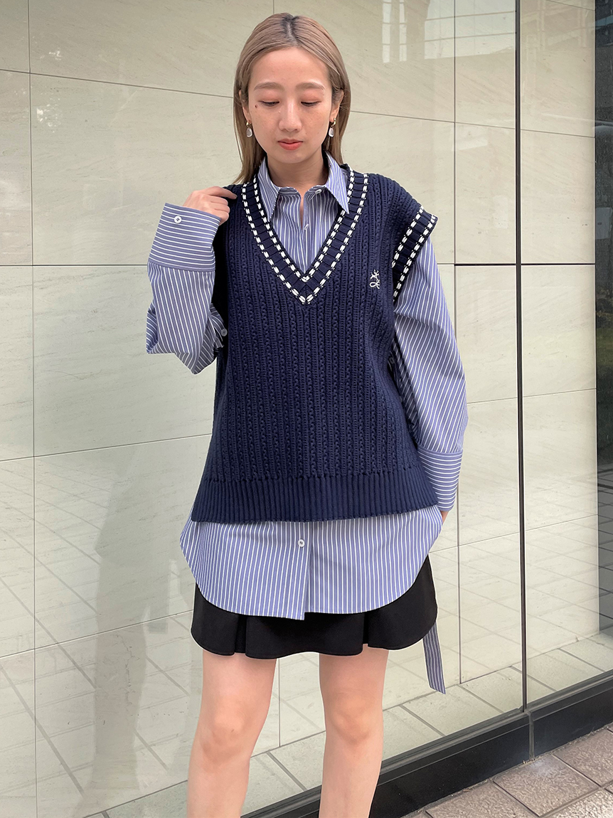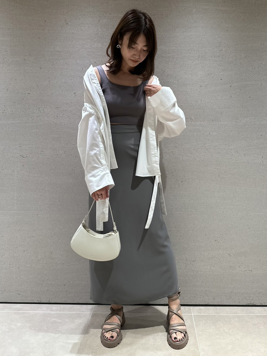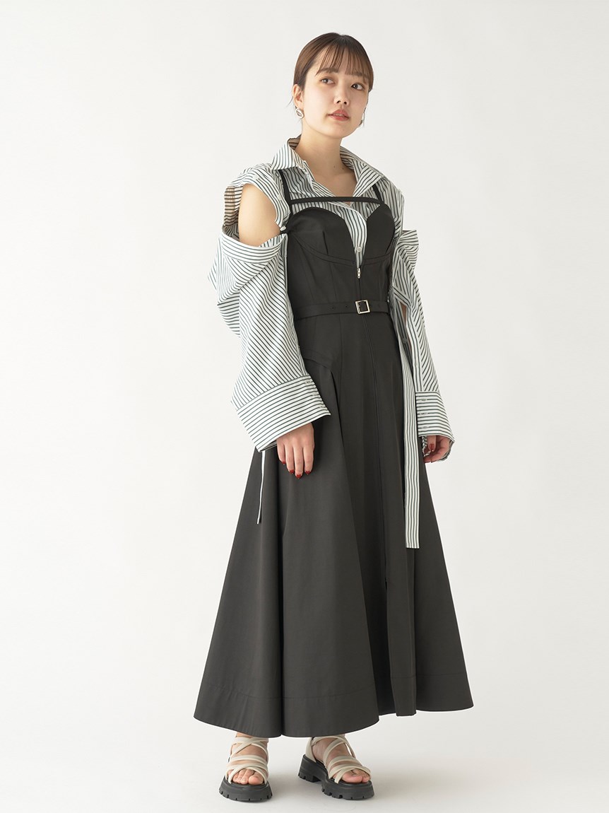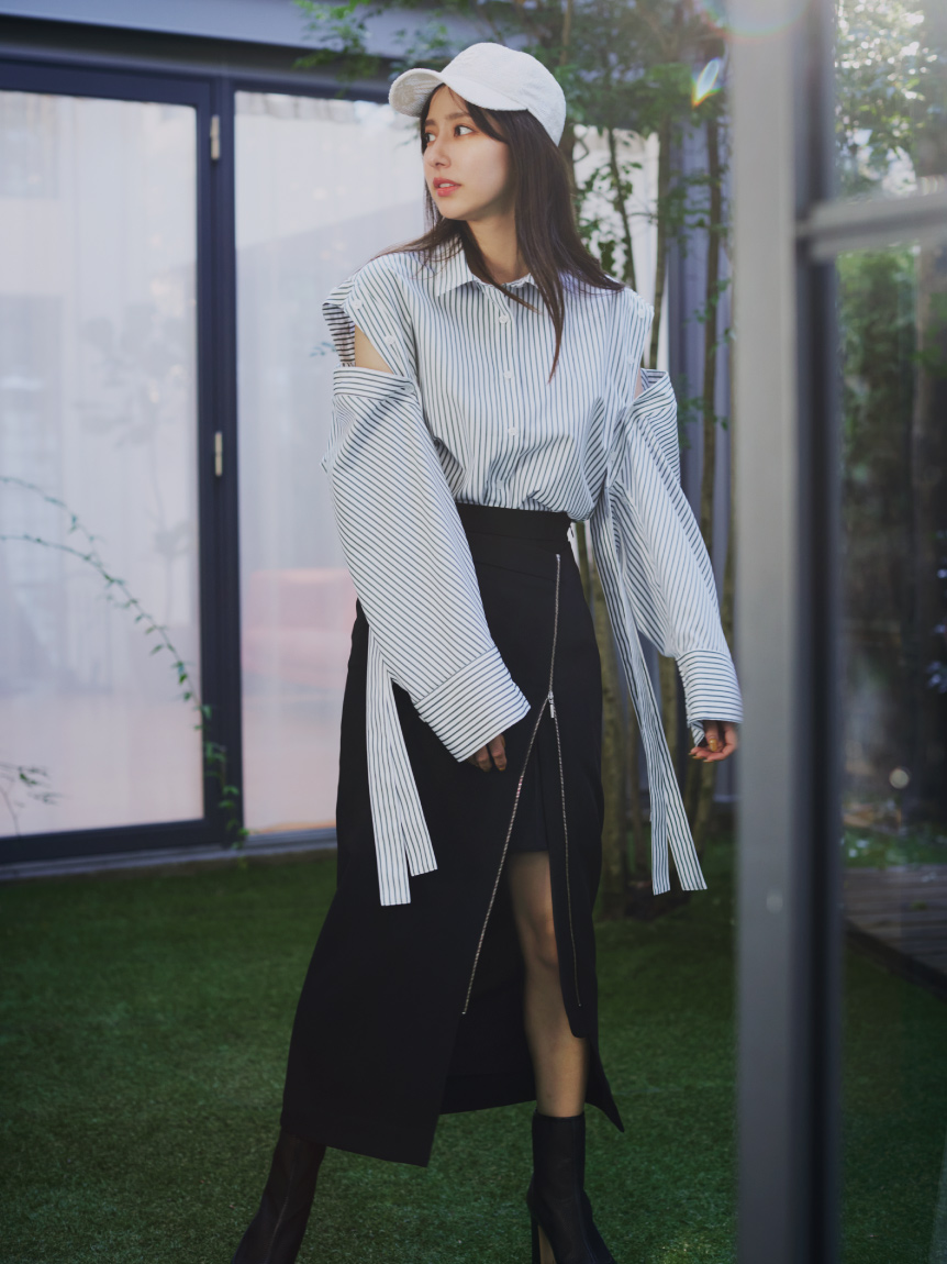 人気の2WAYシャツがアップグレードして登場。袖下にスリットと釦を備え、開閉してトレンドの肌見せができるデザインに。また、ストレート状の袖カフスの奥に釦をもう1つプラスし、袖を畳んでその釦で留めると、普通のブラウスのような細めのシルエットにもアレンジできるようにしています。ボレロの留め位置も落ち感が出るように設定し、より様々なスタイルが楽しめるアイテムへと仕上げました。