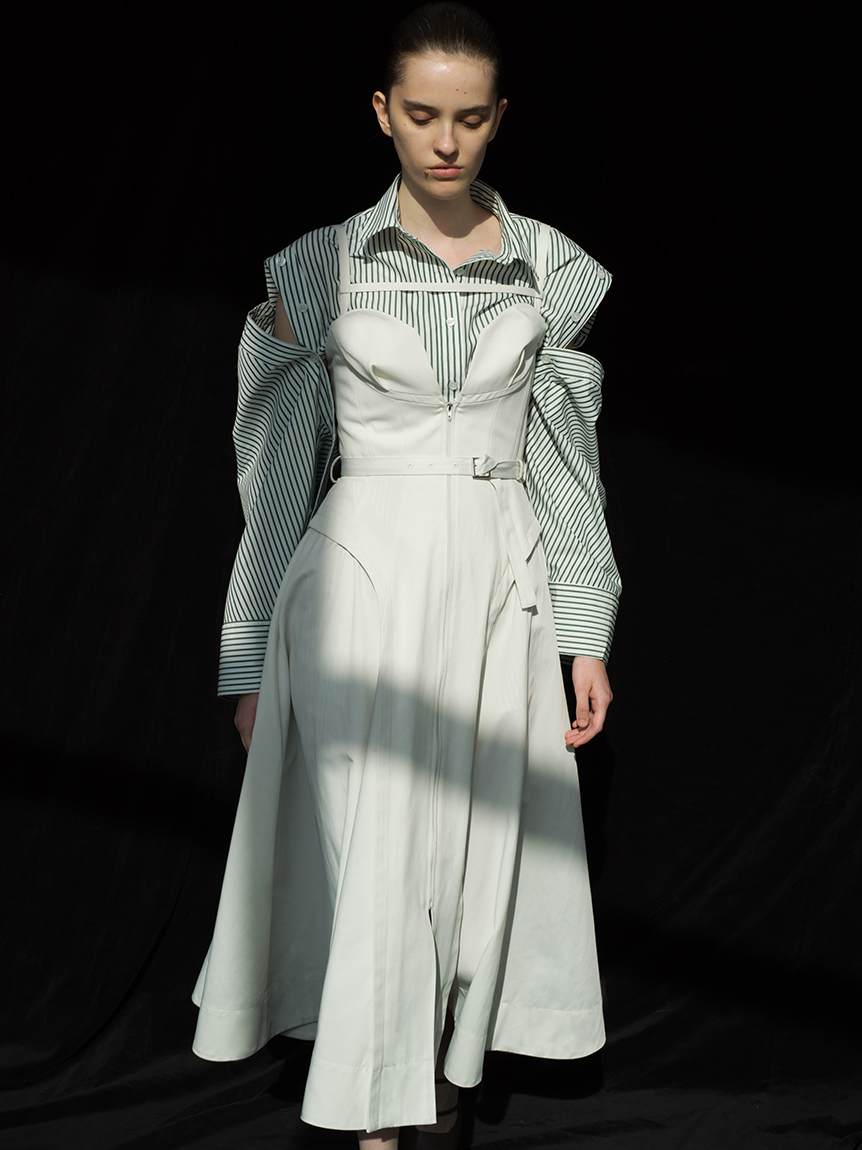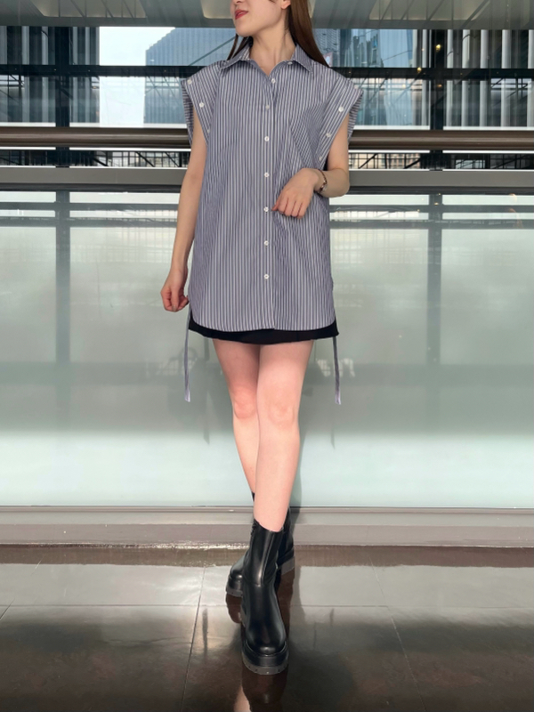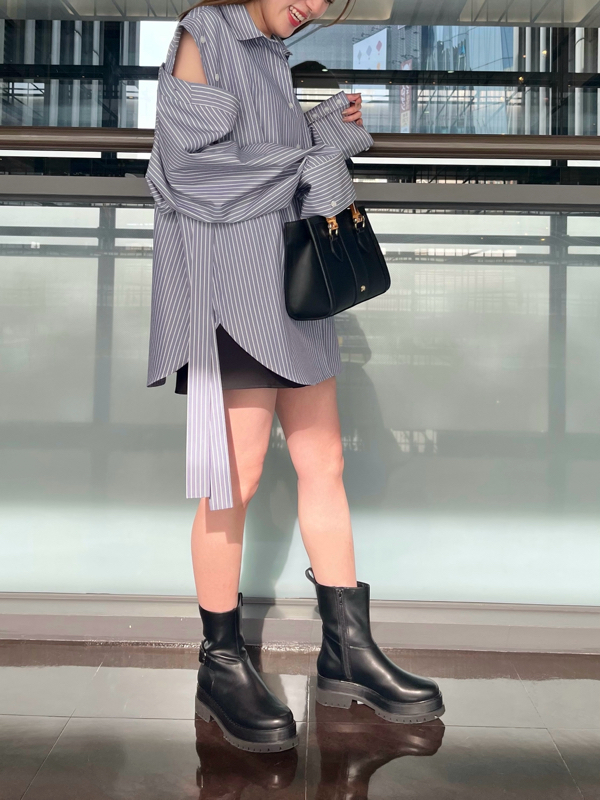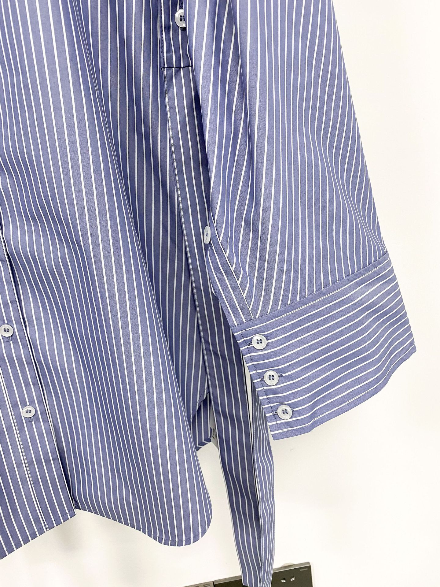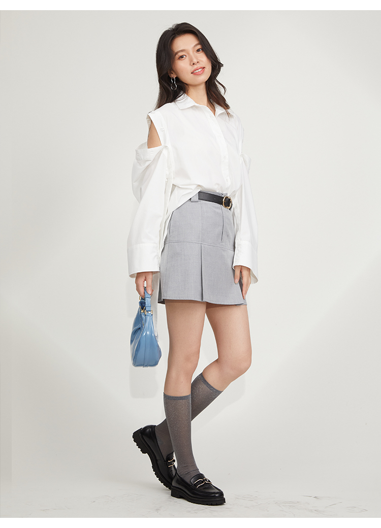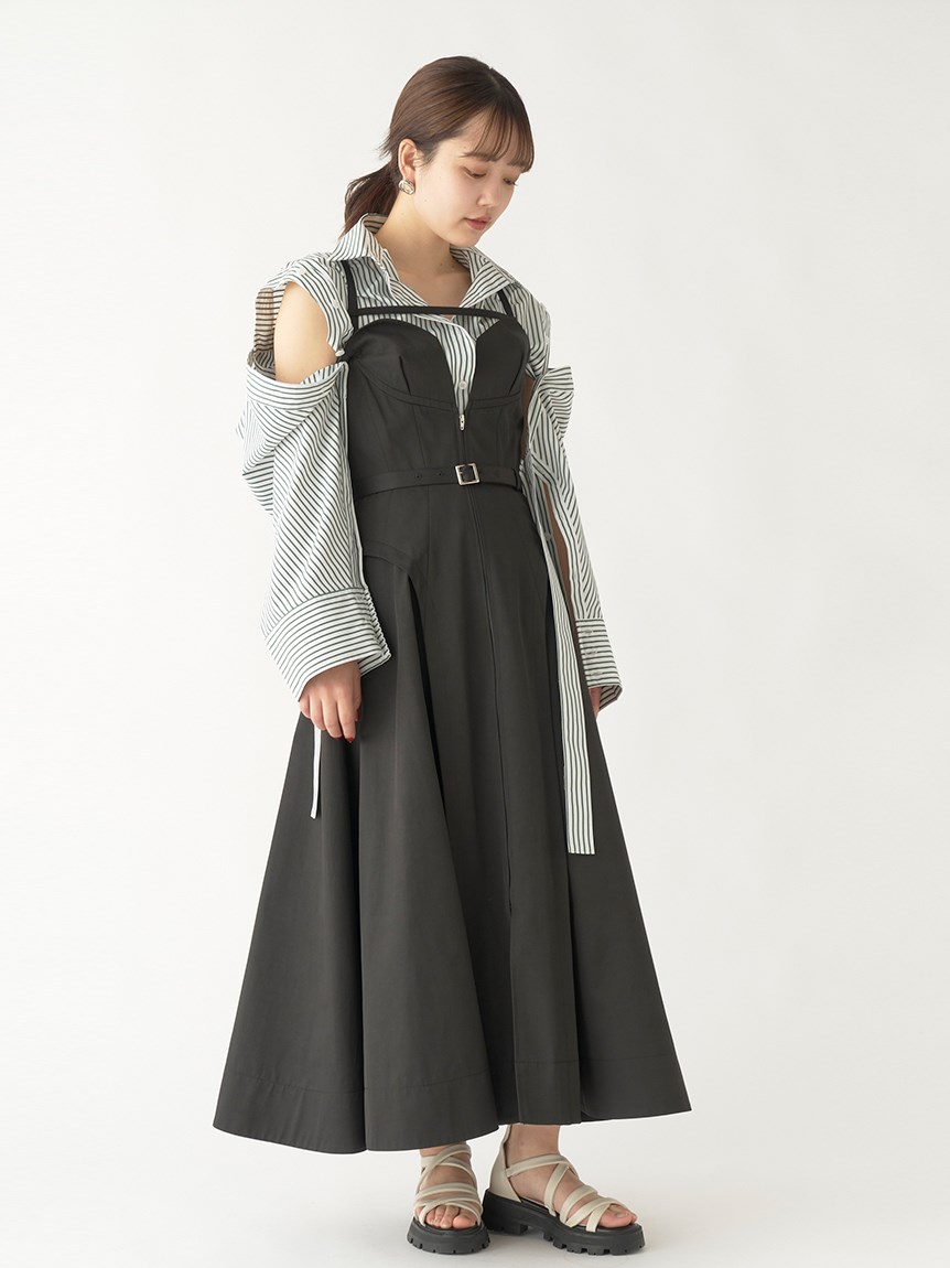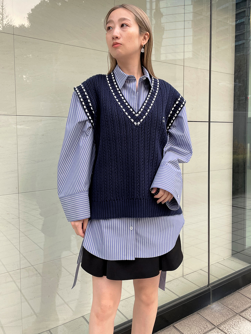 人気の2WAYシャツがアップグレードして登場。袖下にスリットと釦を備え、開閉してトレンドの肌見せができるデザインに。また、ストレート状の袖カフスの奥に釦をもう1つプラスし、袖を畳んでその釦で留めると、普通のブラウスのような細めのシルエットにもアレンジできるようにしています。ボレロの留め位置も落ち感が出るように設定し、より様々なスタイルが楽しめるアイテムへと仕上げました。