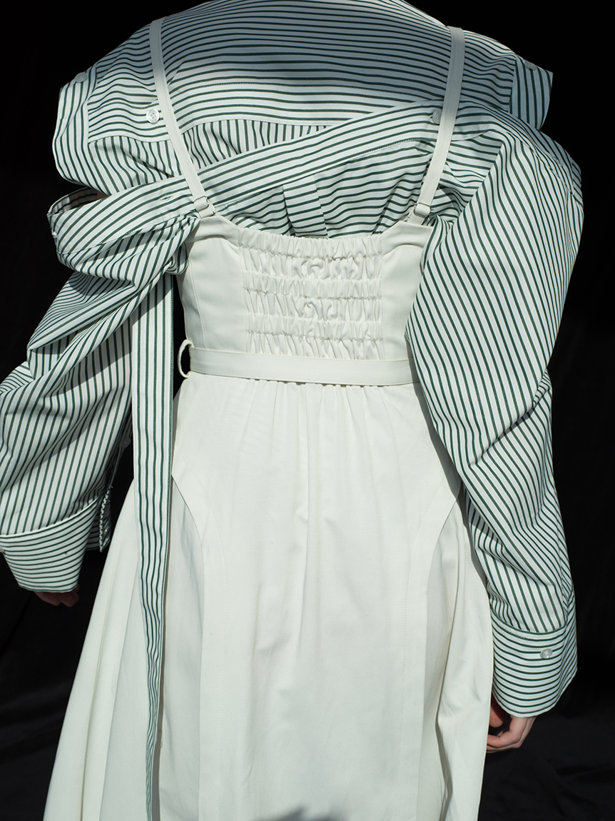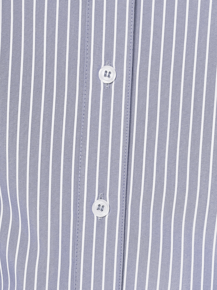 リサイクルポリエステルを用いたサステナブルなシャツ地を使用。ベーシックで着まわしやすいホワイトに、ストライプ柄を浮かべたグリーンとブルーを加えた3色展開でお届けします。