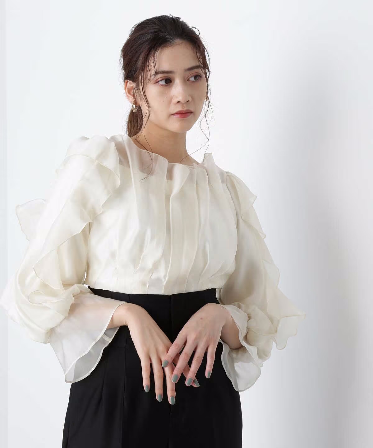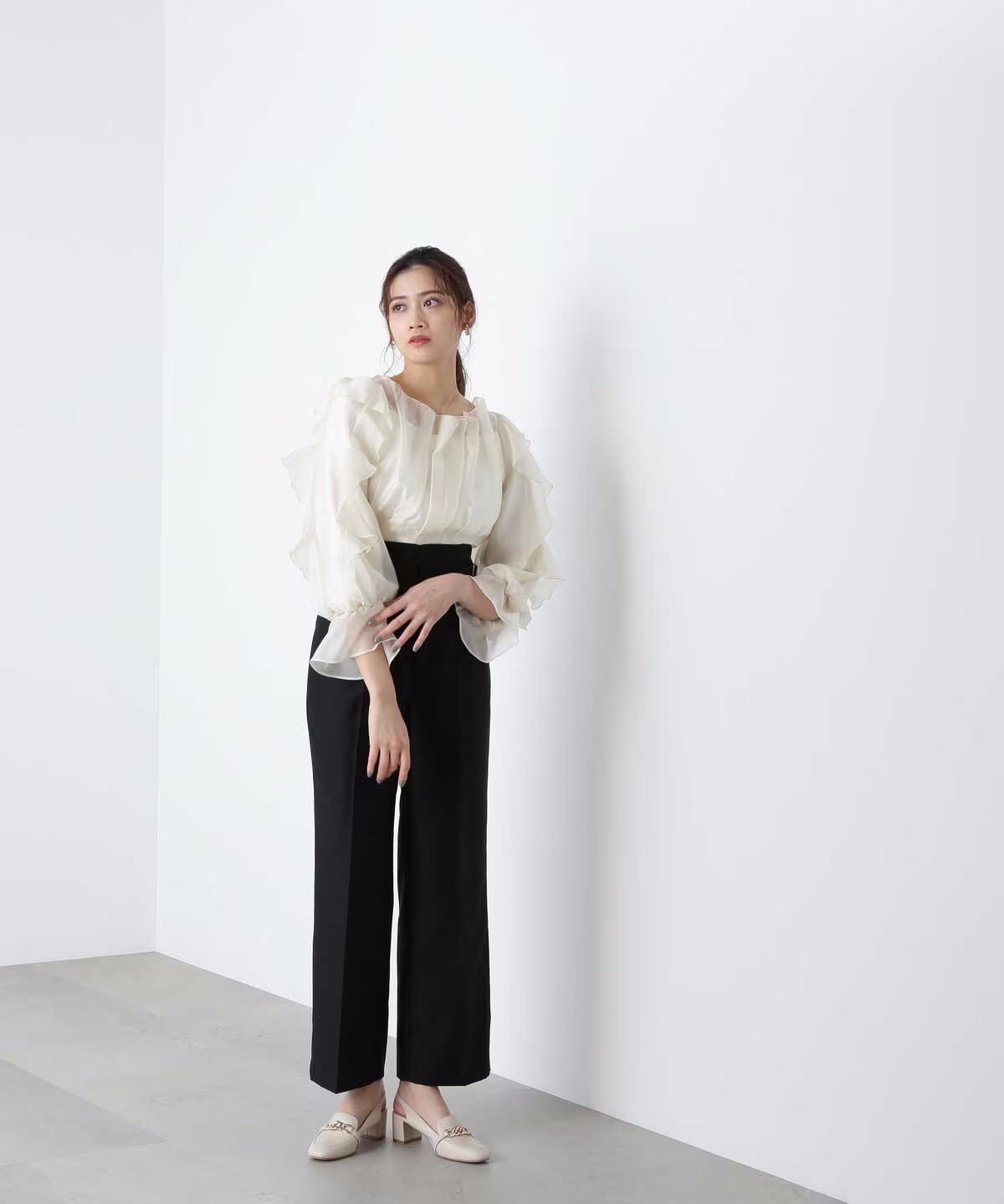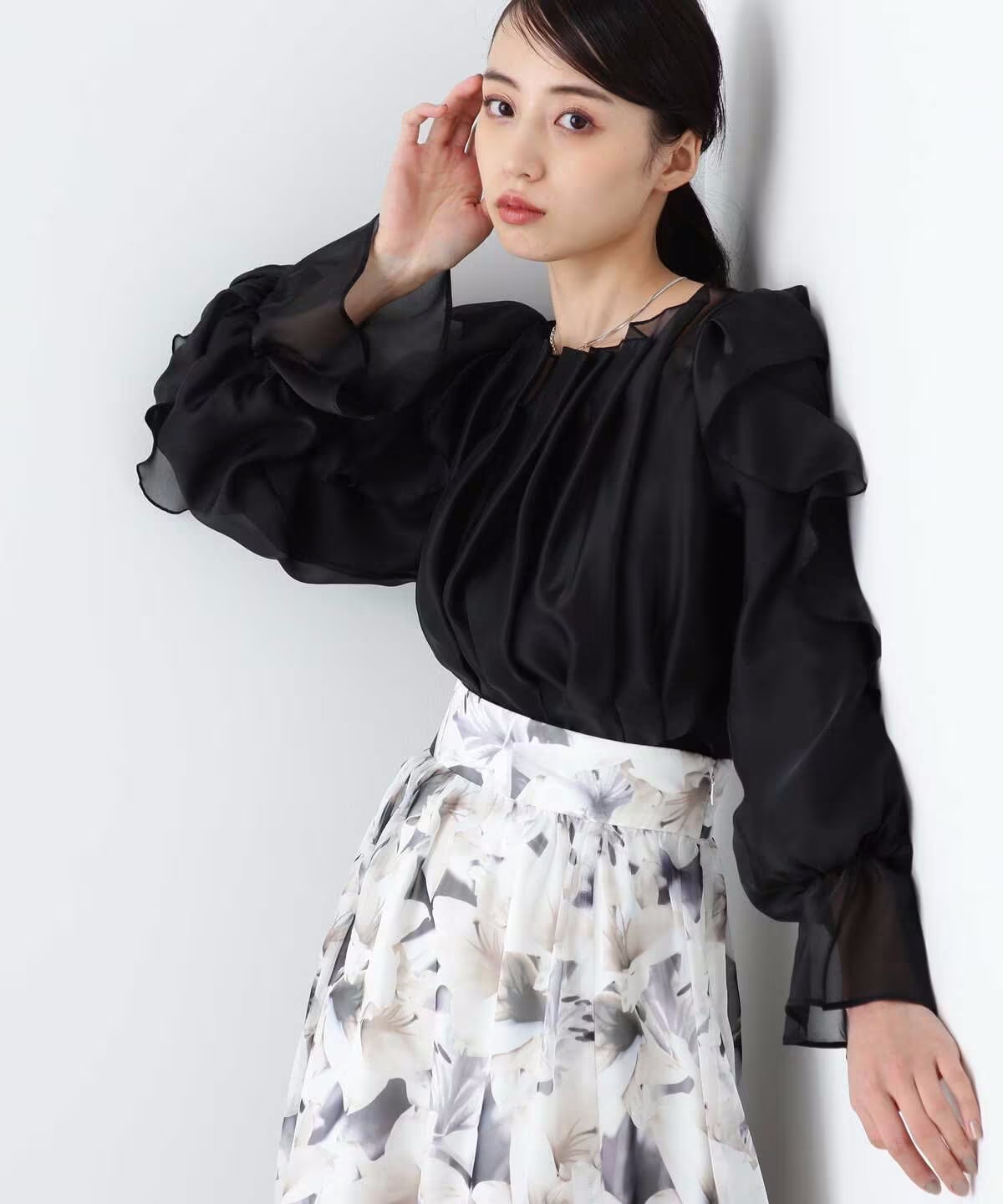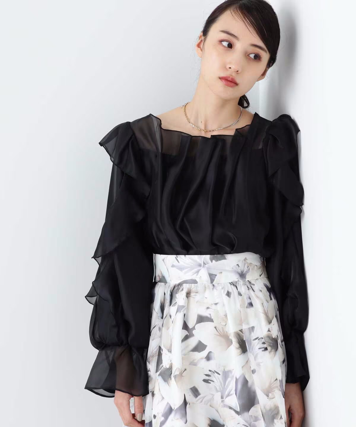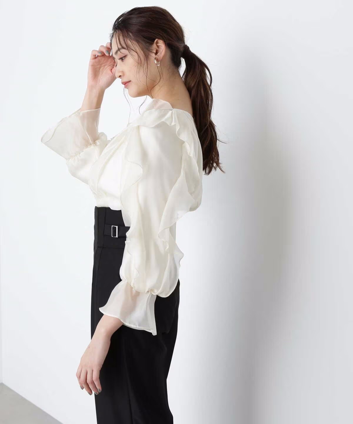 ほんのり透けるラッフルブラウス。身頃とショルダーラインの華やかなラッフルデザインが映えます。デコルテラインを綺麗に見せてくれるのもポイント。スカートやパンツに裾をインするだけで上品に決まります。※撮影時照明の関係により、色味が違って見える場合がございます。