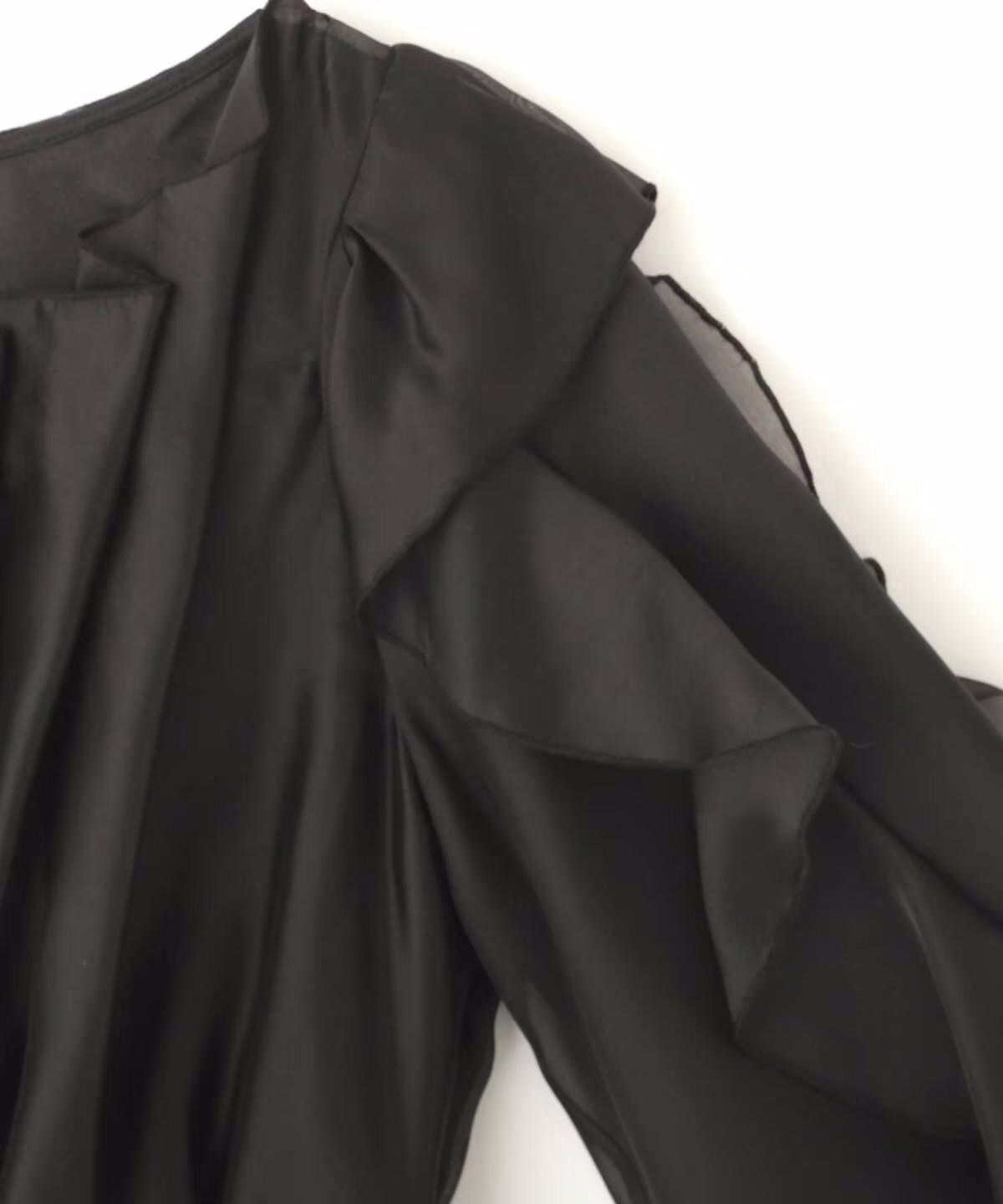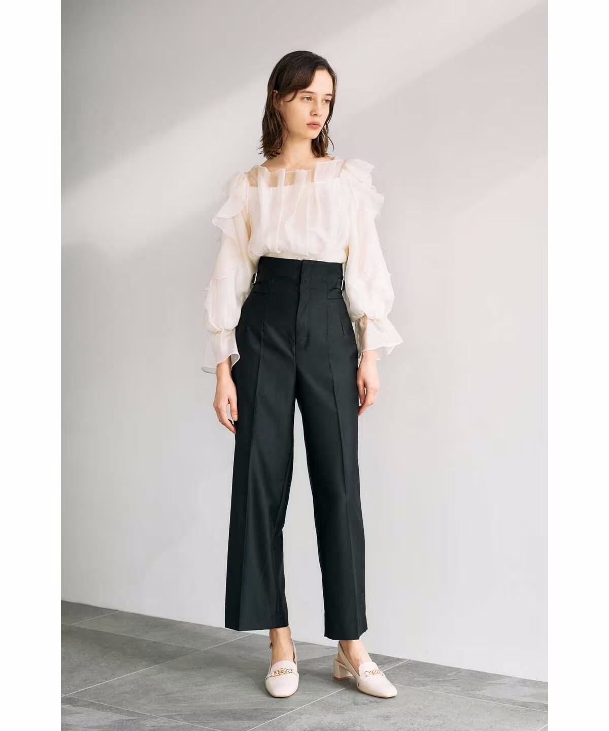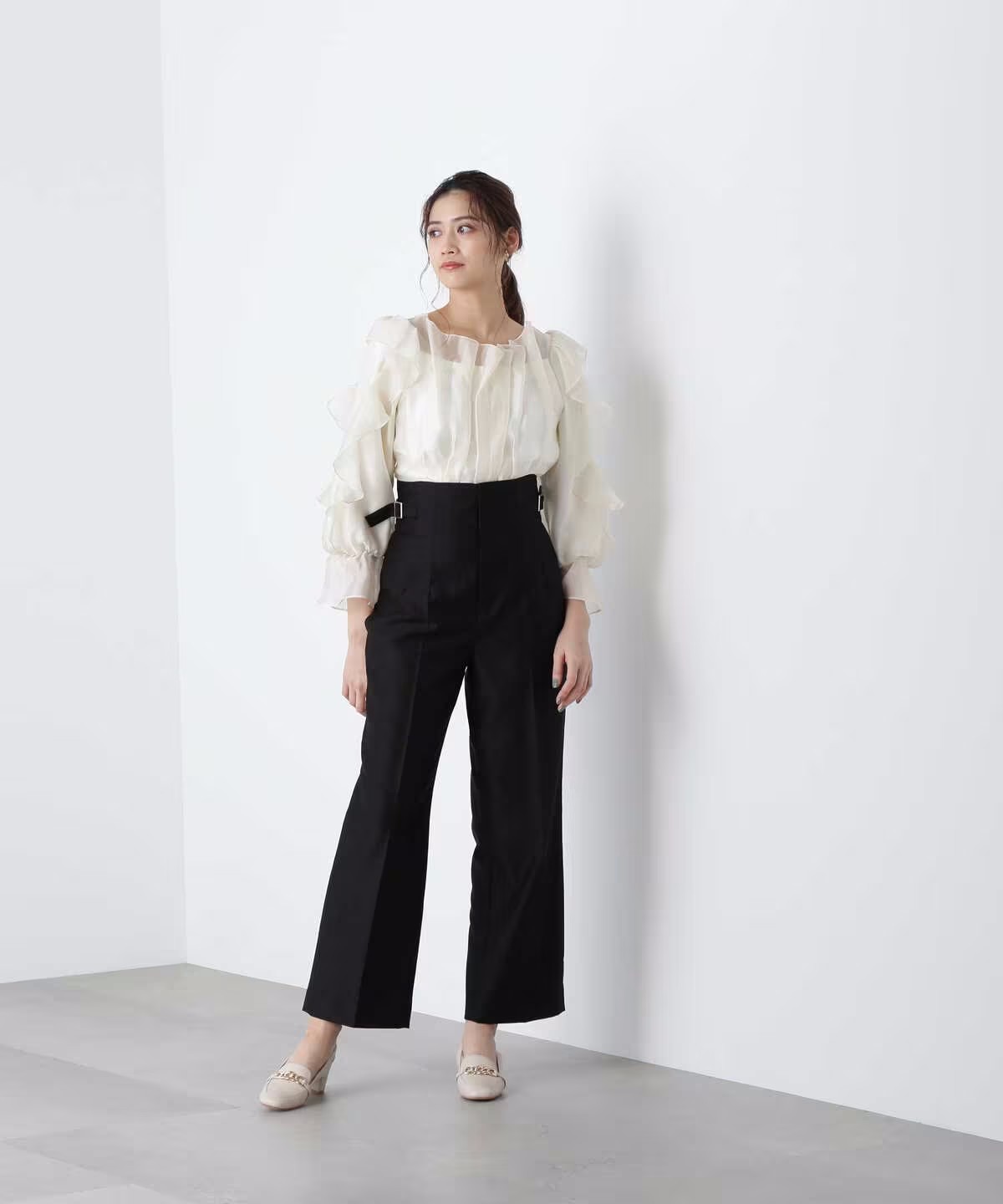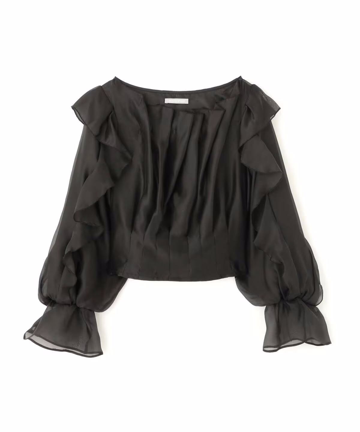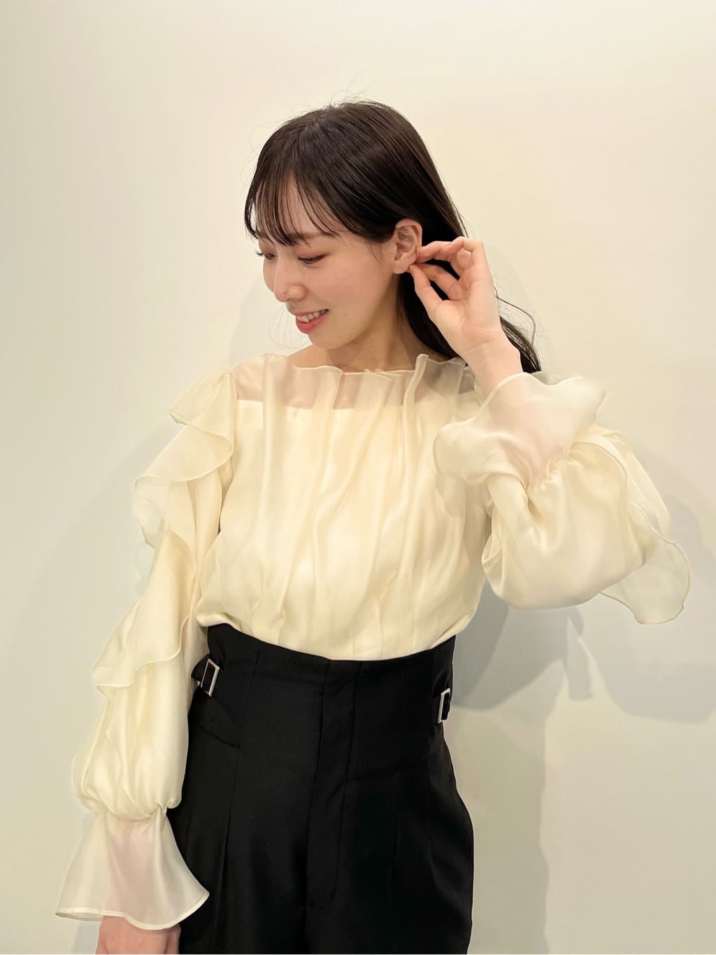 ほんのり透けるラッフルブラウス。身頃とショルダーラインの華やかなラッフルデザインが映えます。デコルテラインを綺麗に見せてくれるのもポイント。スカートやパンツに裾をインするだけで上品に決まります。※撮影時照明の関係により、色味が違って見える場合がございます。