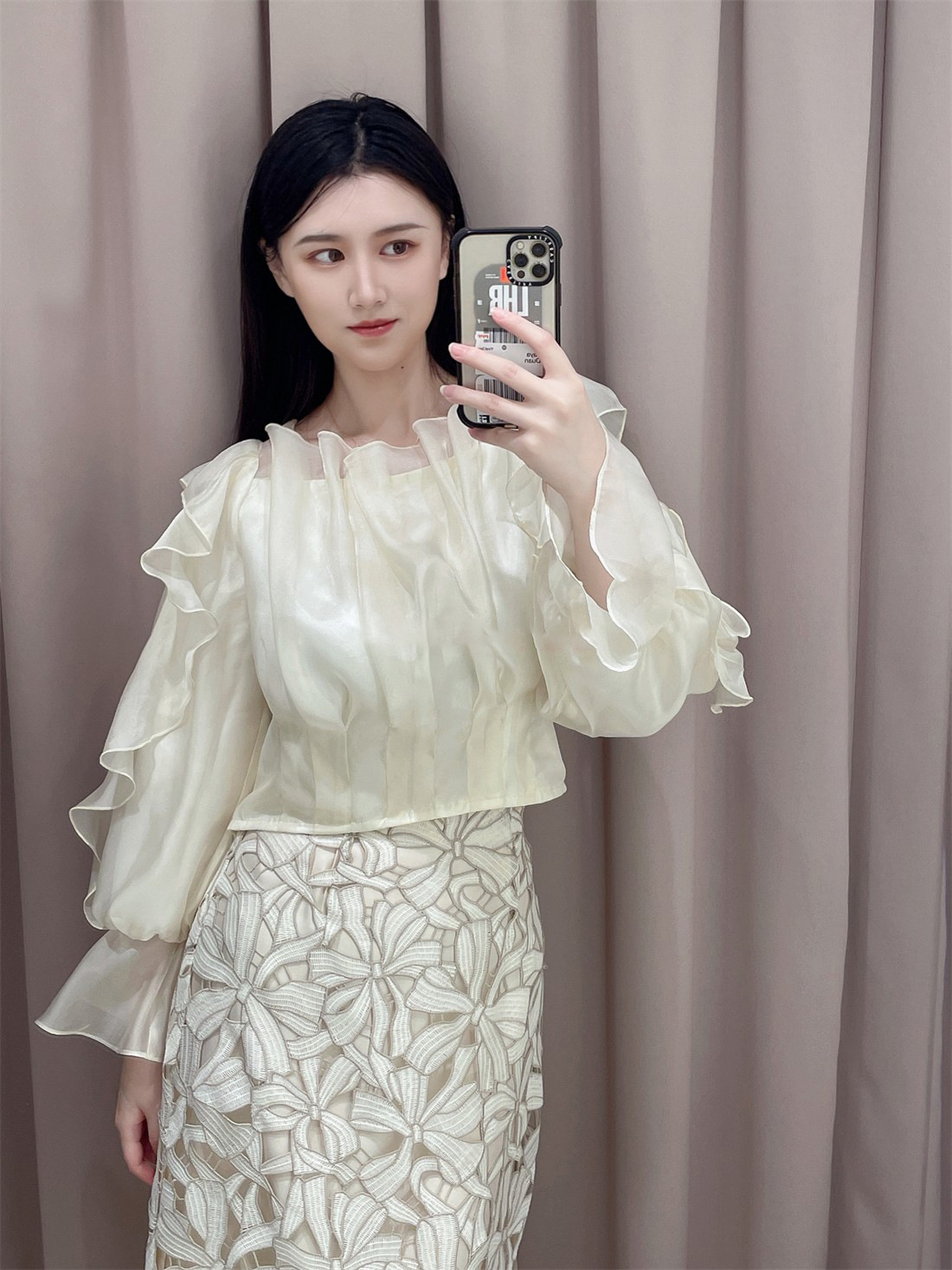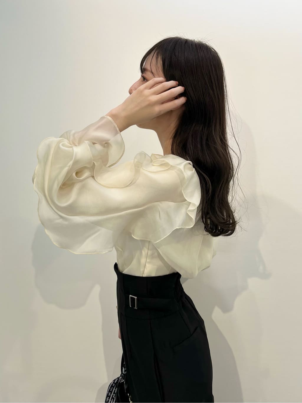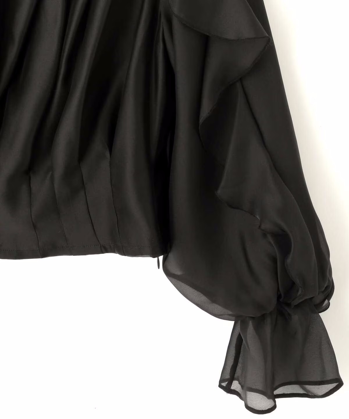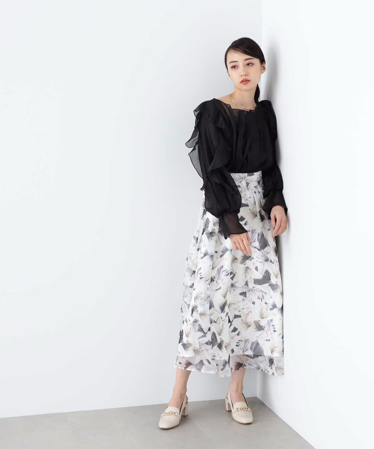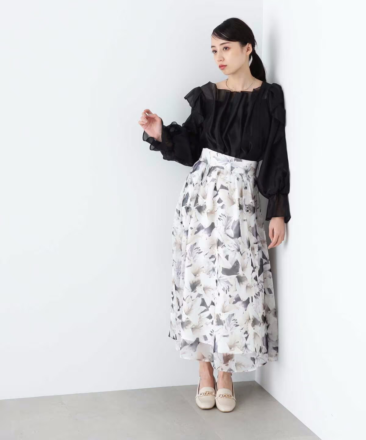 ほんのり透けるラッフルブラウス。身頃とショルダーラインの華やかなラッフルデザインが映えます。デコルテラインを綺麗に見せてくれるのもポイント。スカートやパンツに裾をインするだけで上品に決まります。※撮影時照明の関係により、色味が違って見える場合がございます。