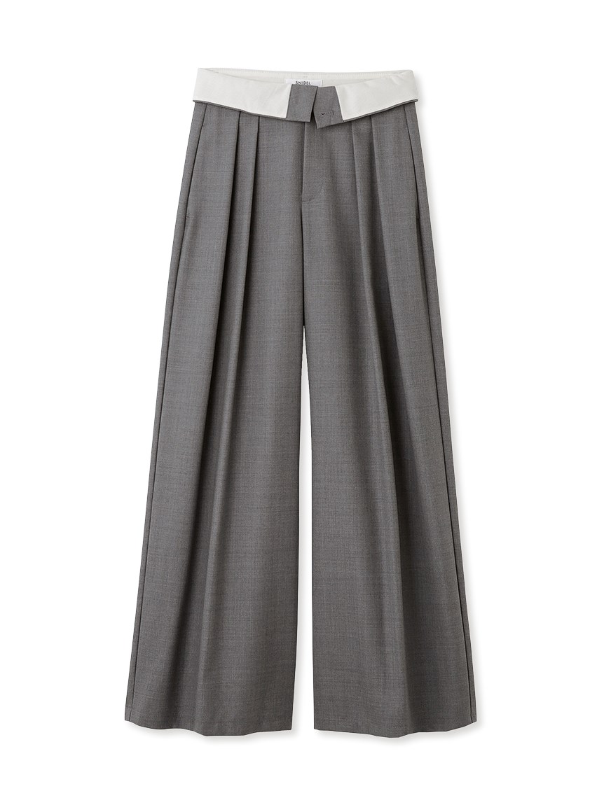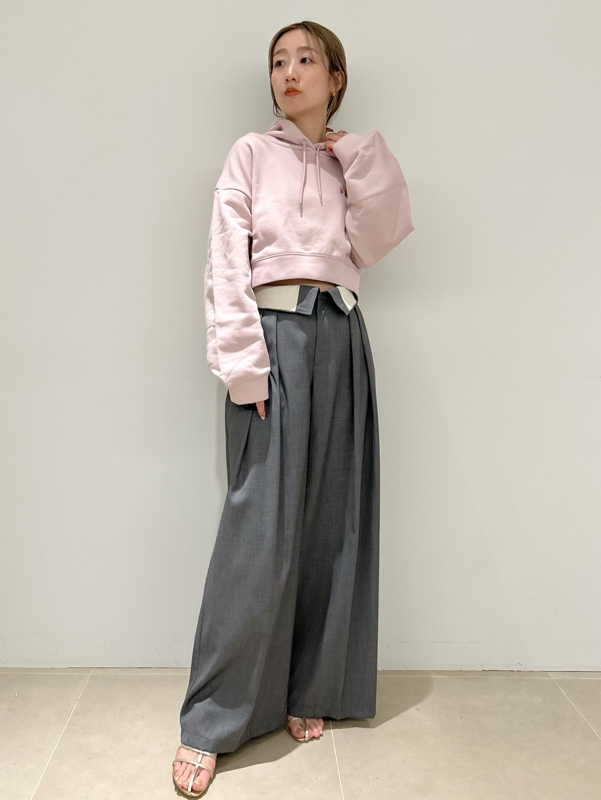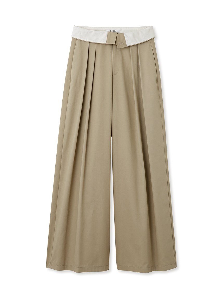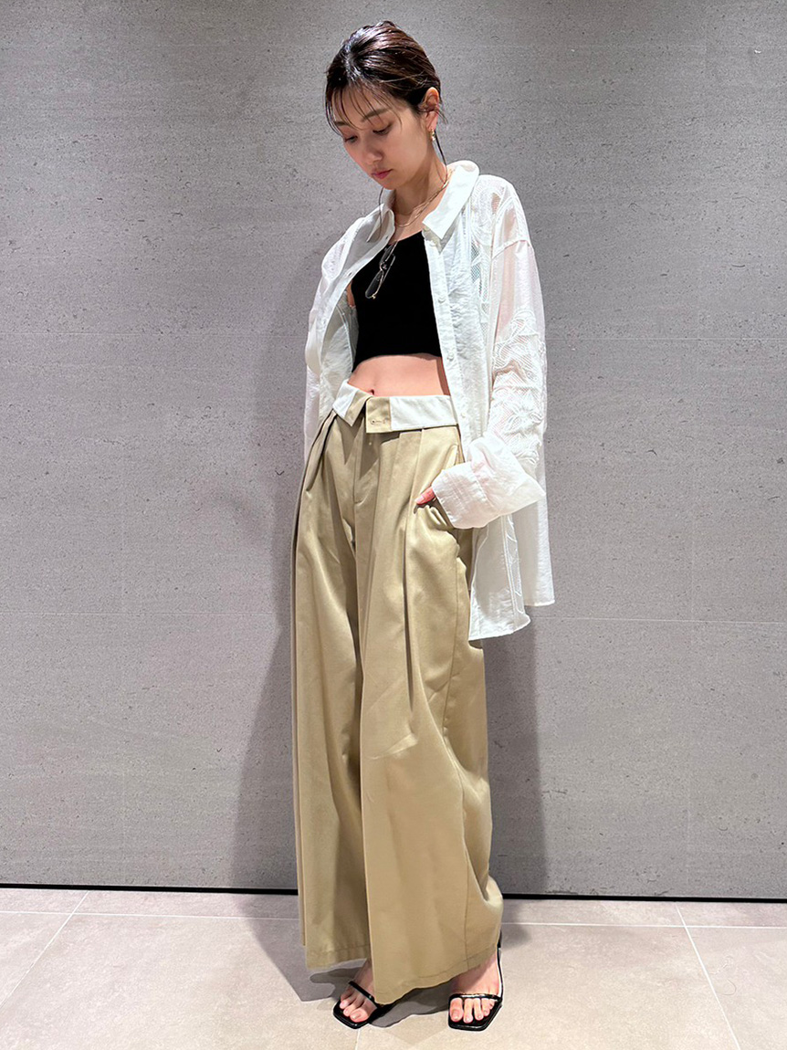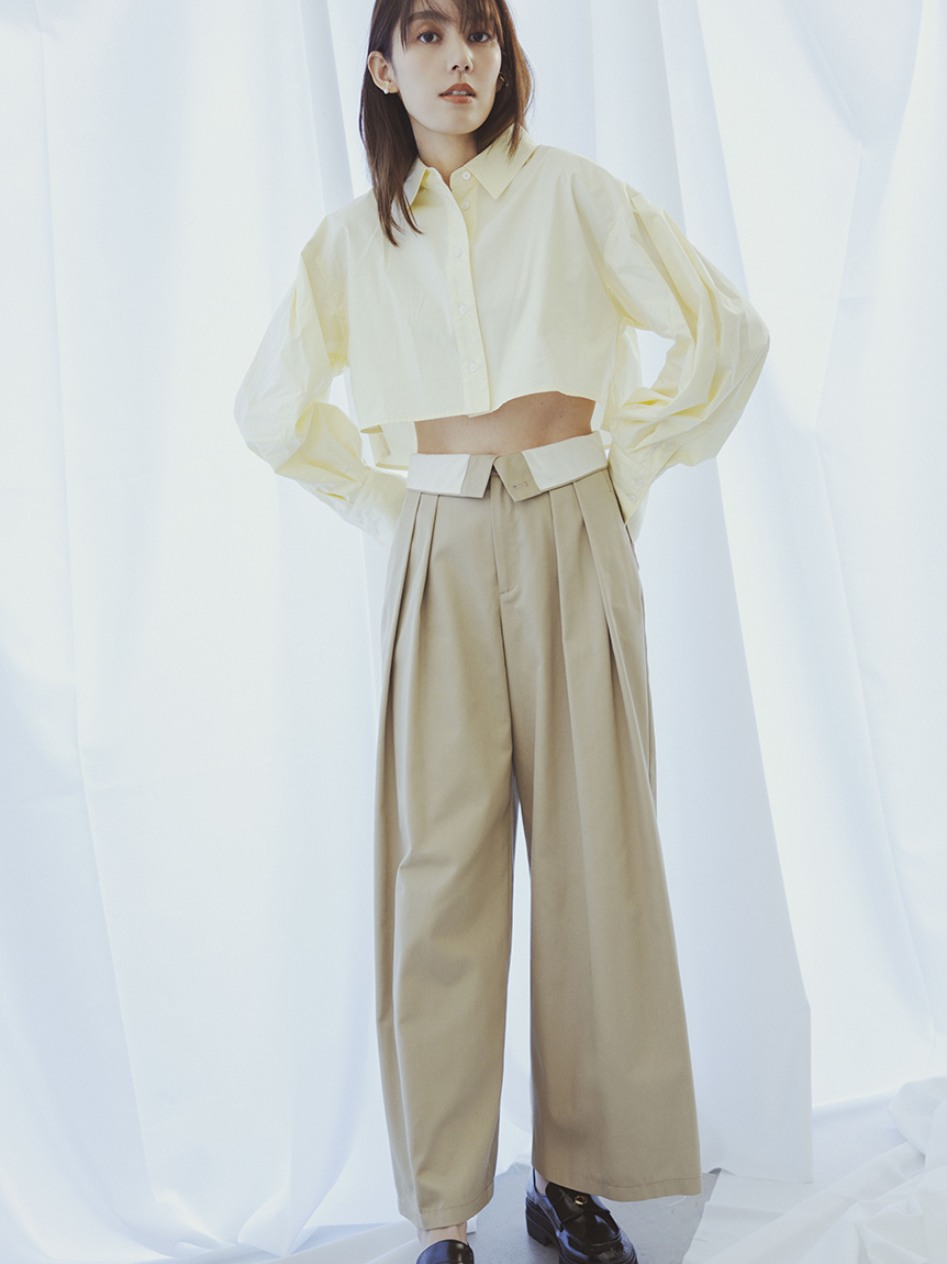 トレンド急上昇のウエスト折り返しデザインを取り入れた、一点投入で感度の高いスタイリングを叶えるパンツ。あらかじめ折り返した設定でデザインしているのでトライしやすく、今年らしいクロップド丈アイテムとも相性抜群です。たっぷりとタックを入れたワイドシルエットがこなれ感を与える秘訣。カジュアルなTシャツから女性らしいトップスまで幅広いテイストにマッチし、着まわし力も◎です。