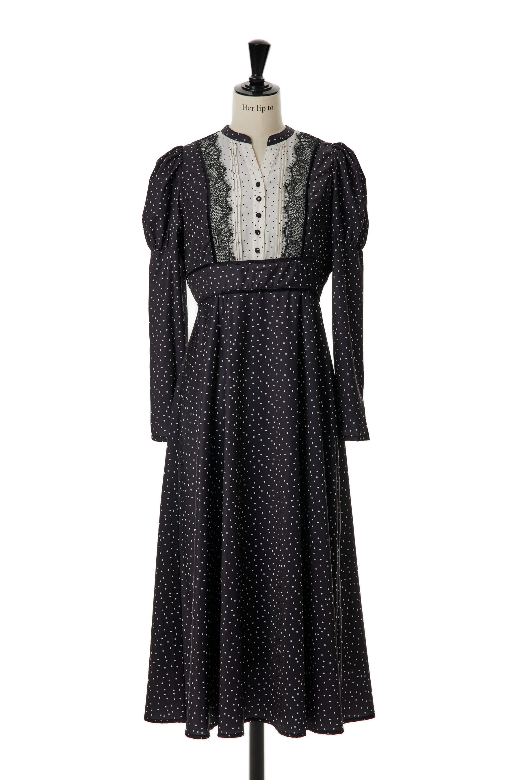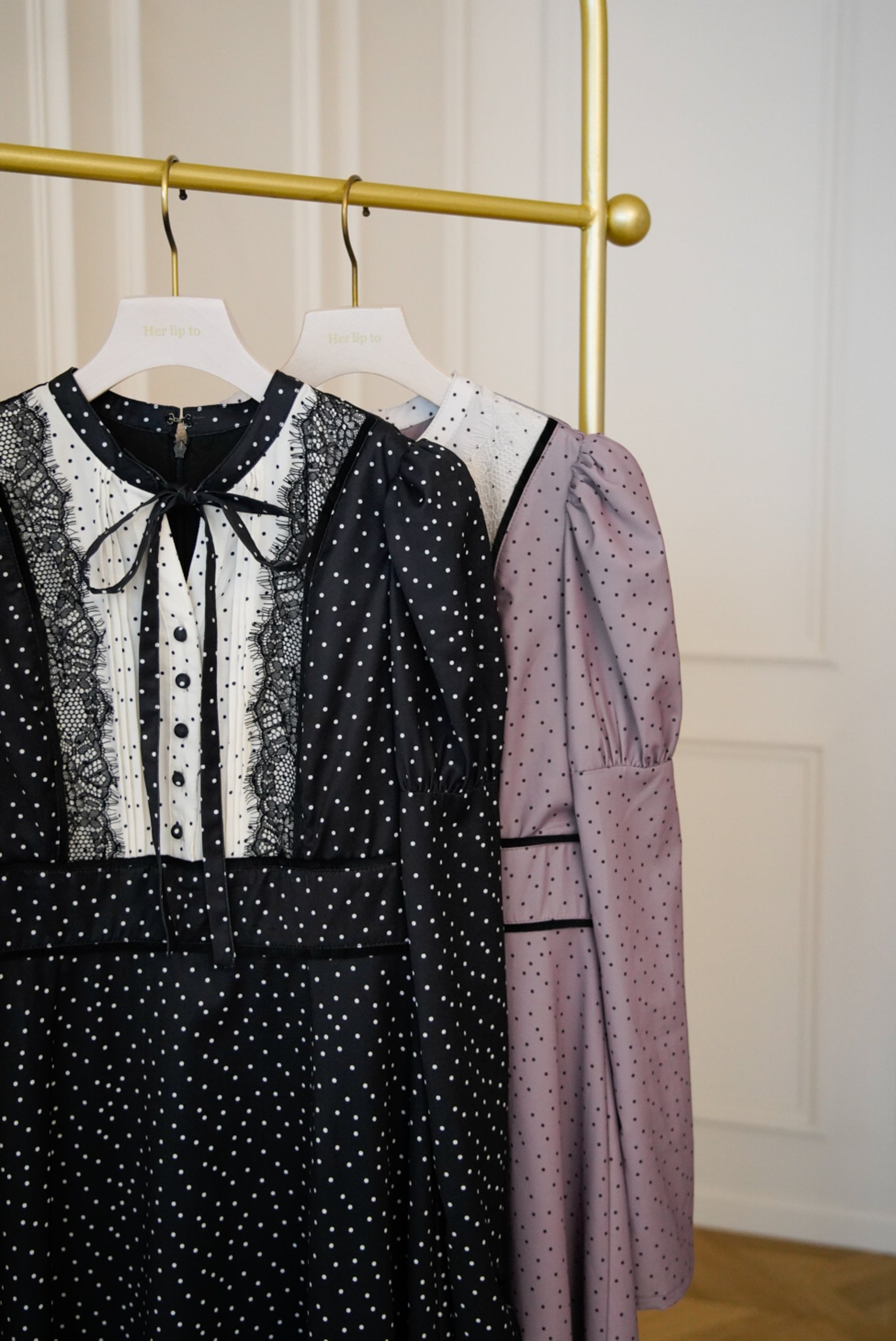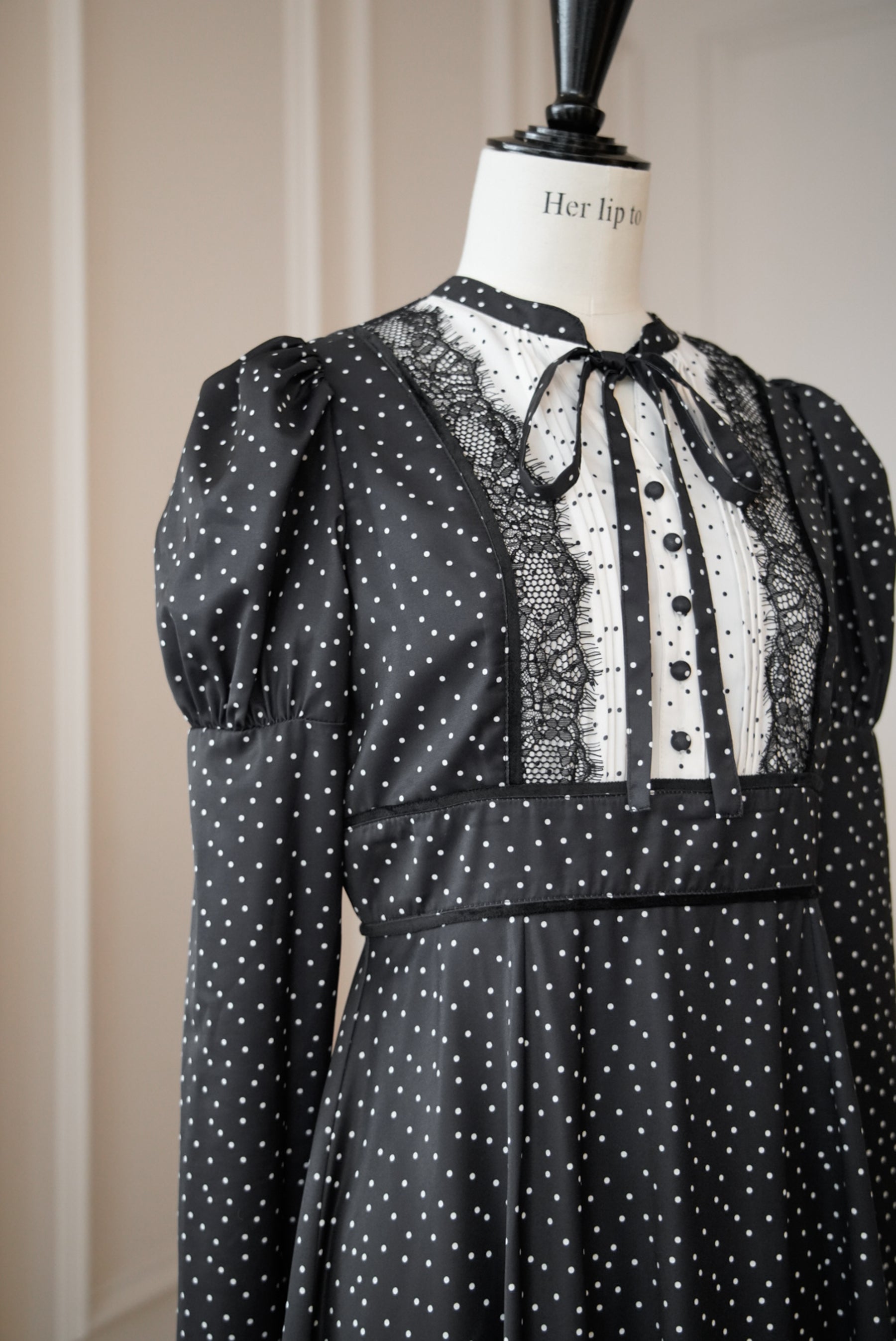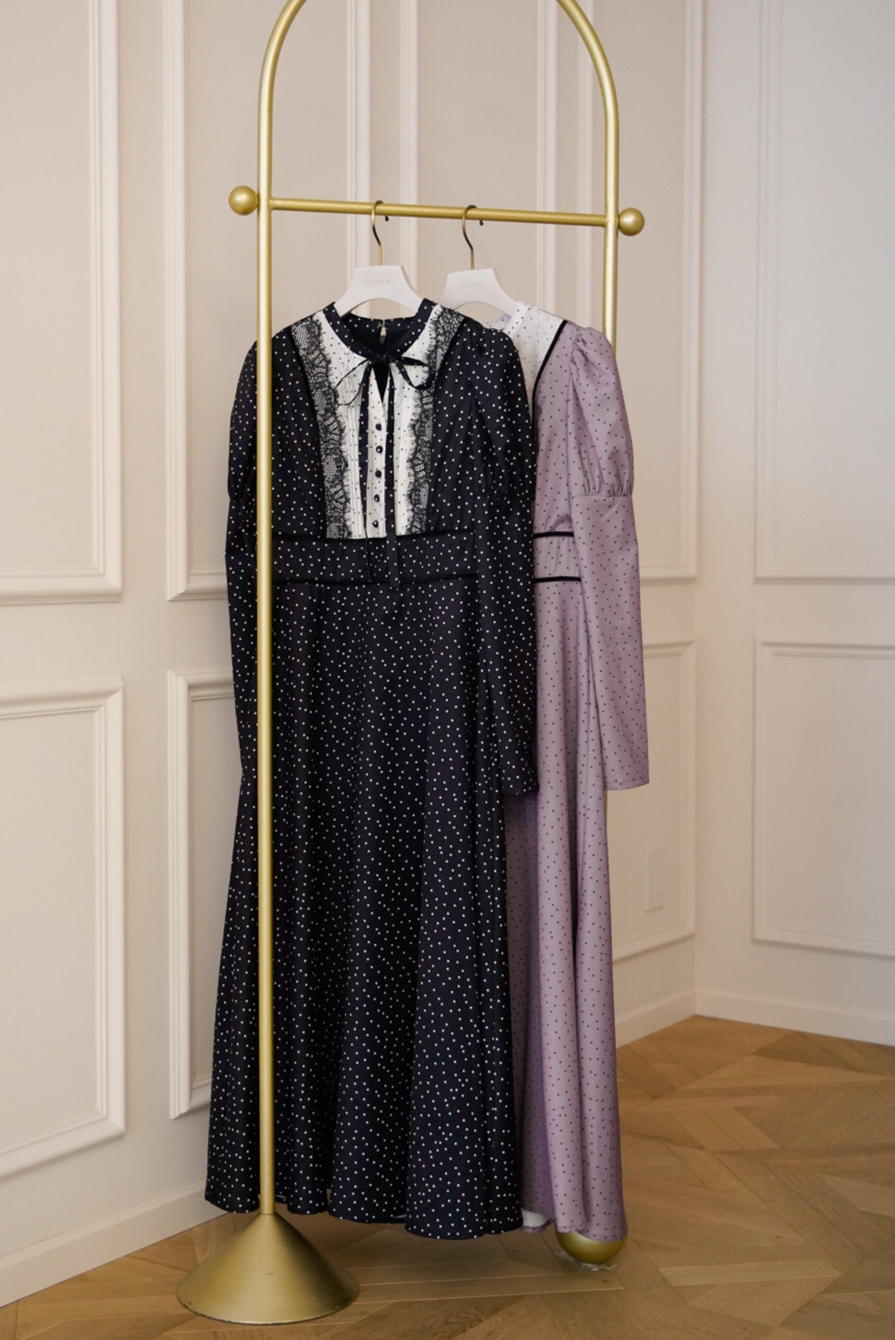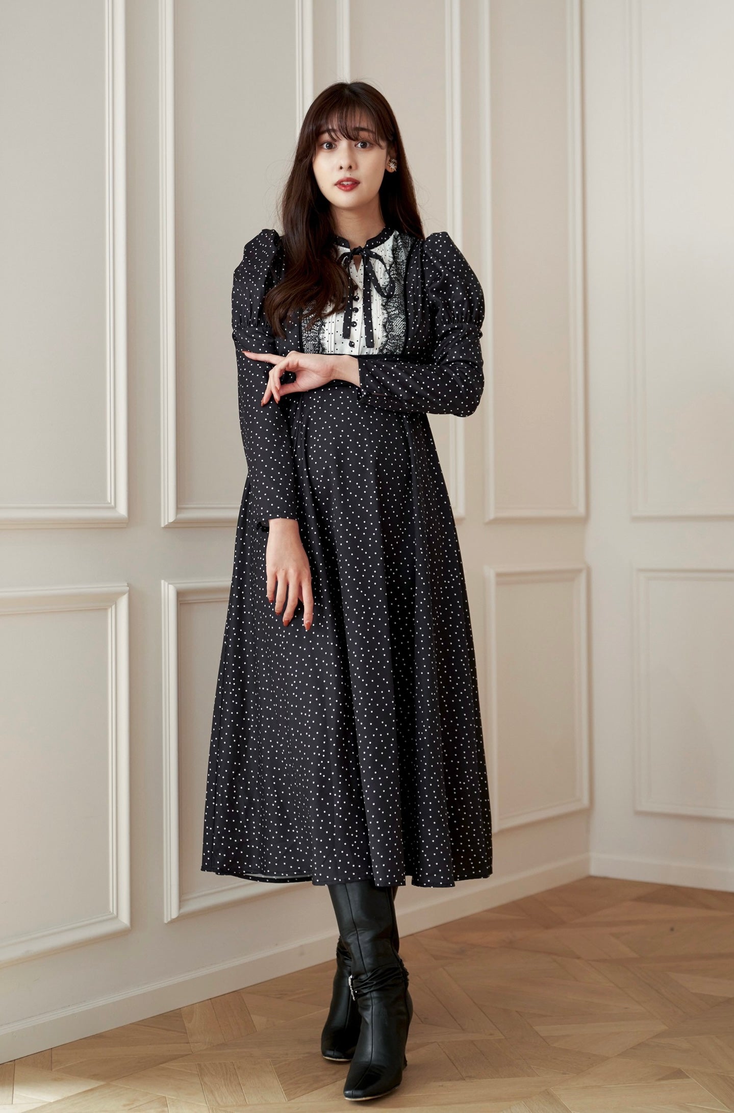 2トーンのドットを掛け合わせた、洗練されたクラシカルな印象のロングドレス。