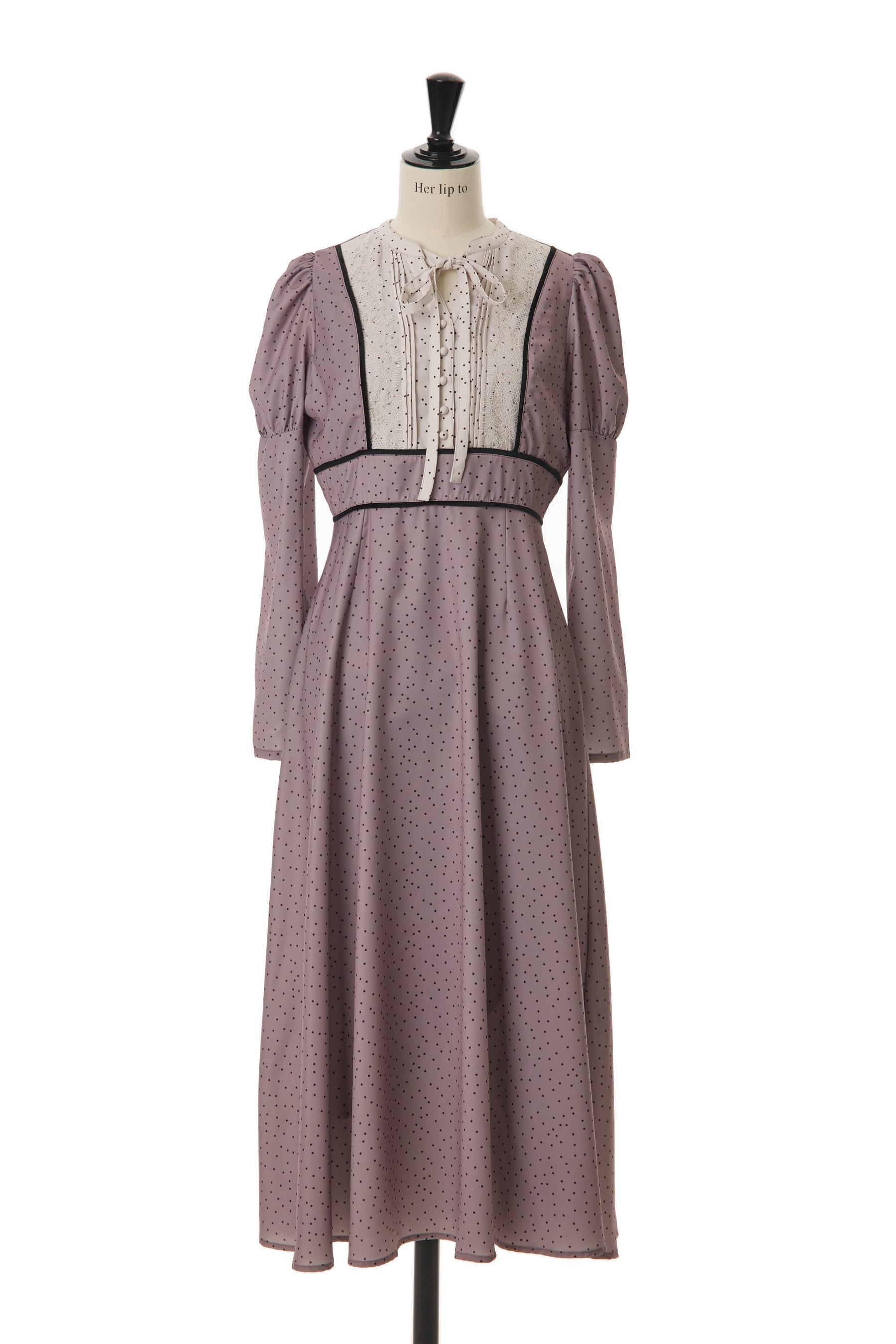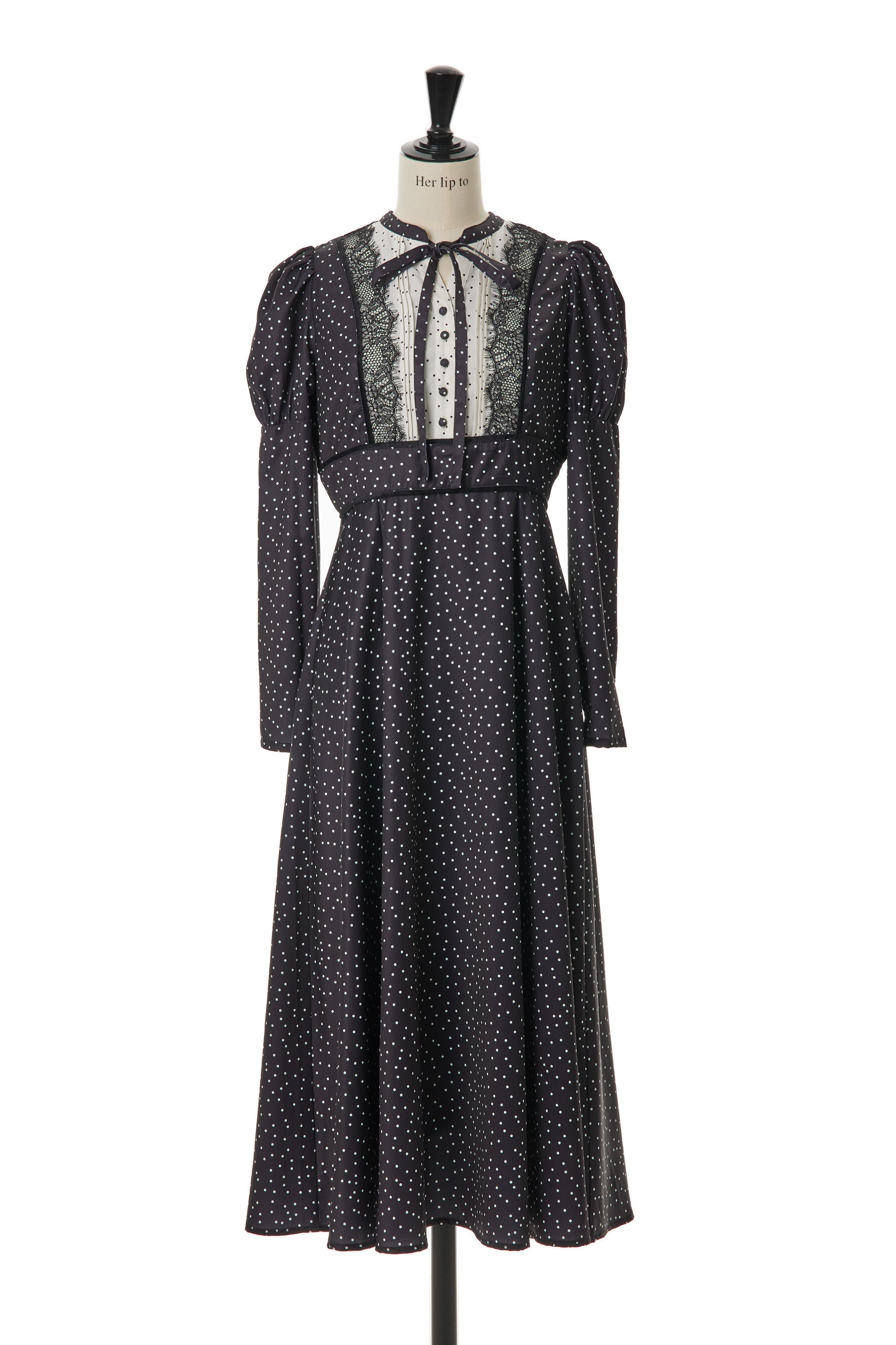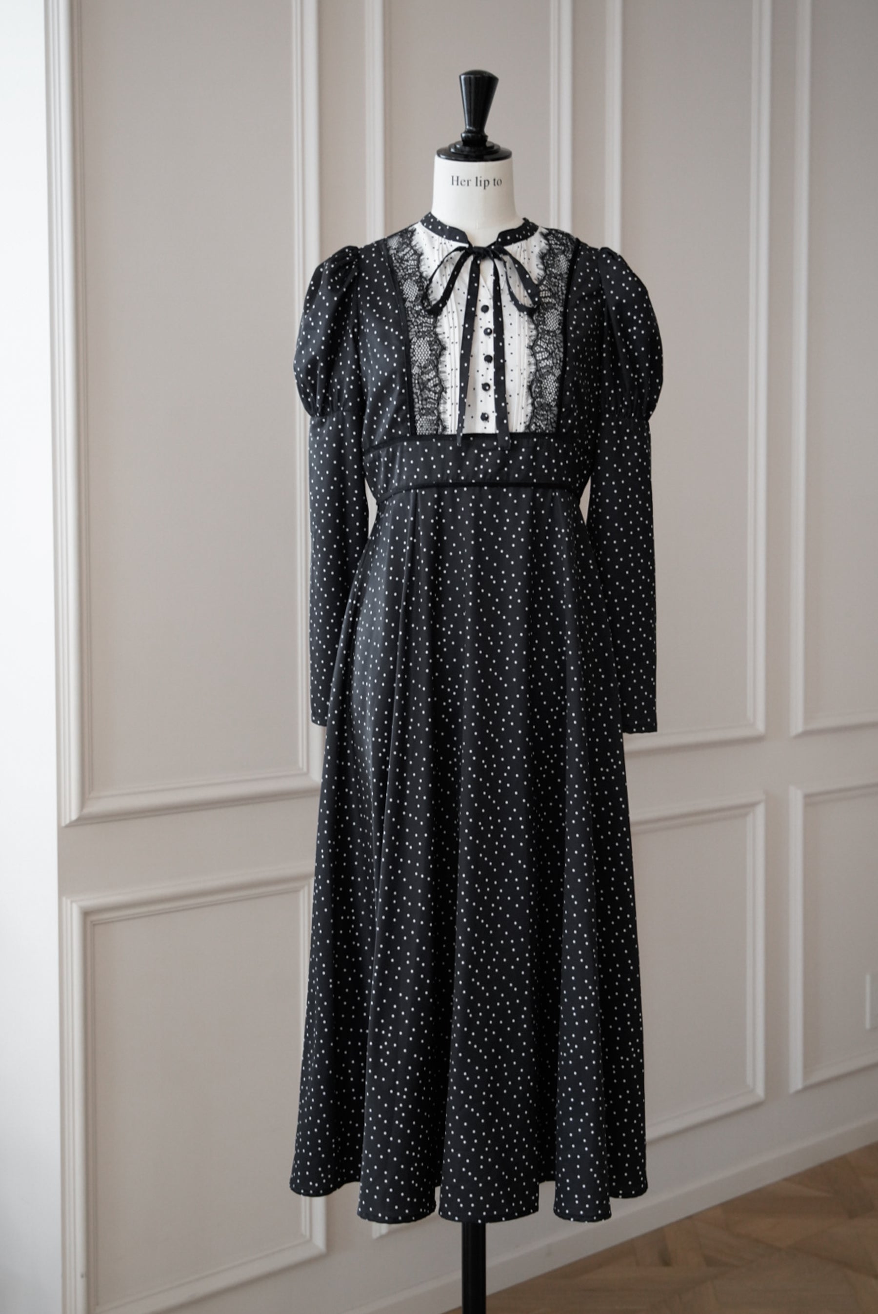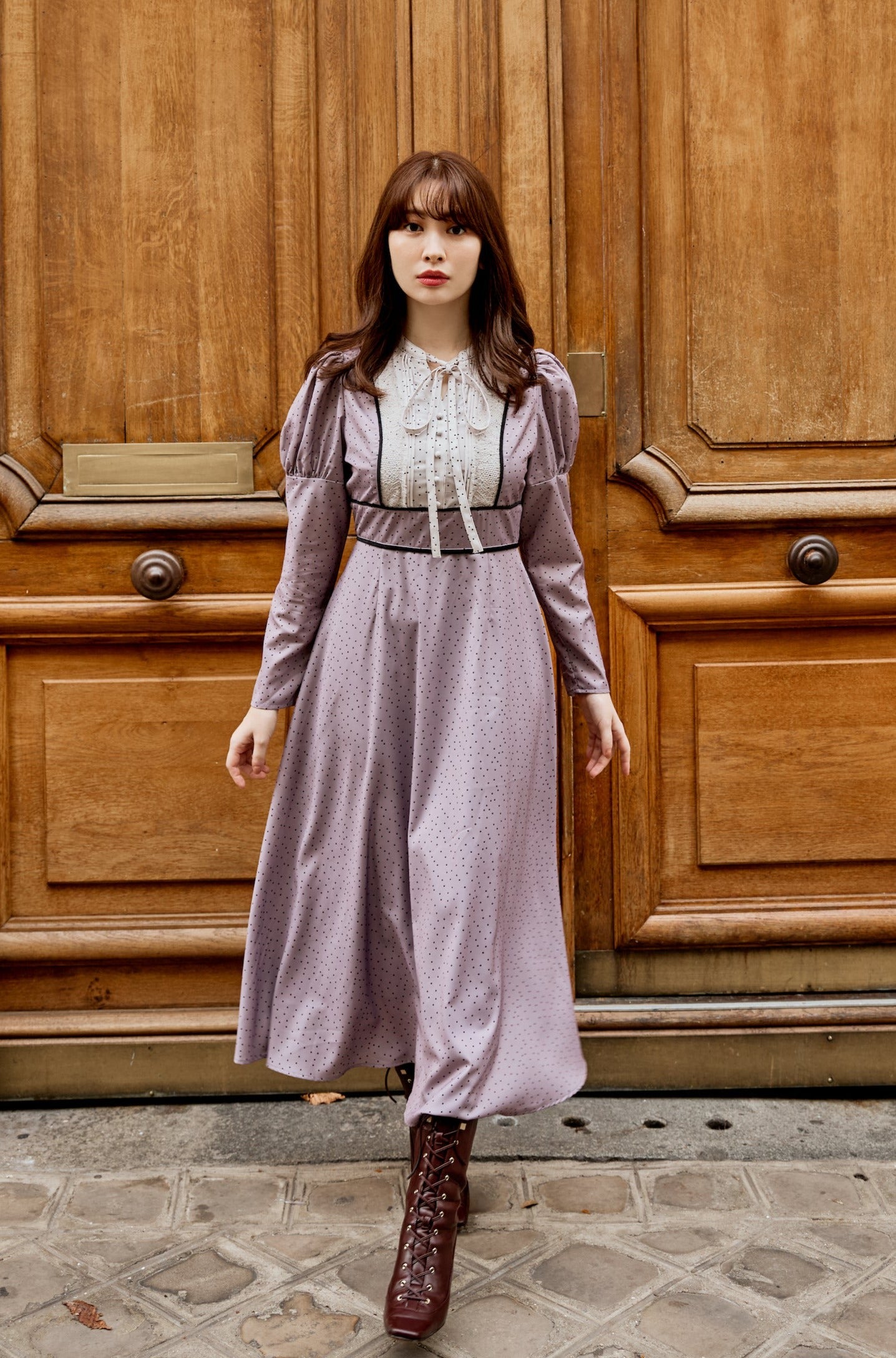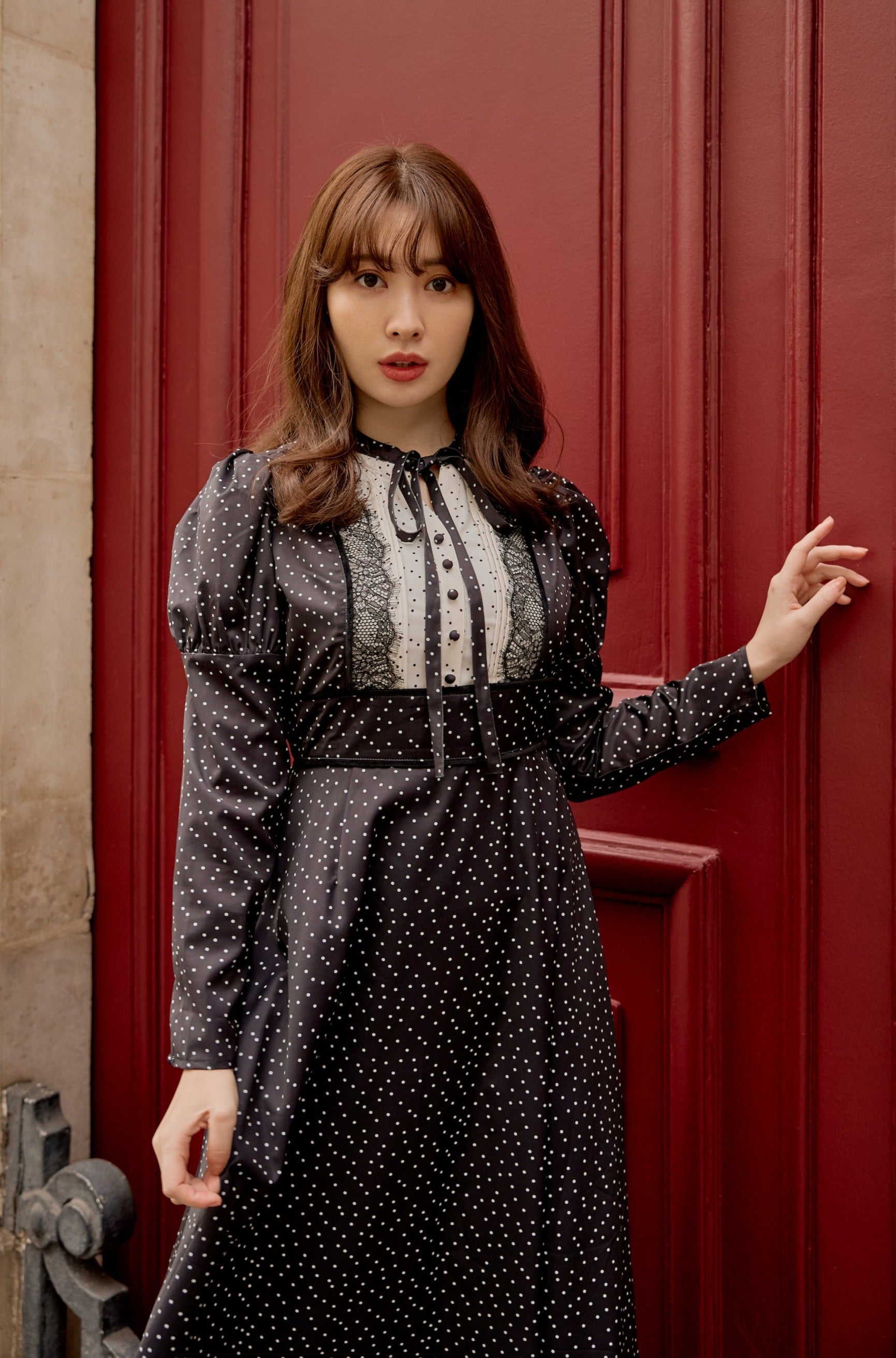 2トーンのドットを掛け合わせた、洗練されたクラシカルな印象のロングドレス。