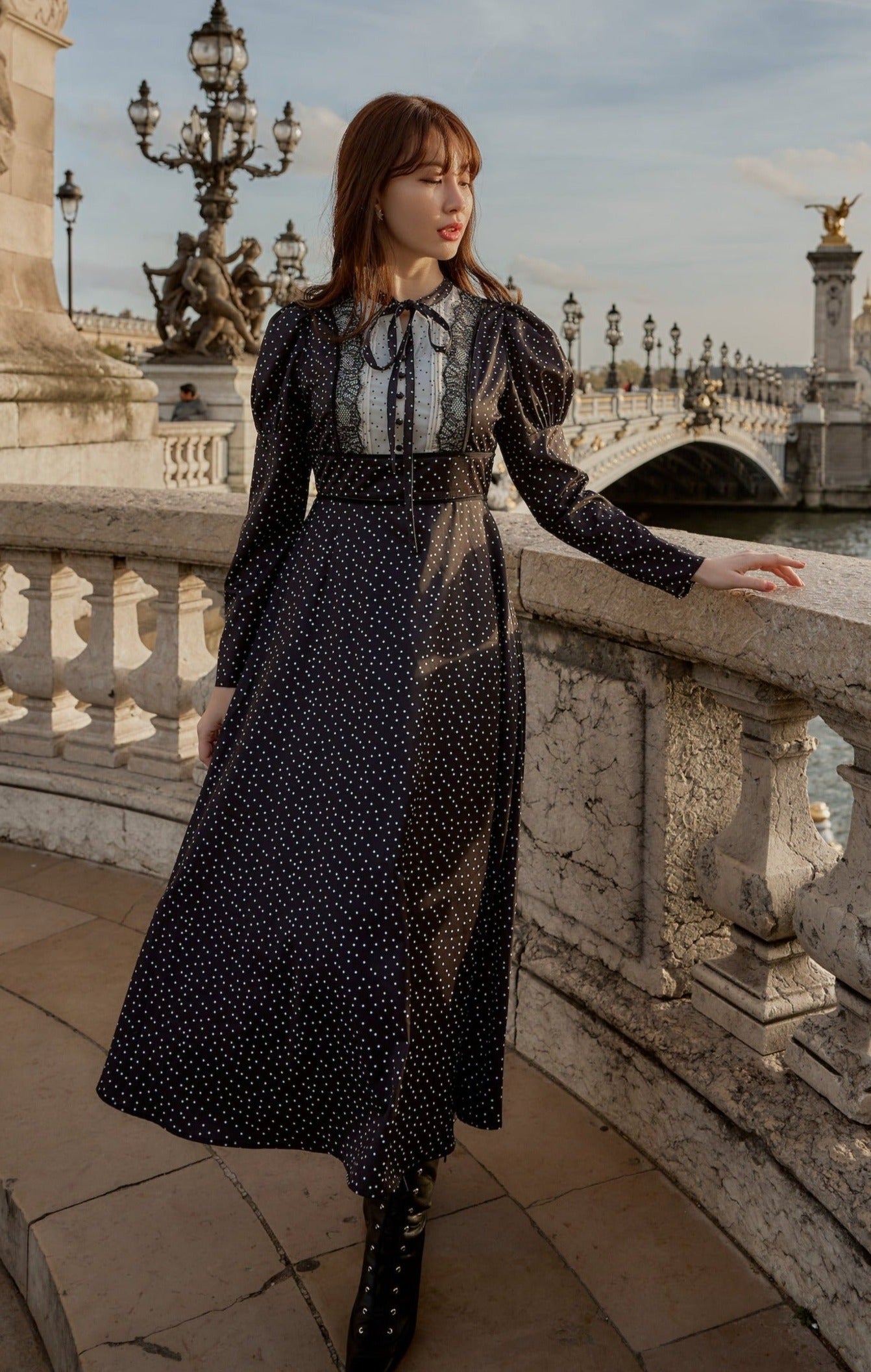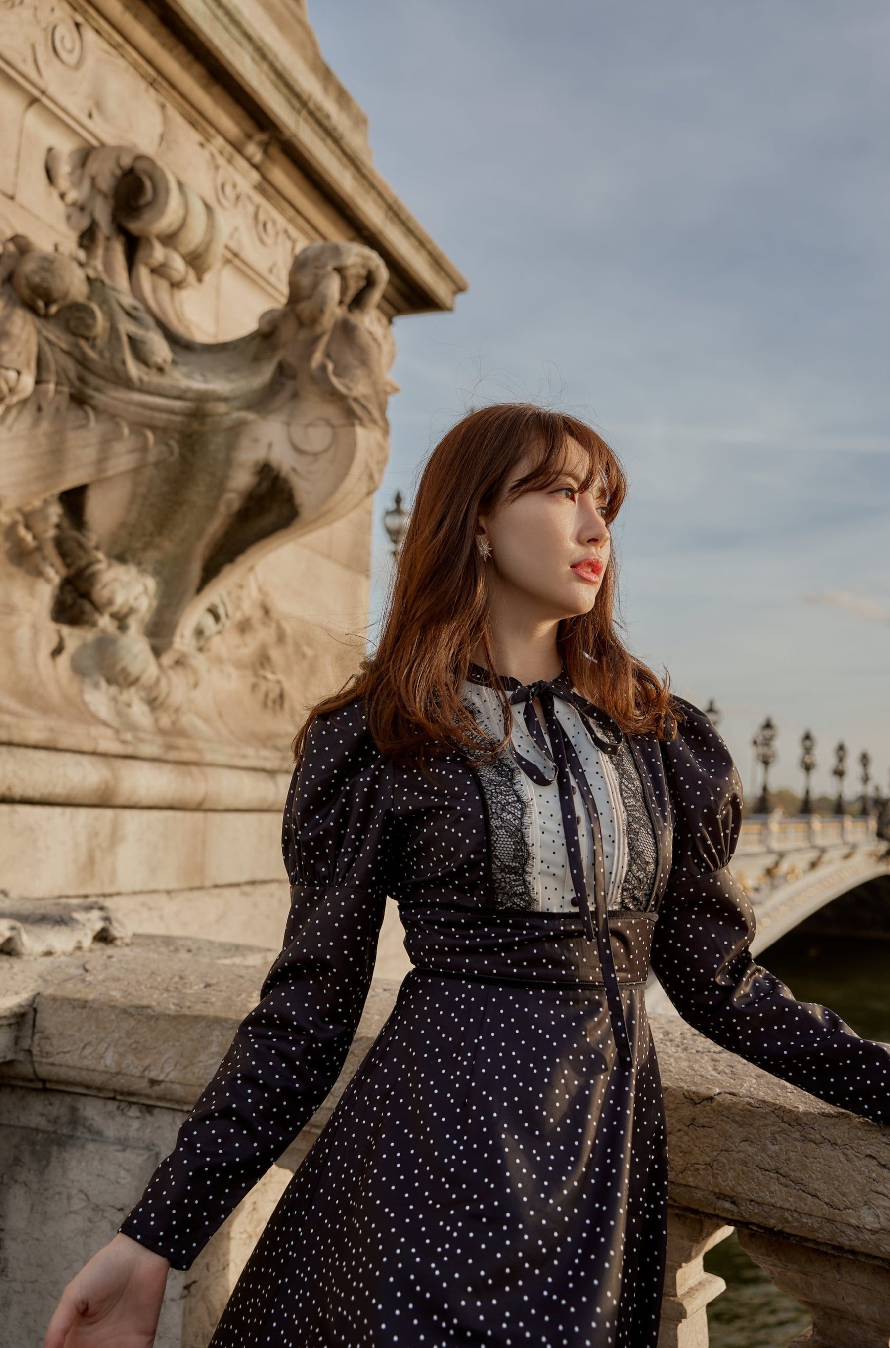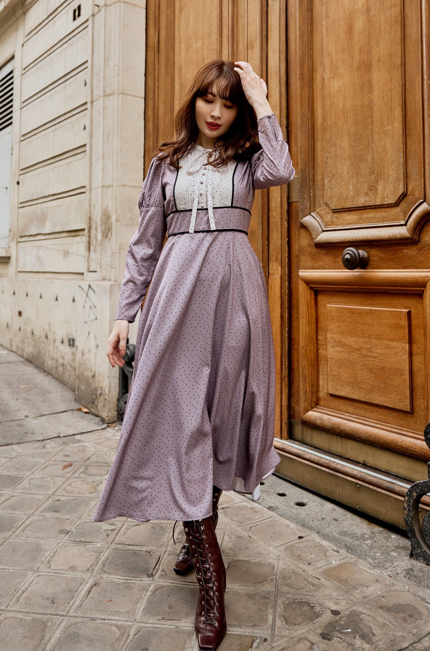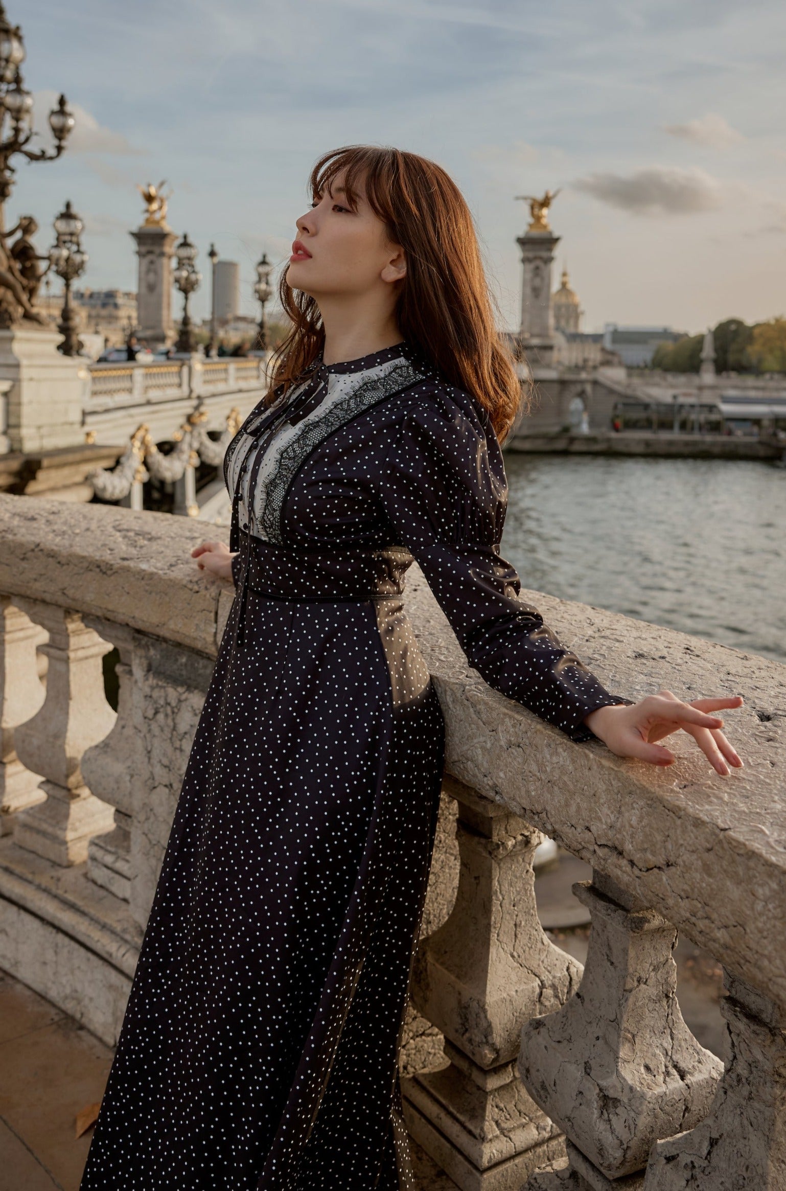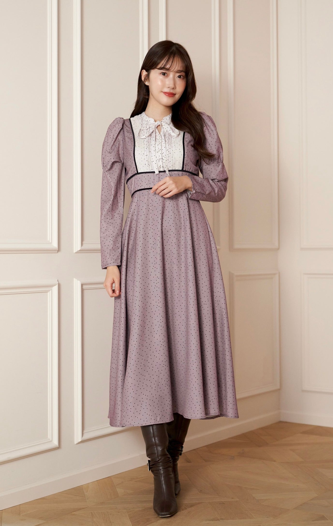 2トーンのドットを掛け合わせた、洗練されたクラシカルな印象のロングドレス。
