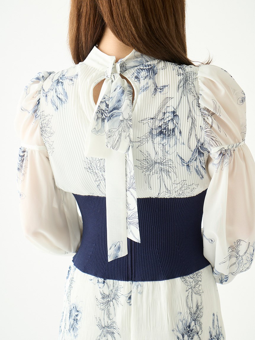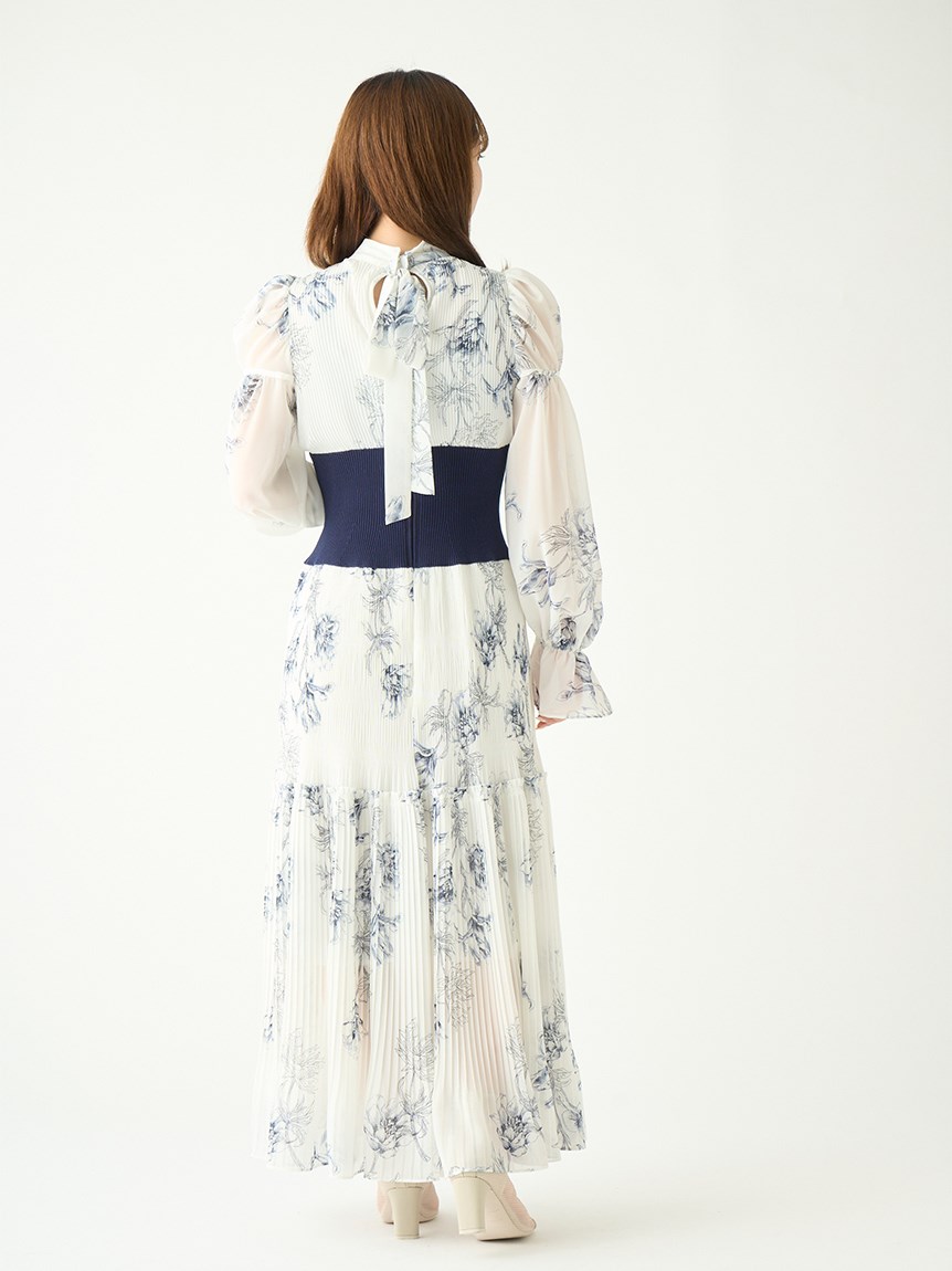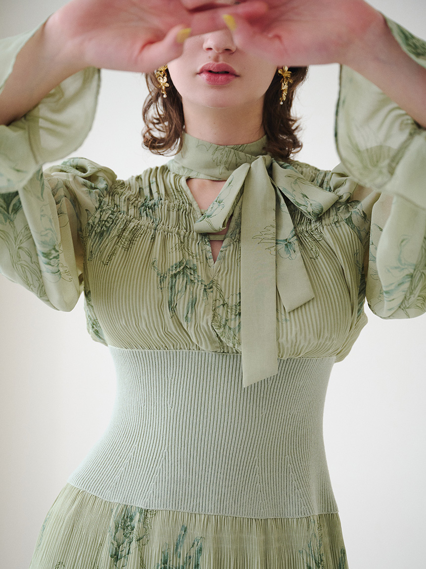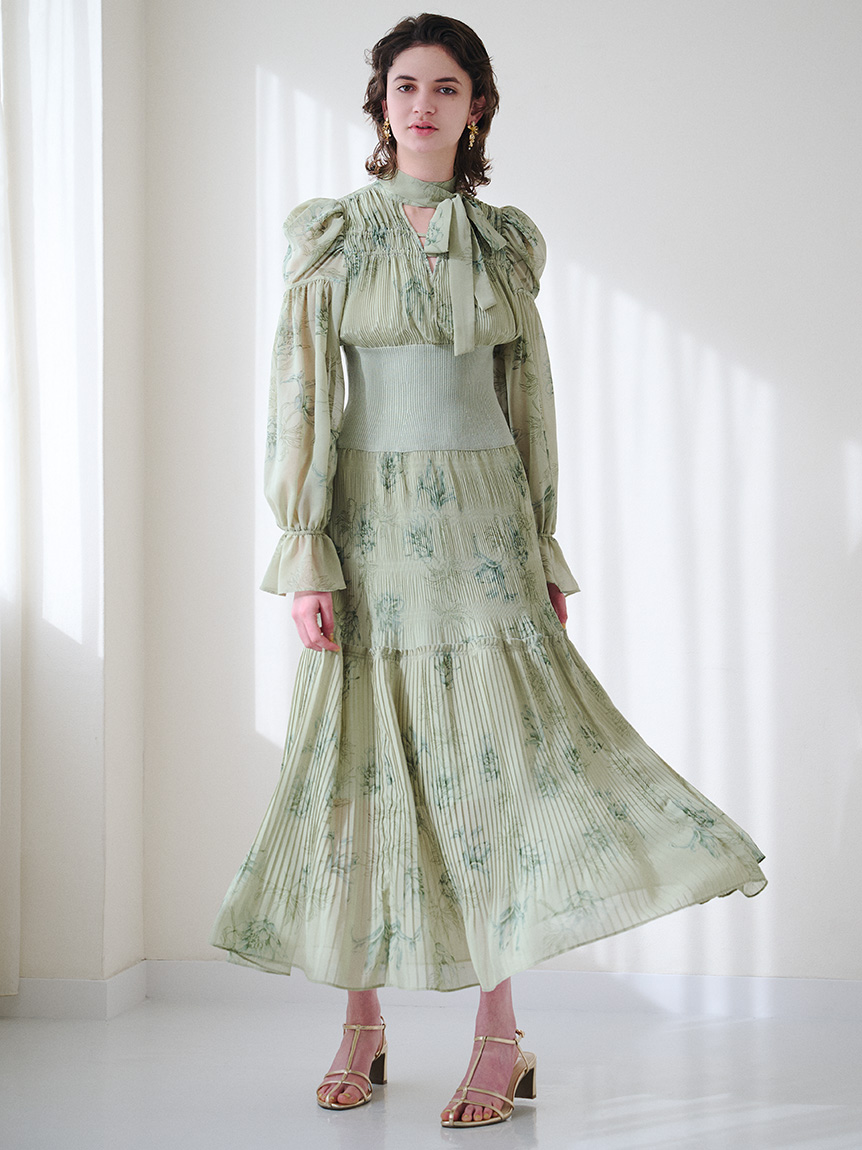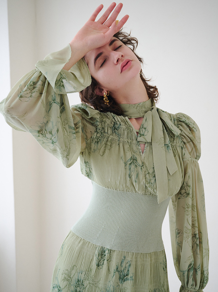 華やかなオリジナルプリントが春ムードをもたらすワンピース。マジョリカプリーツをふんだんに施すことでロマンティックに仕上げています。モード感のあるウエストリブの切り替えがボディにメリハリを与え、スタイルアップ効果を発揮。バックネックには愛らしいリボンをあしらい、360度どこから見ても女性らしさを演出しています。