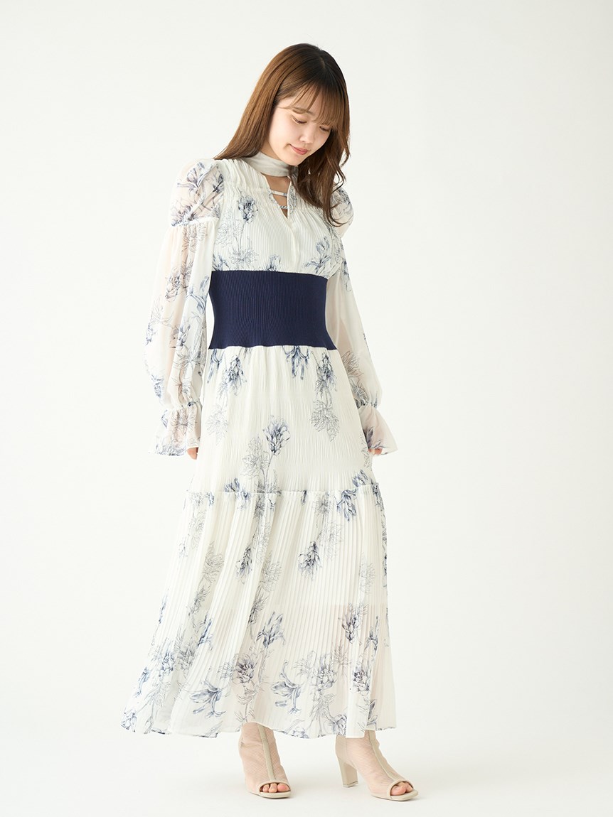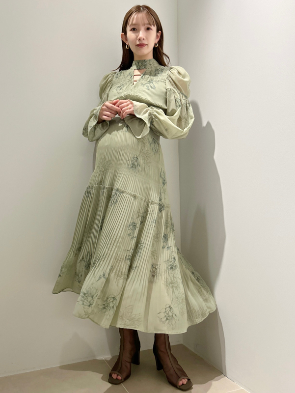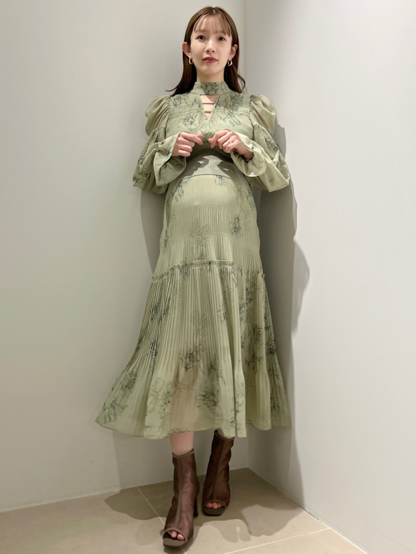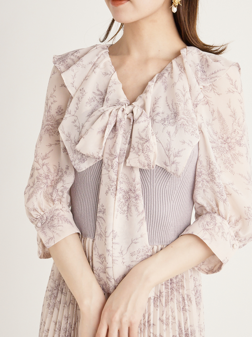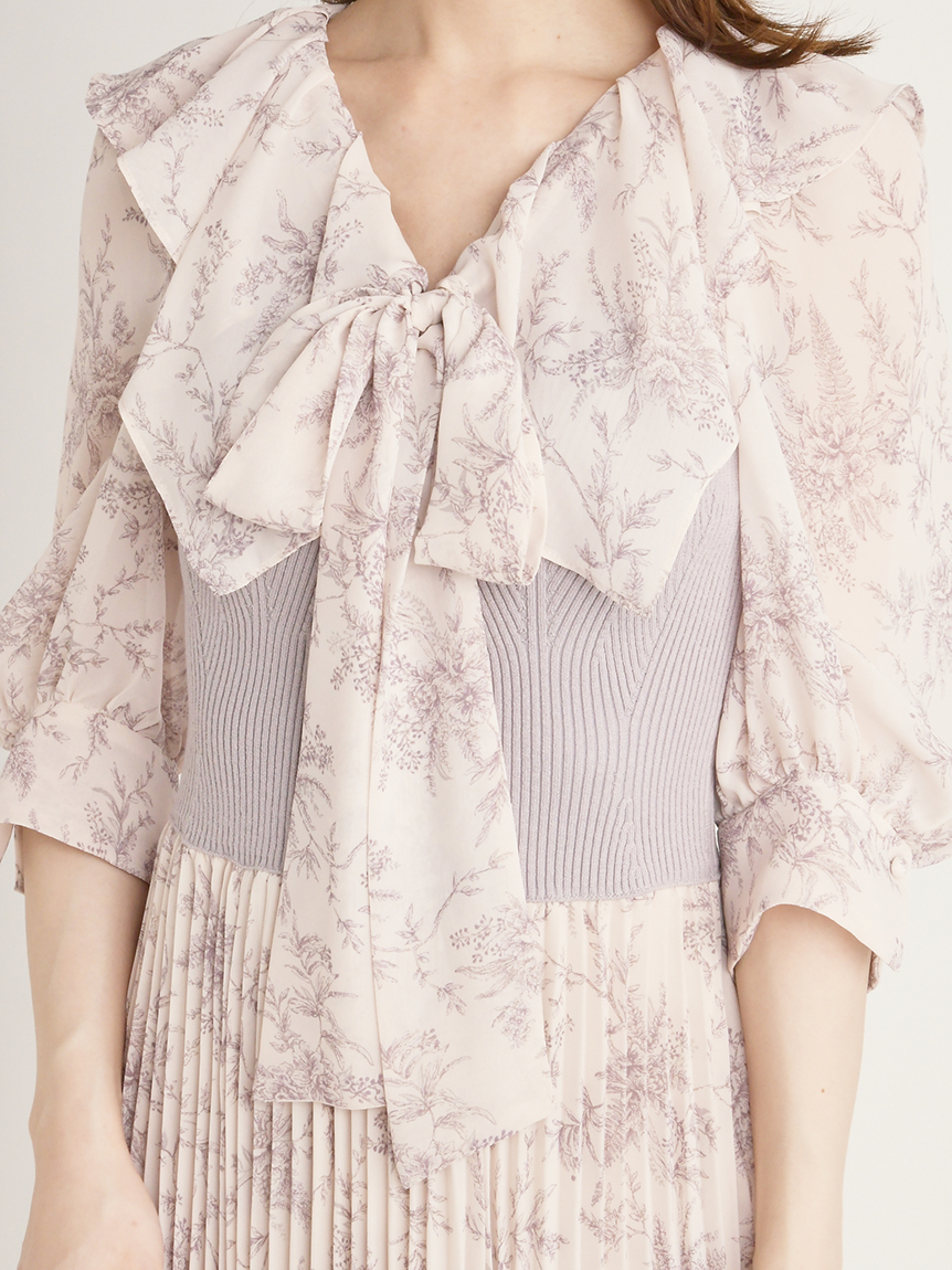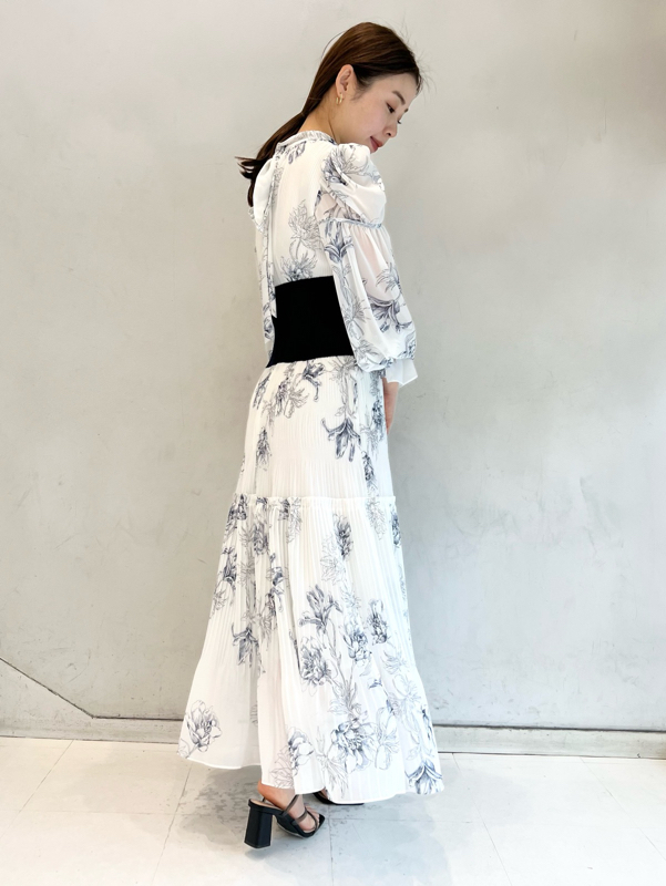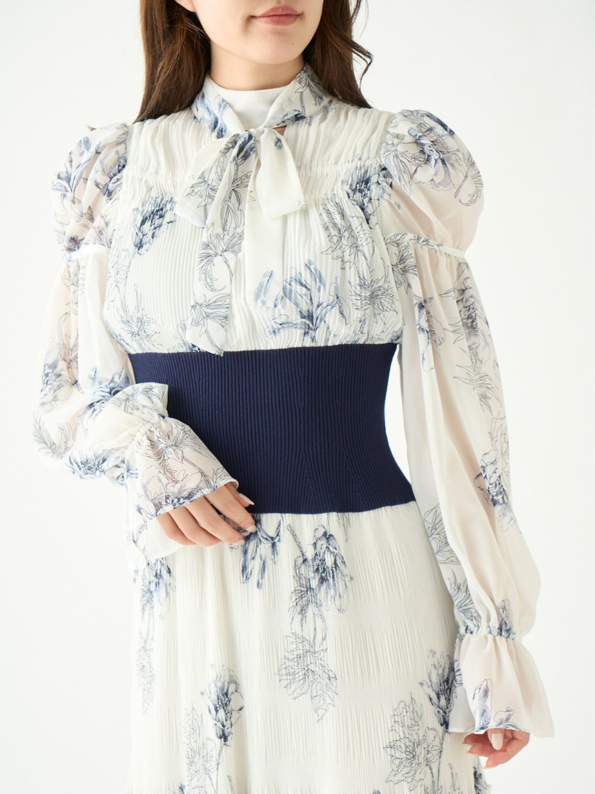 華やかなオリジナルプリントが春ムードをもたらすワンピース。マジョリカプリーツをふんだんに施すことでロマンティックに仕上げています。モード感のあるウエストリブの切り替えがボディにメリハリを与え、スタイルアップ効果を発揮。バックネックには愛らしいリボンをあしらい、360度どこから見ても女性らしさを演出しています。