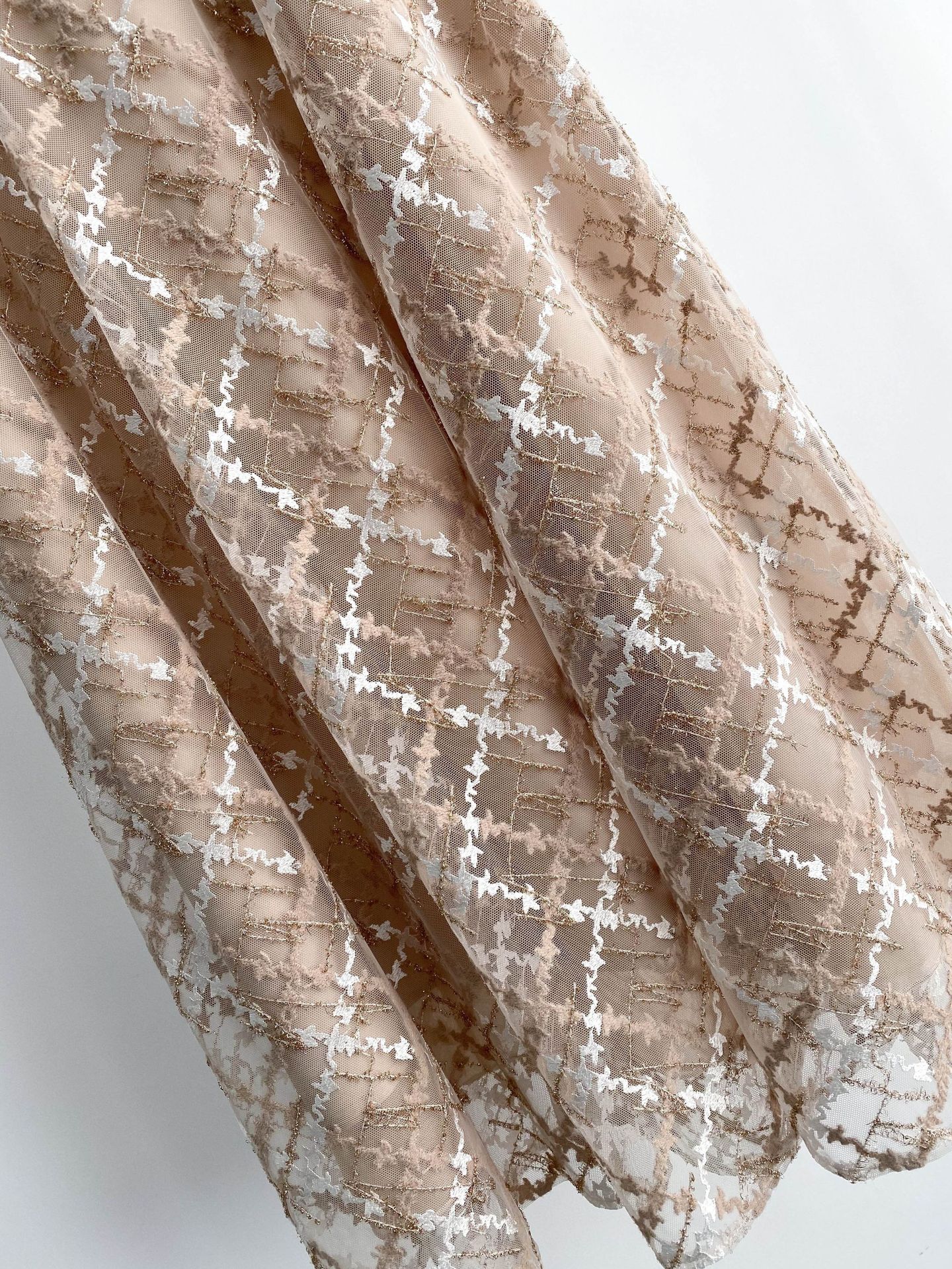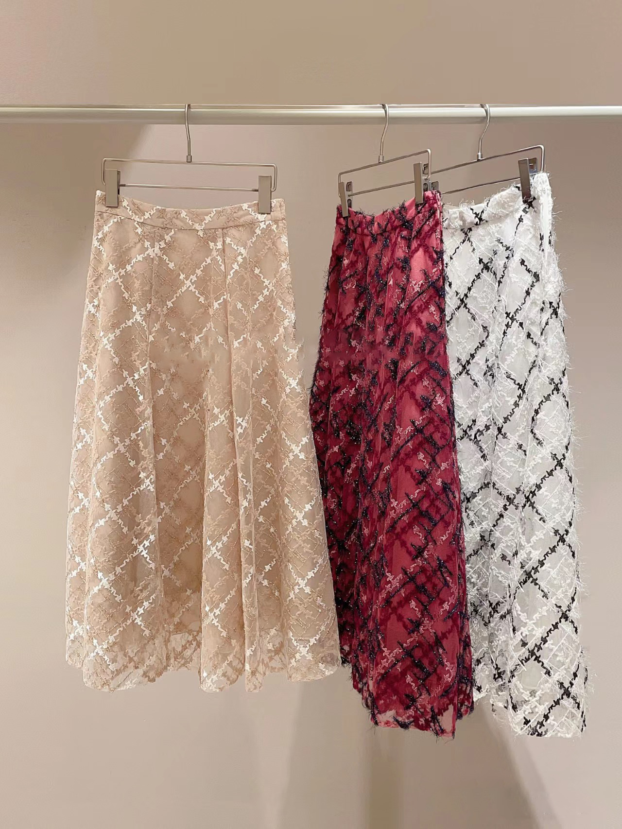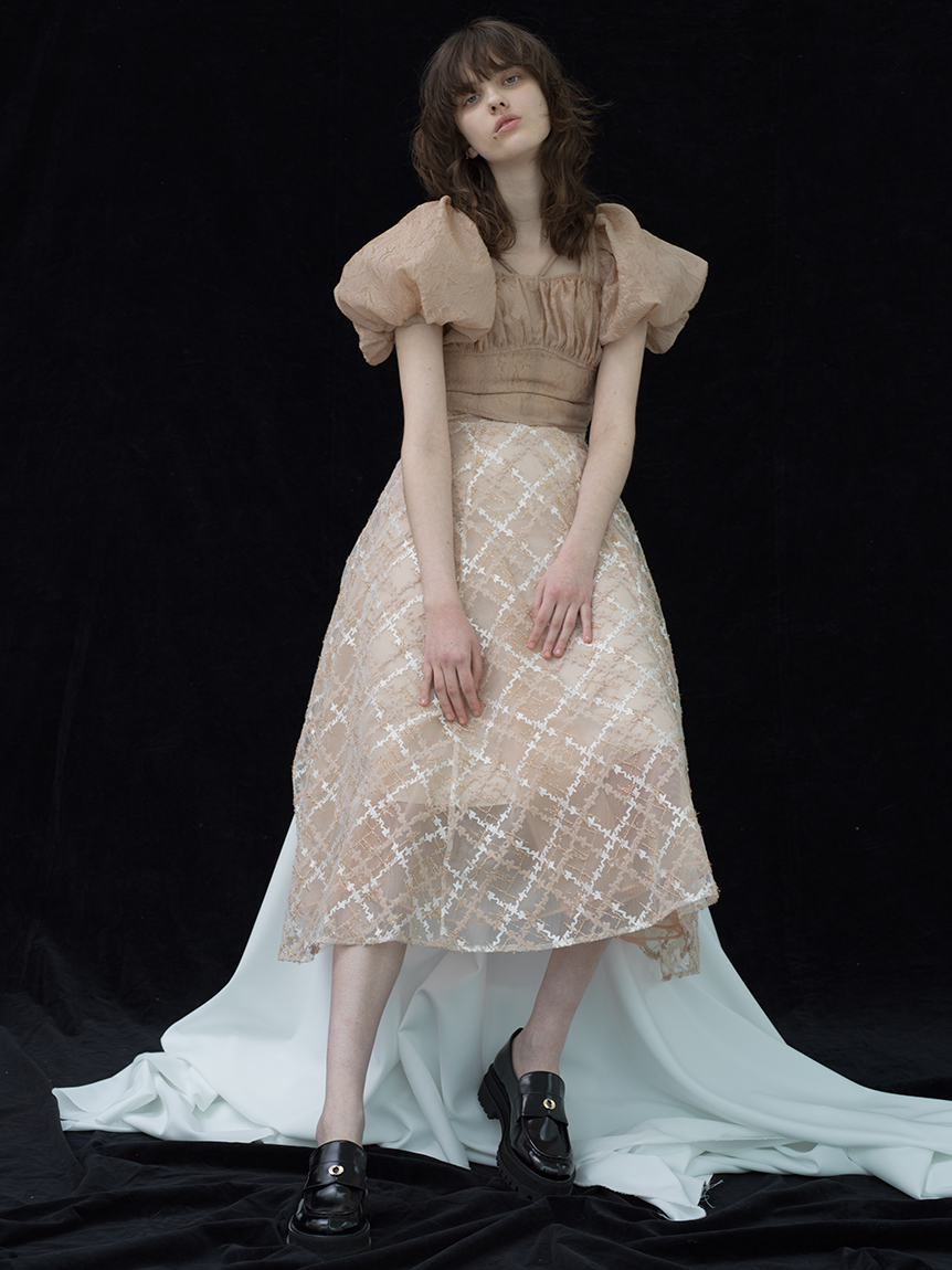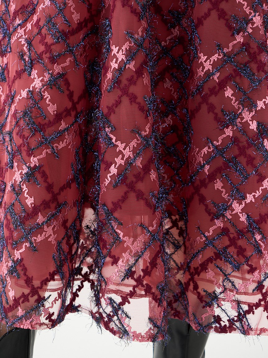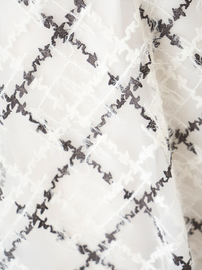 繊細なチュールに刺繍を施しチェック柄を表現しました。バイカラーでモード感のあるホワイト、女性らしい淡いカラートーンのピンクベージュ、華やかで存在感のあるレッドの3色展開です。