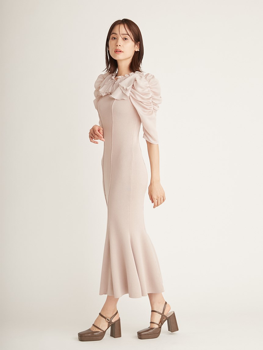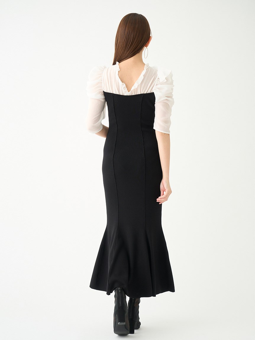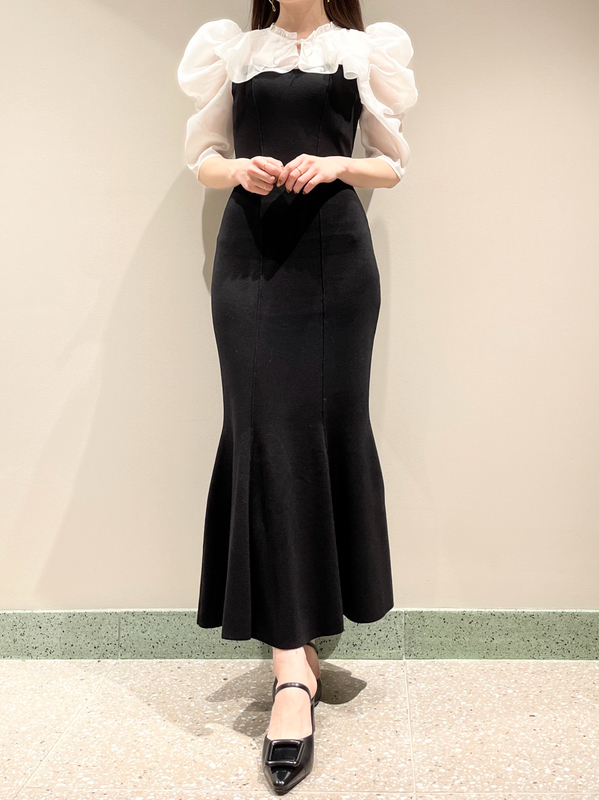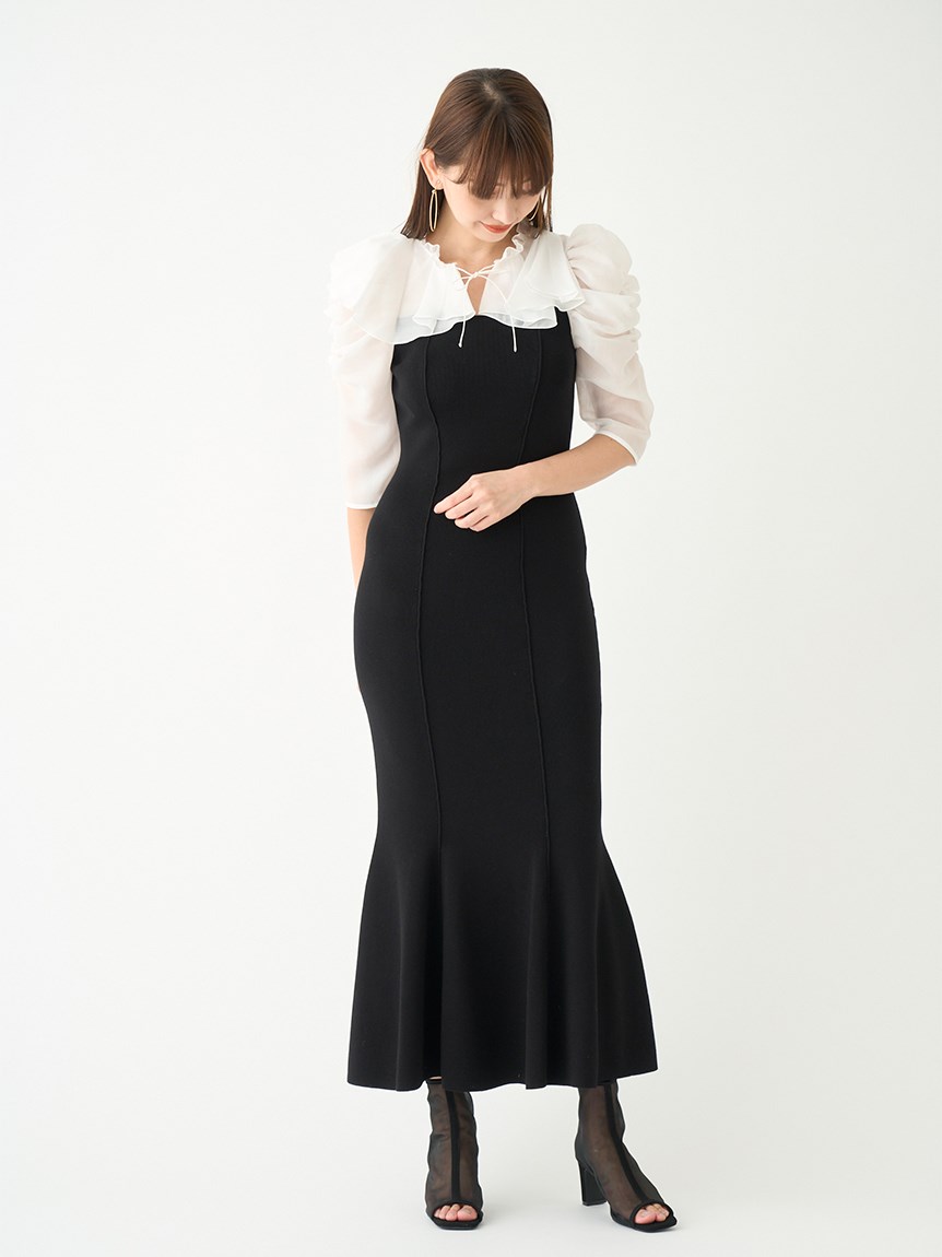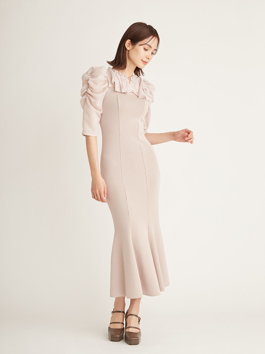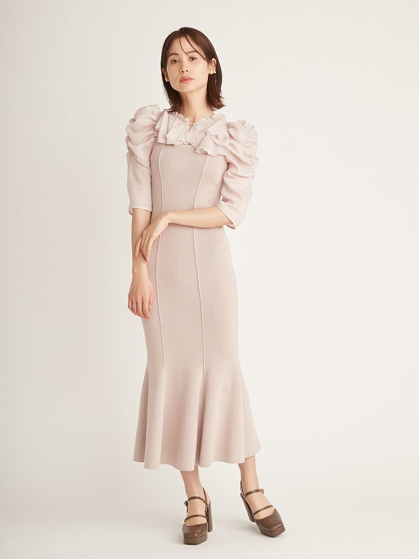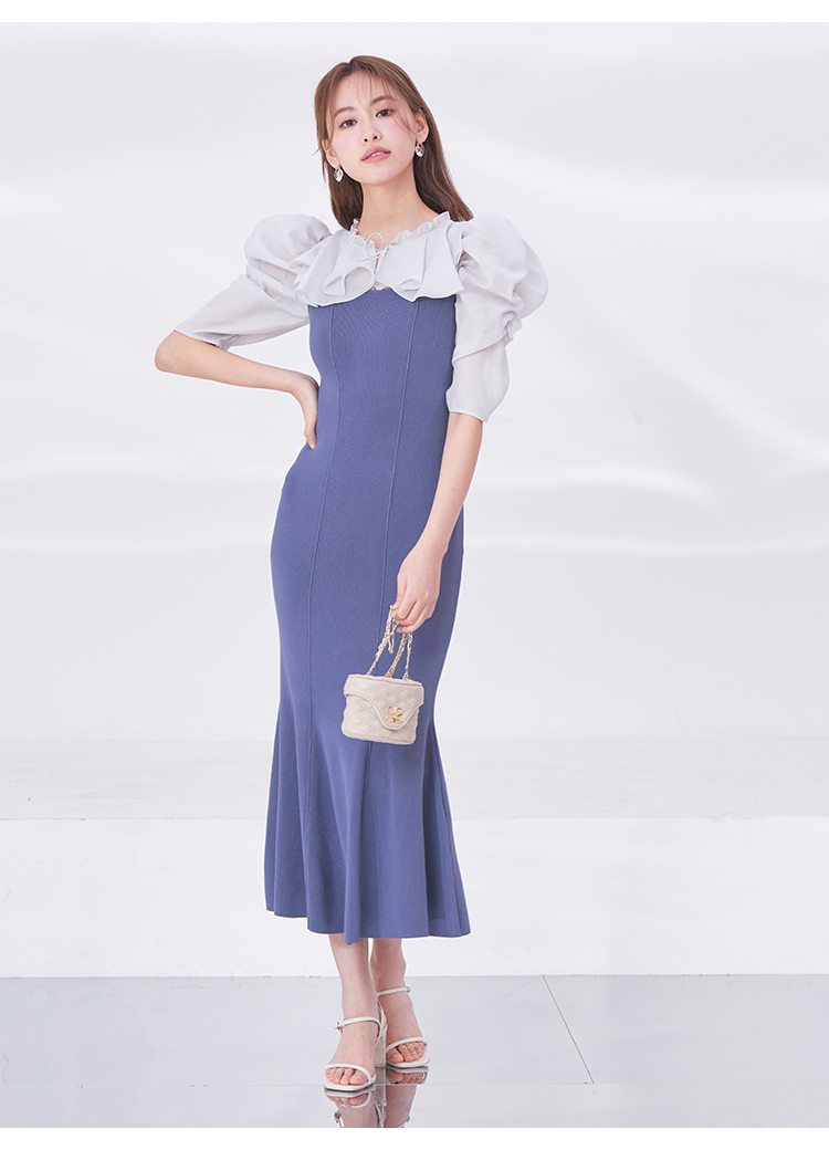 インにフリルブラウスを合わせているかのような、ドッキングデザインのニットワンピース。ギャザーを効かせたボリュームスリーブとエレガントなフリルが華やかさを演出しています。フィット感のあるマーメイドシルエットが女性らしさを引き立てる秘訣。ボディラインを美しく魅せるメリハリラインがスタイルアップを叶えてくれます。
