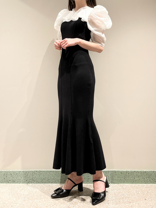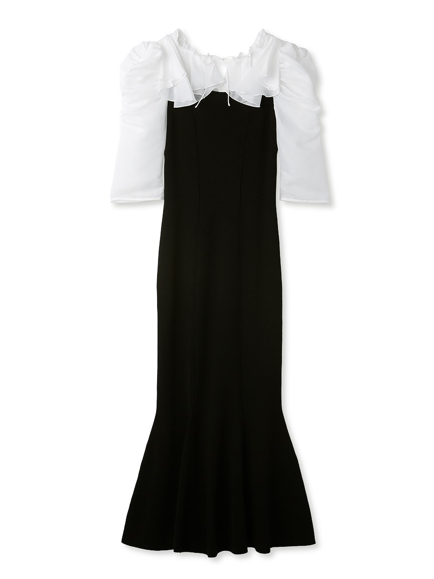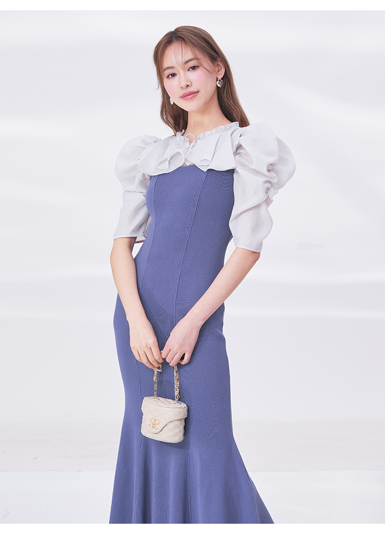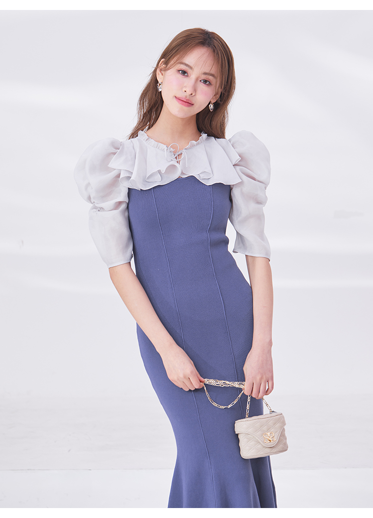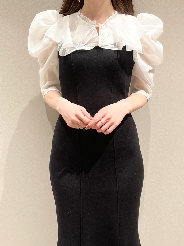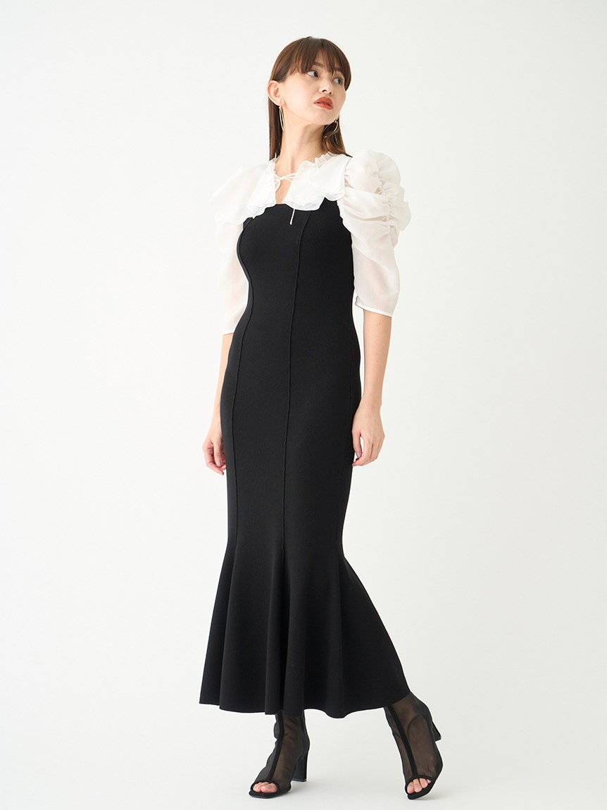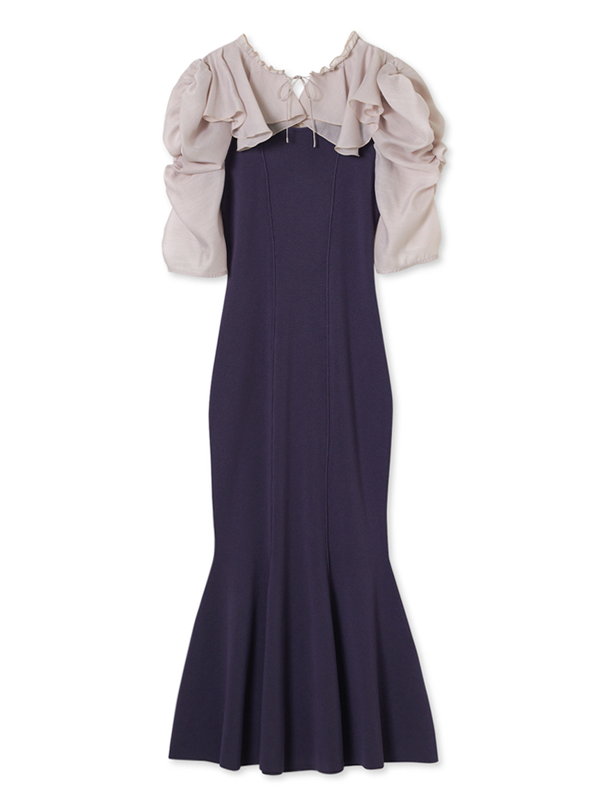 インにフリルブラウスを合わせているかのような、ドッキングデザインのニットワンピース。ギャザーを効かせたボリュームスリーブとエレガントなフリルが華やかさを演出しています。フィット感のあるマーメイドシルエットが女性らしさを引き立てる秘訣。ボディラインを美しく魅せるメリハリラインがスタイルアップを叶えてくれます。