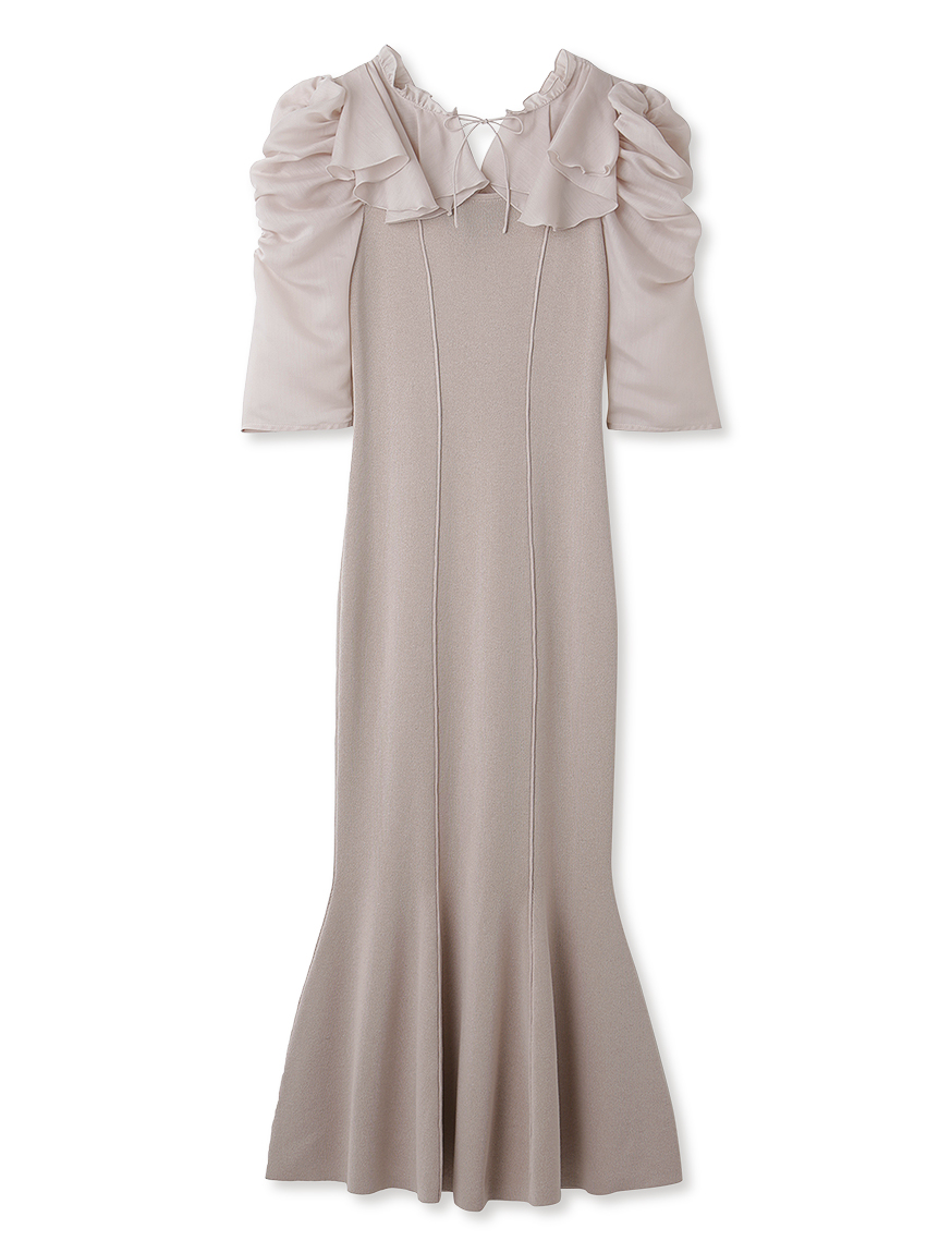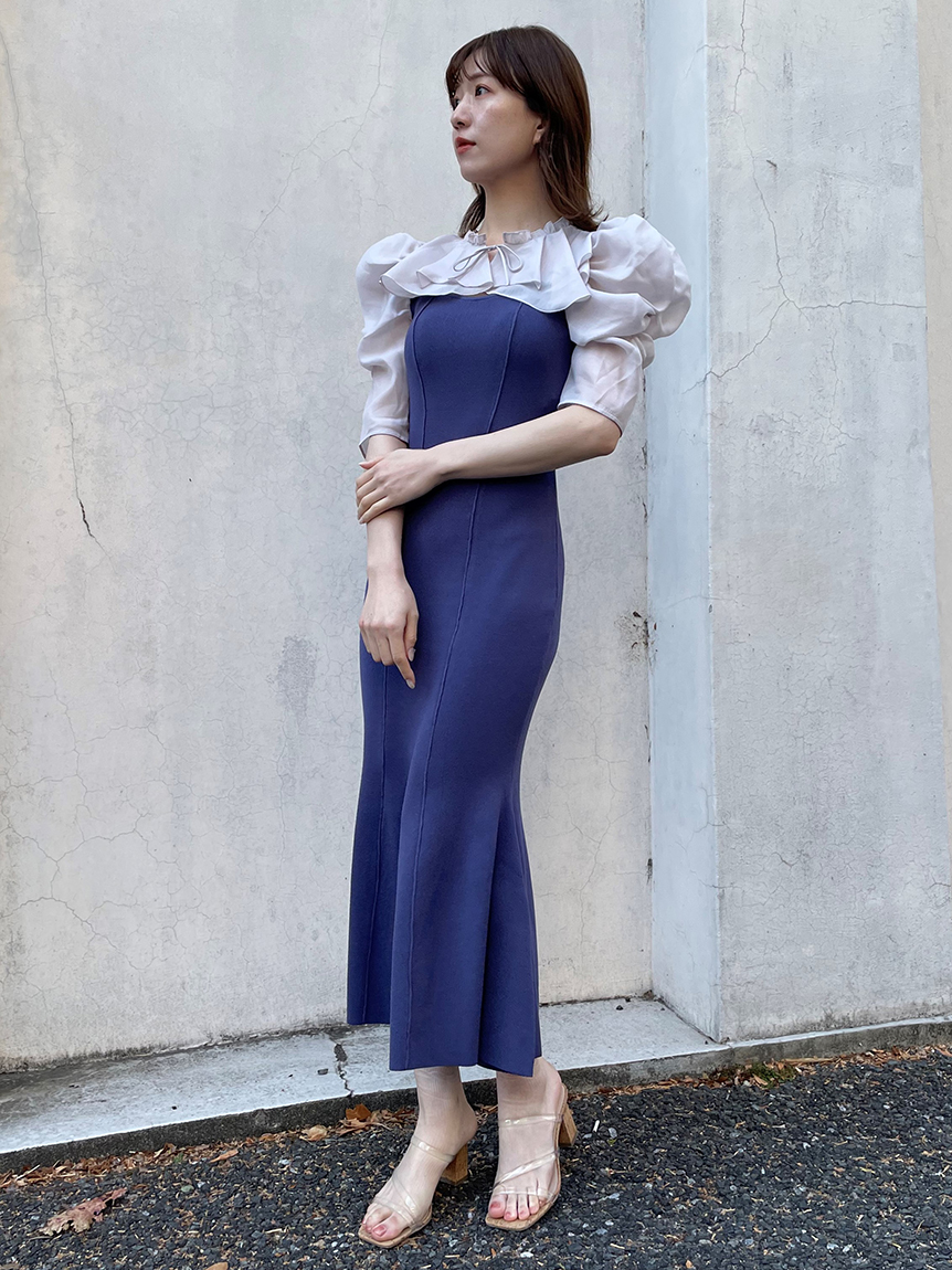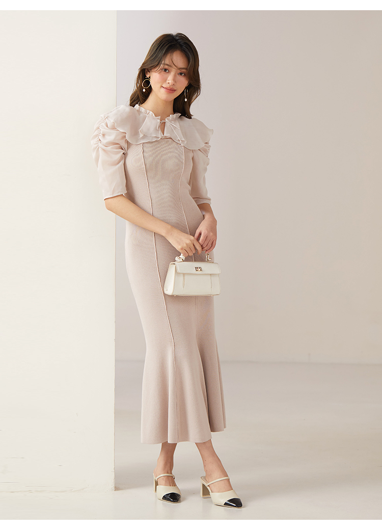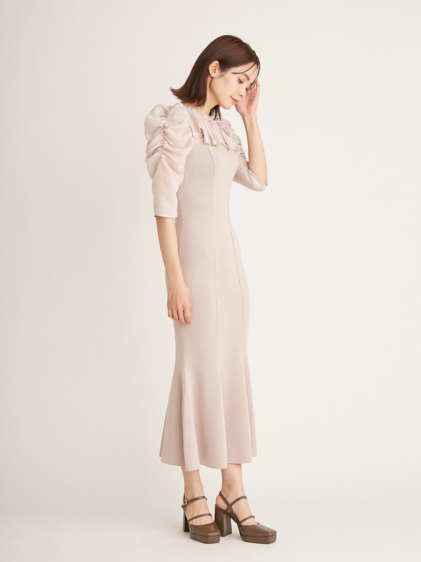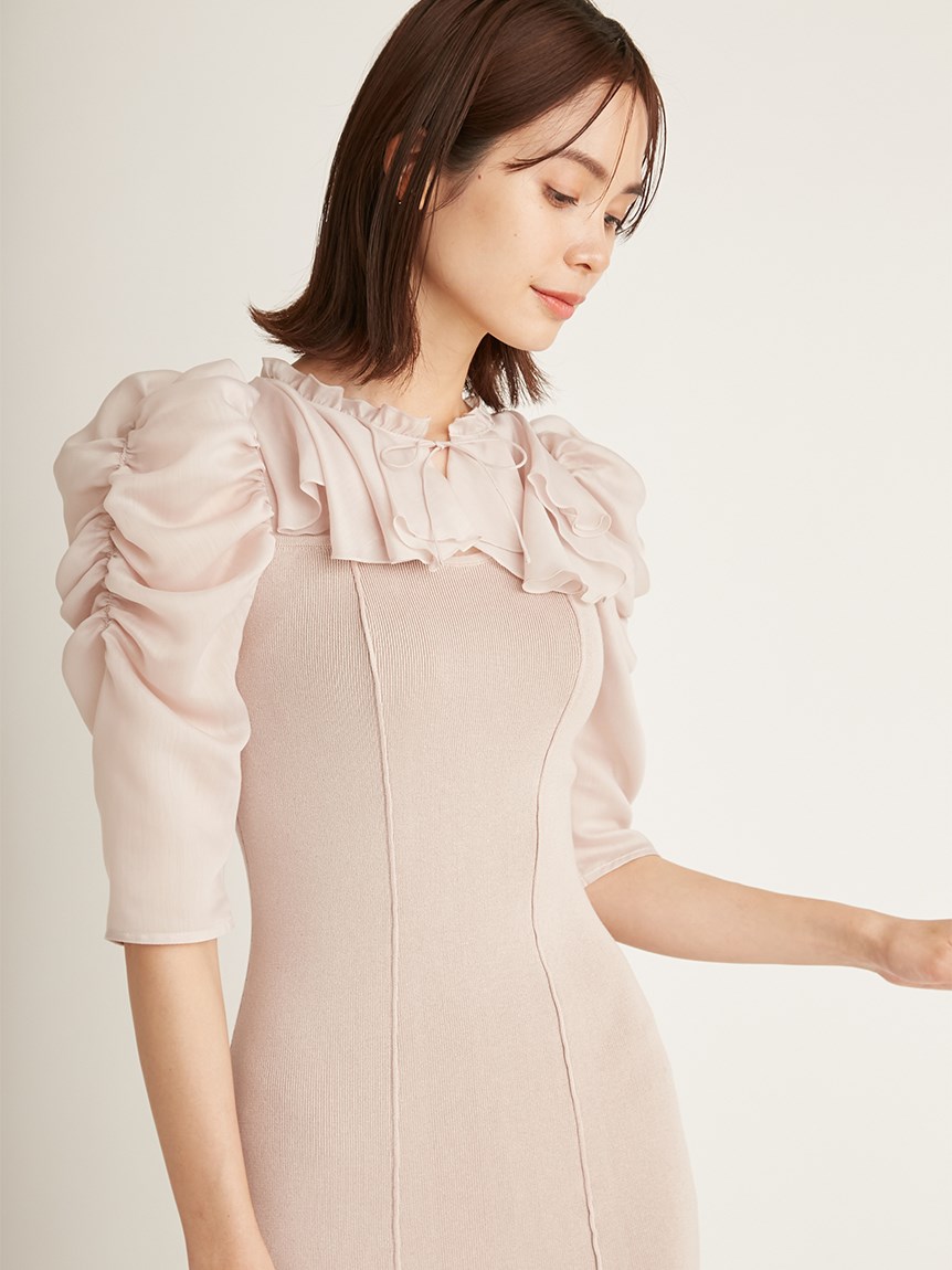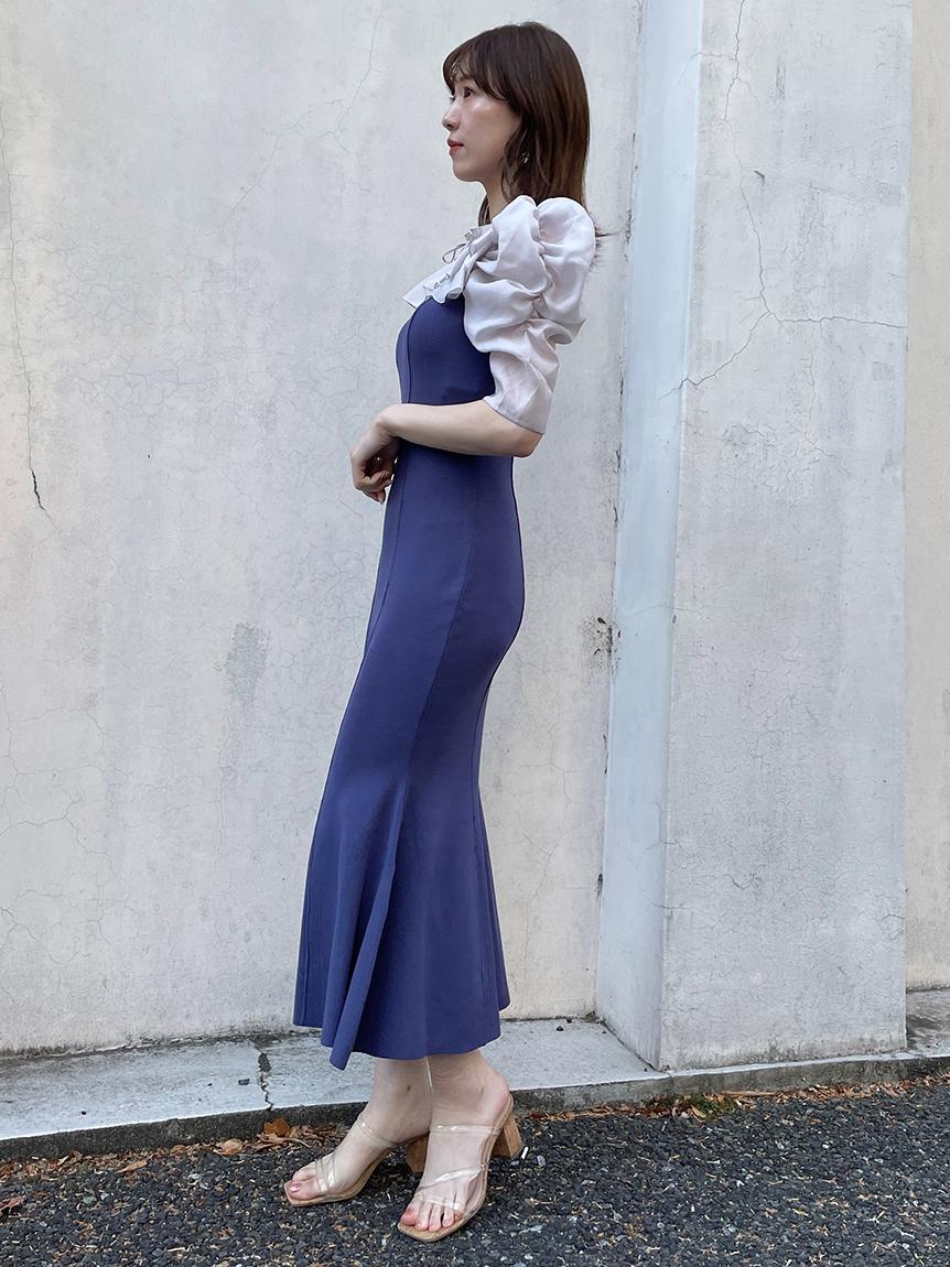 インにフリルブラウスを合わせているかのような、ドッキングデザインのニットワンピース。ギャザーを効かせたボリュームスリーブとエレガントなフリルが華やかさを演出しています。フィット感のあるマーメイドシルエットが女性らしさを引き立てる秘訣。ボディラインを美しく魅せるメリハリラインがスタイルアップを叶えてくれます。