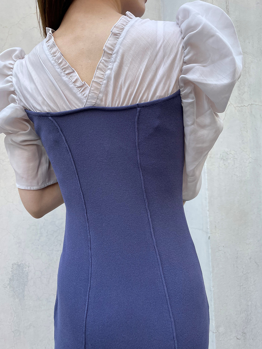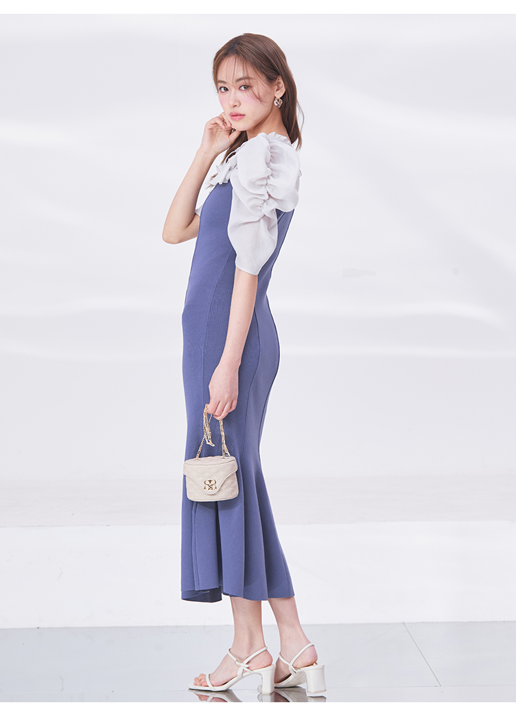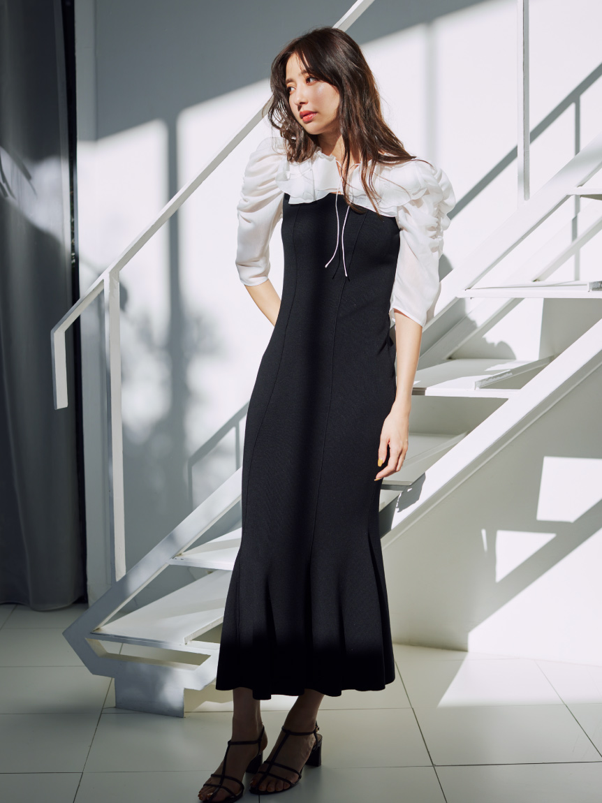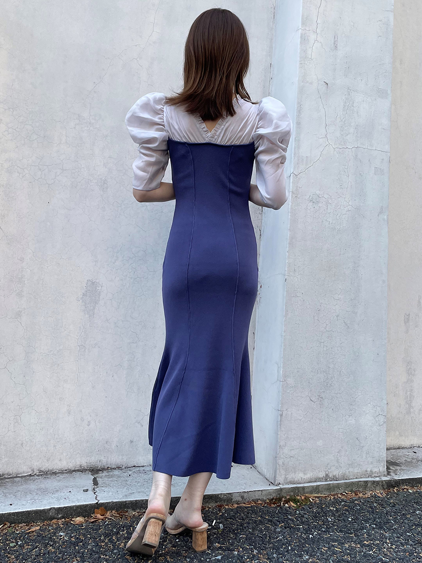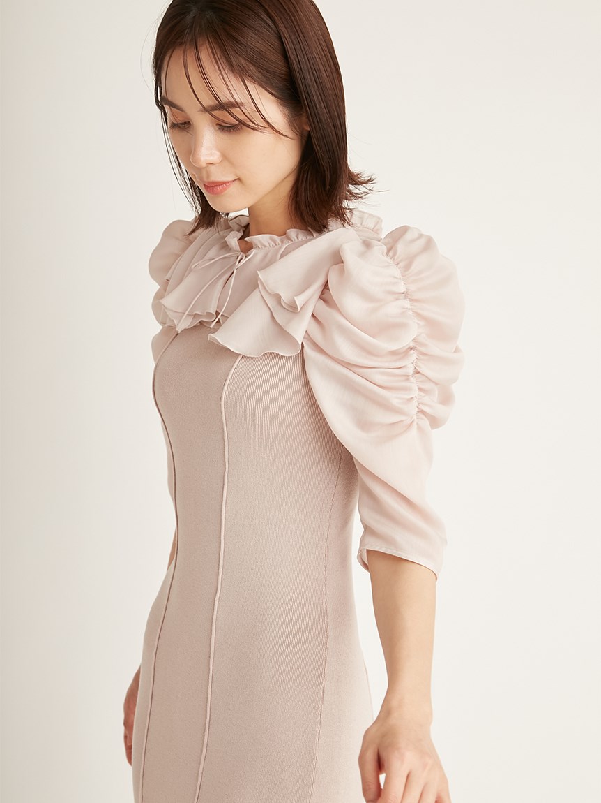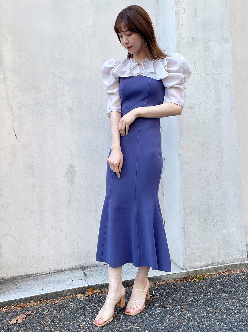 インにフリルブラウスを合わせているかのような、ドッキングデザインのニットワンピース。ギャザーを効かせたボリュームスリーブとエレガントなフリルが華やかさを演出しています。フィット感のあるマーメイドシルエットが女性らしさを引き立てる秘訣。ボディラインを美しく魅せるメリハリラインがスタイルアップを叶えてくれます。
