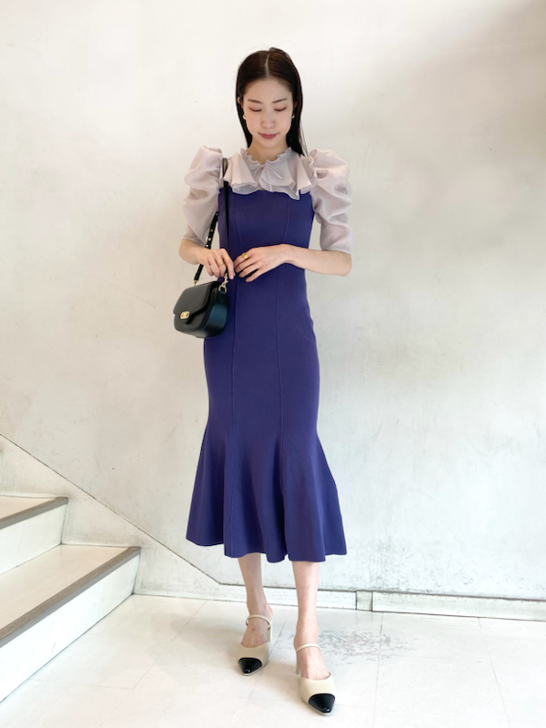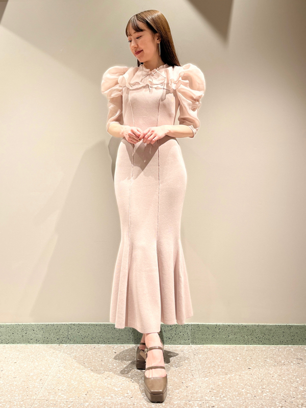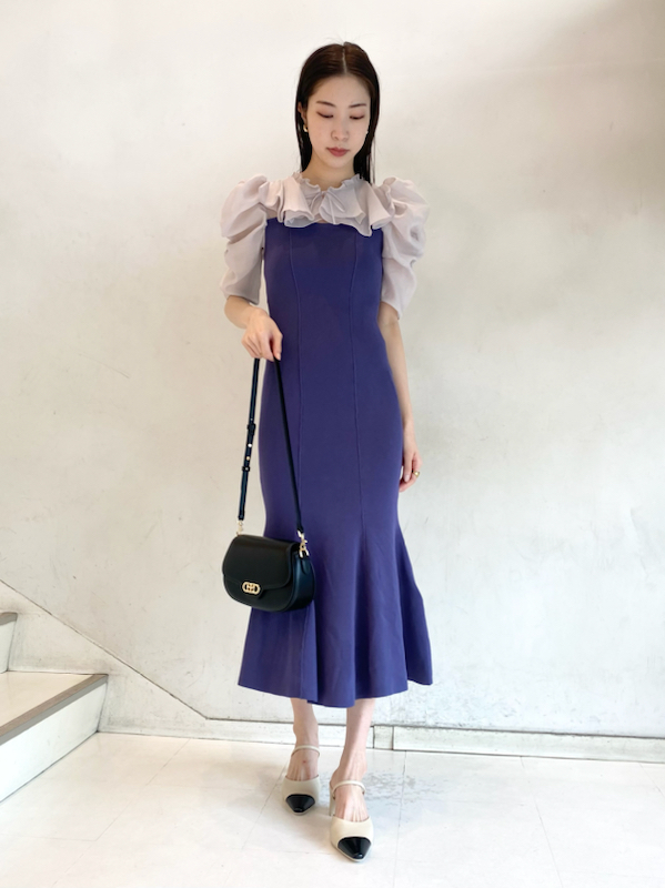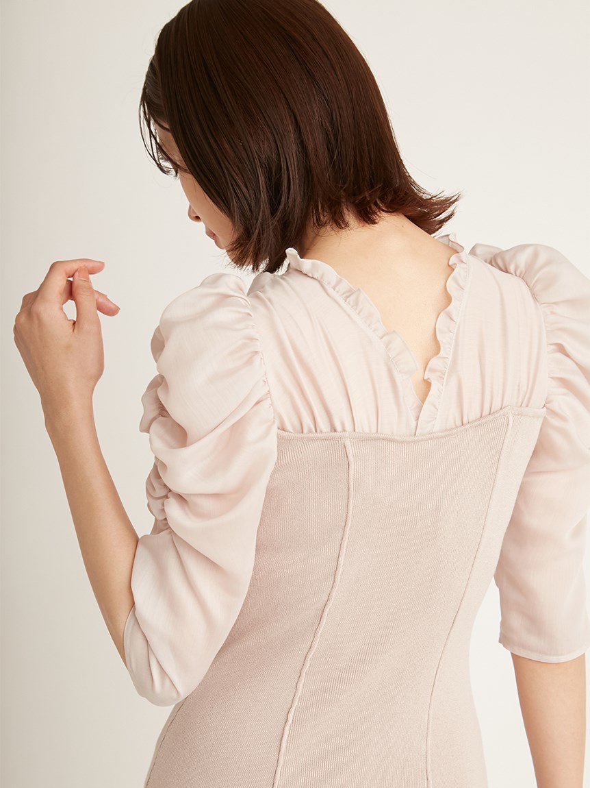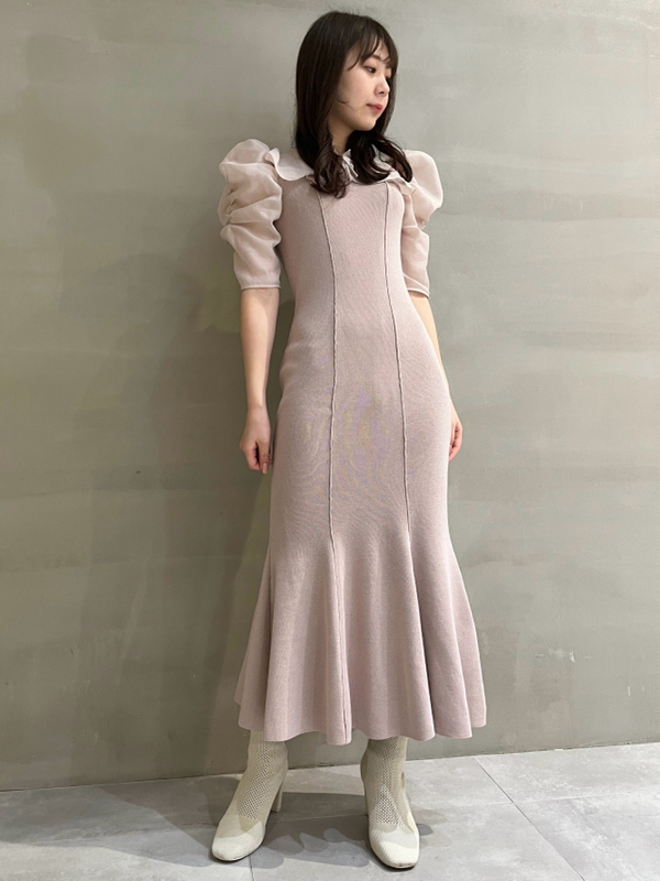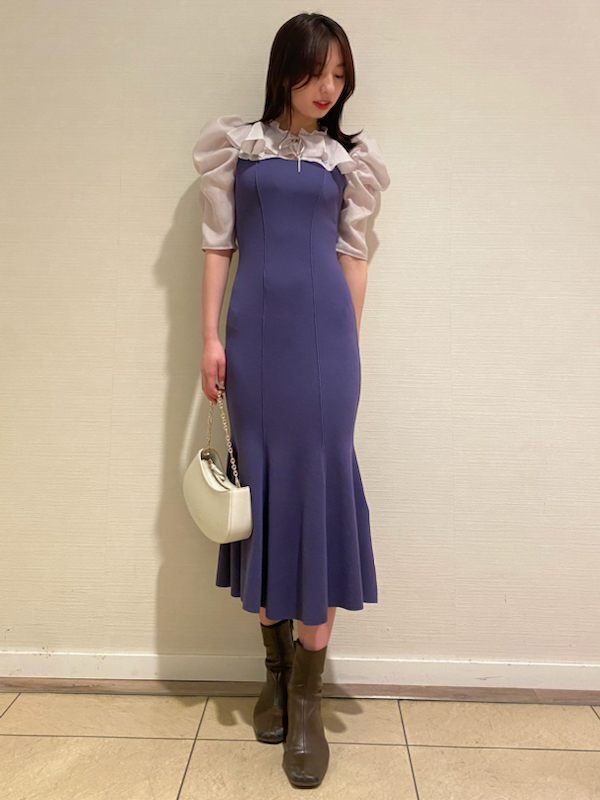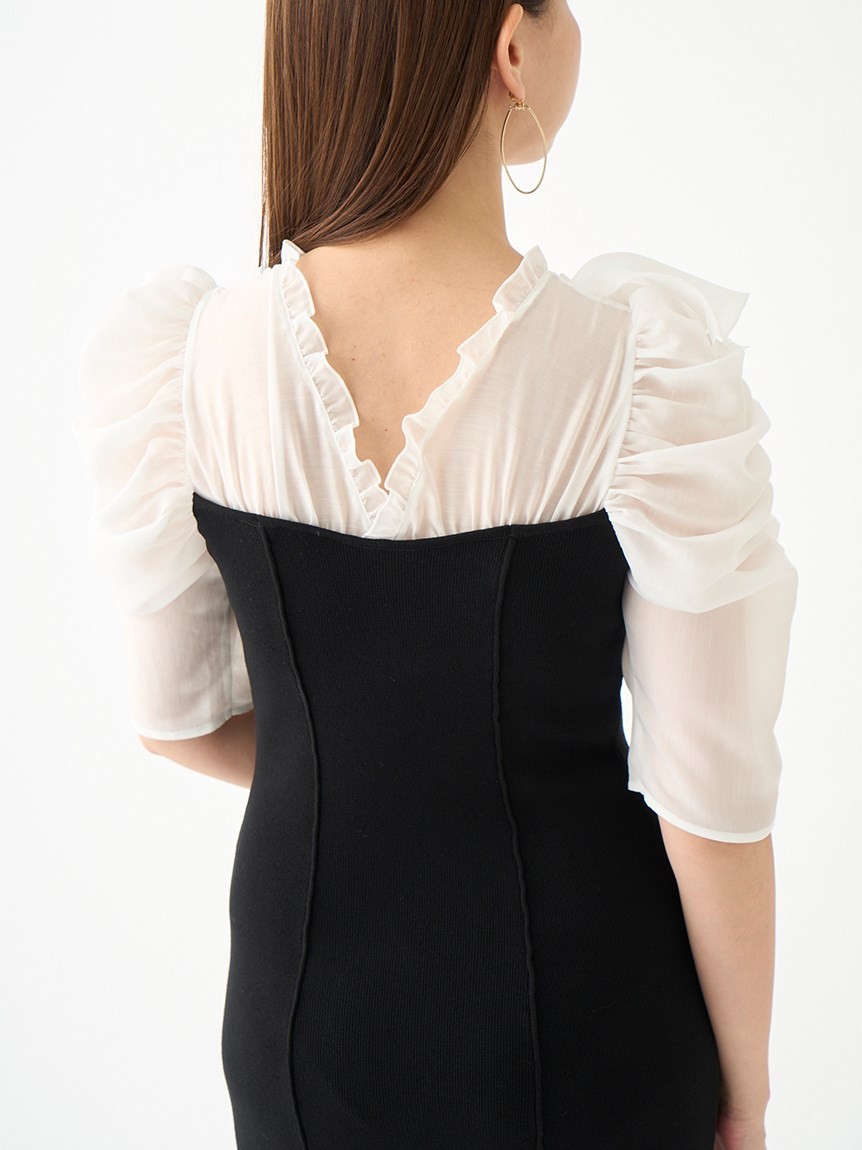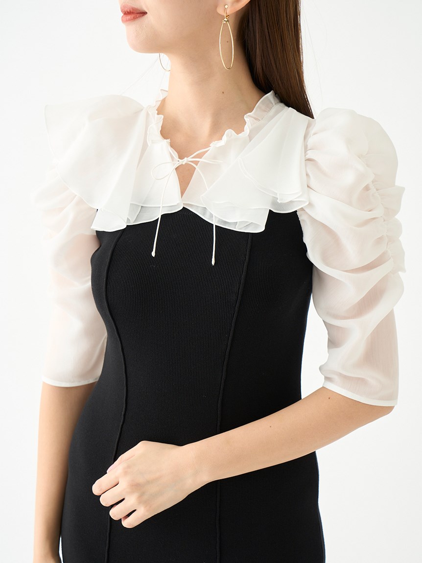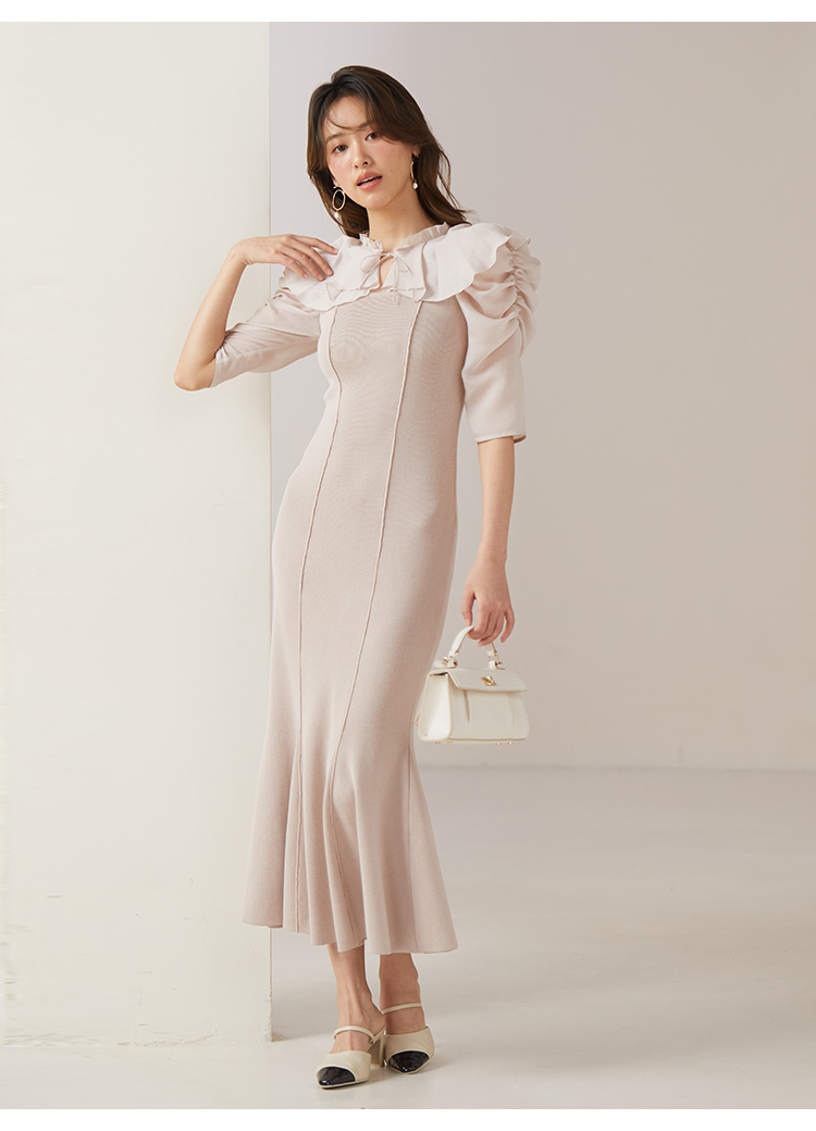 インにフリルブラウスを合わせているかのような、ドッキングデザインのニットワンピース。ギャザーを効かせたボリュームスリーブとエレガントなフリルが華やかさを演出しています。フィット感のあるマーメイドシルエットが女性らしさを引き立てる秘訣。ボディラインを美しく魅せるメリハリラインがスタイルアップを叶えてくれます。