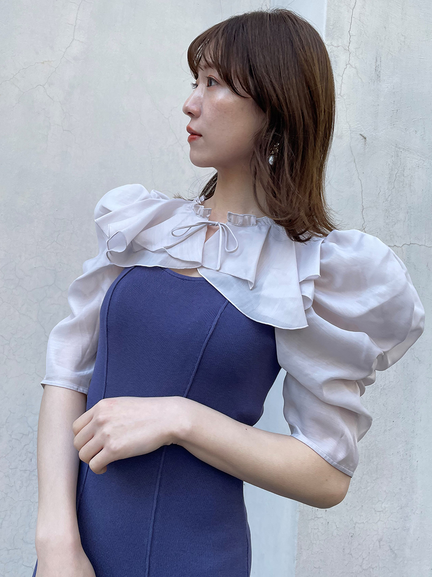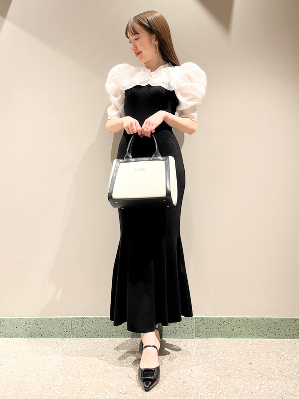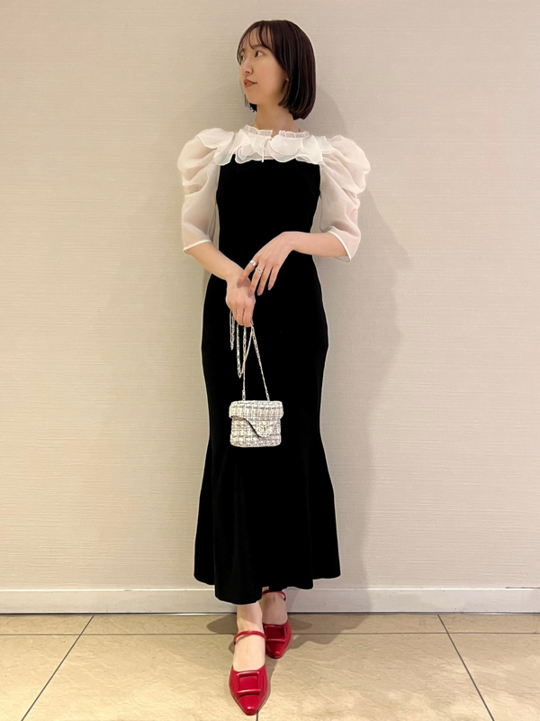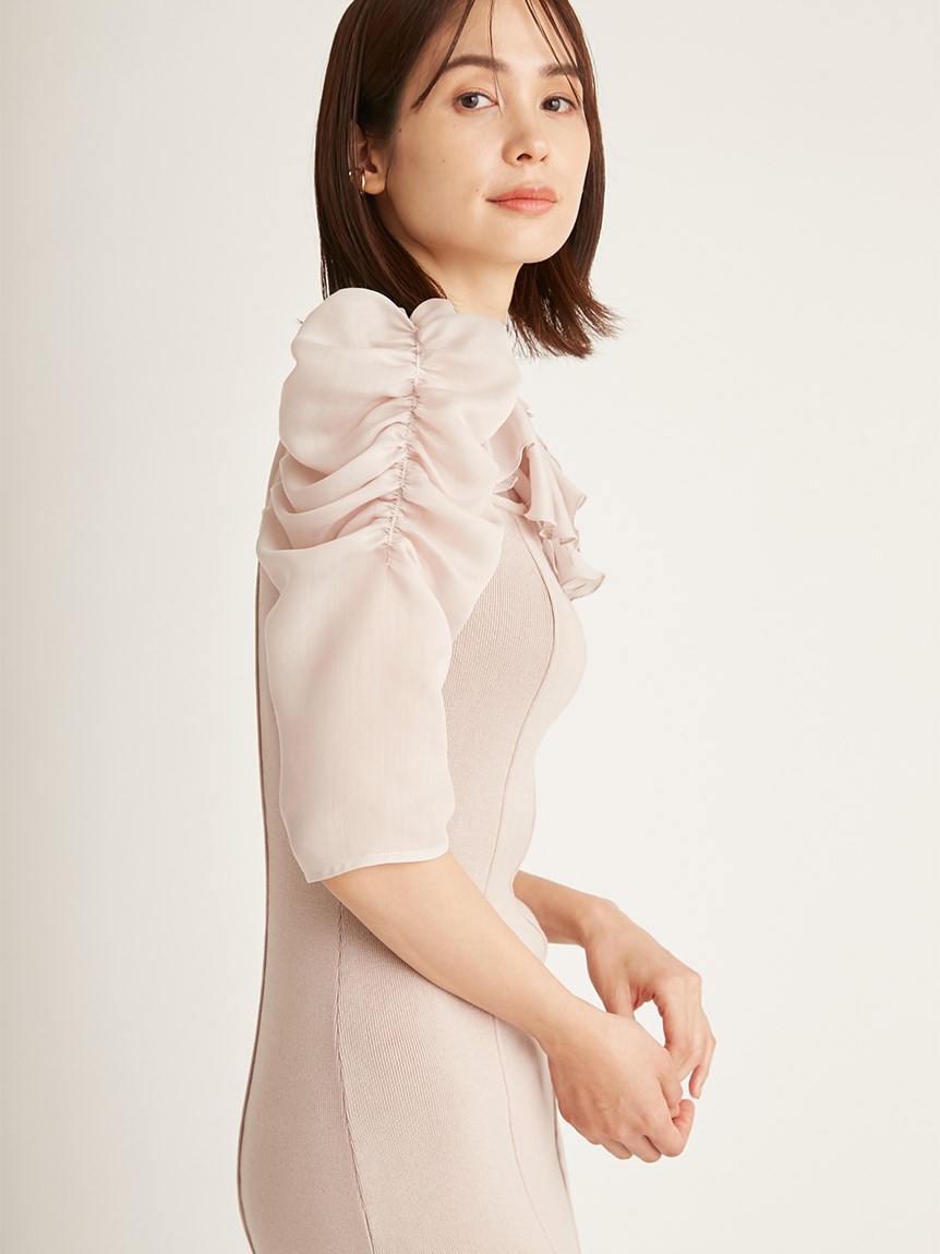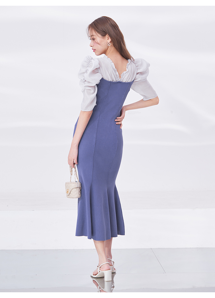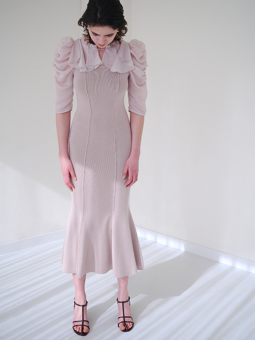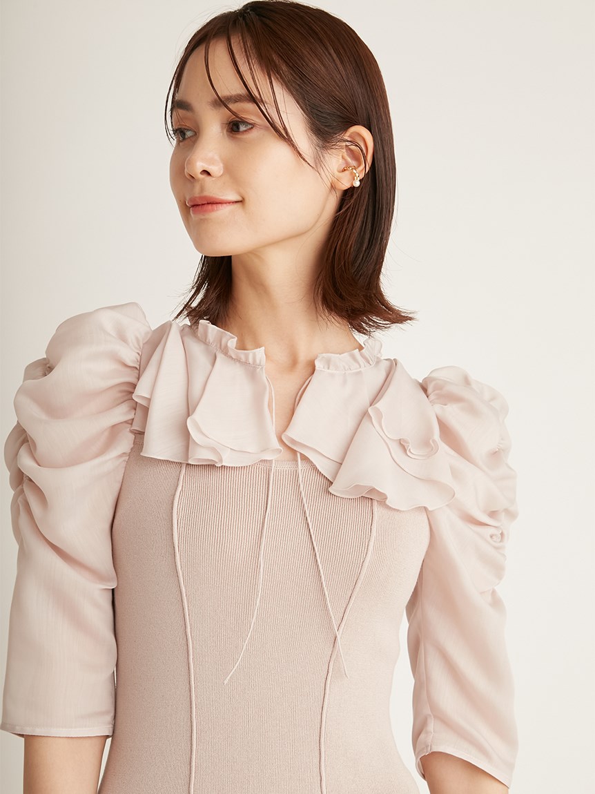 インにフリルブラウスを合わせているかのような、ドッキングデザインのニットワンピース。ギャザーを効かせたボリュームスリーブとエレガントなフリルが華やかさを演出しています。フィット感のあるマーメイドシルエットが女性らしさを引き立てる秘訣。ボディラインを美しく魅せるメリハリラインがスタイルアップを叶えてくれます。