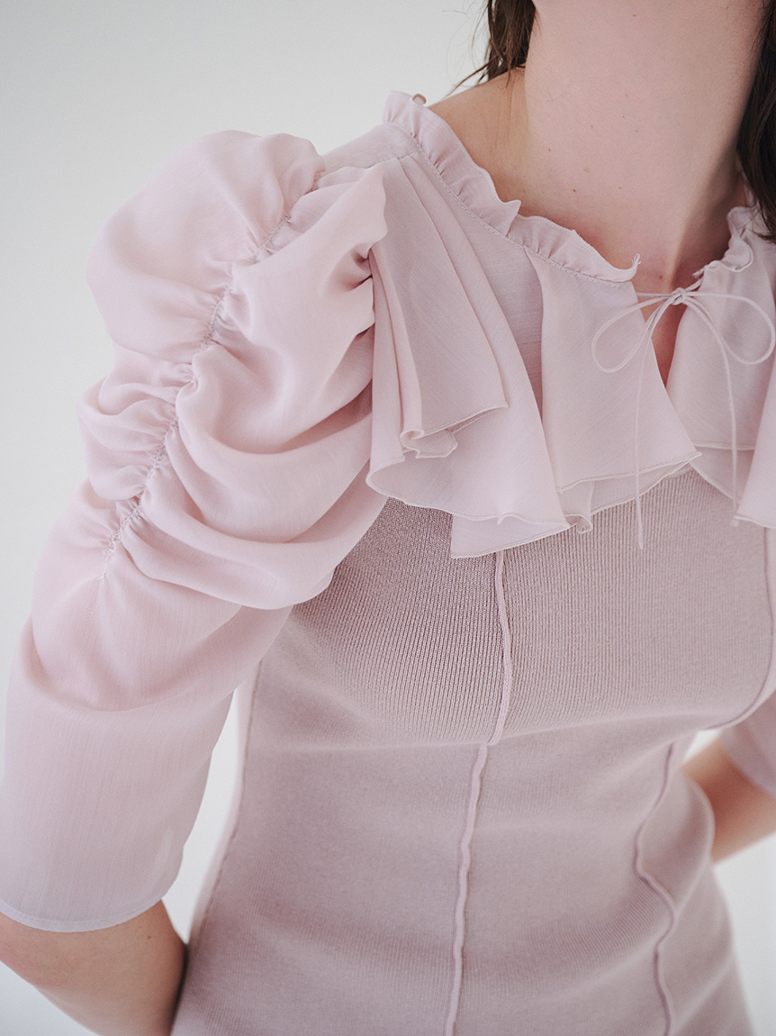 透け感のあるしなやかな布帛と程よい厚みのニットを組み合わせました。バイカラーでモードな雰囲気のブラック、女性らしい淡い色合いのピンクベージュ、ニュアンスのあるカラートーンのダークブルーの3色をご用意。