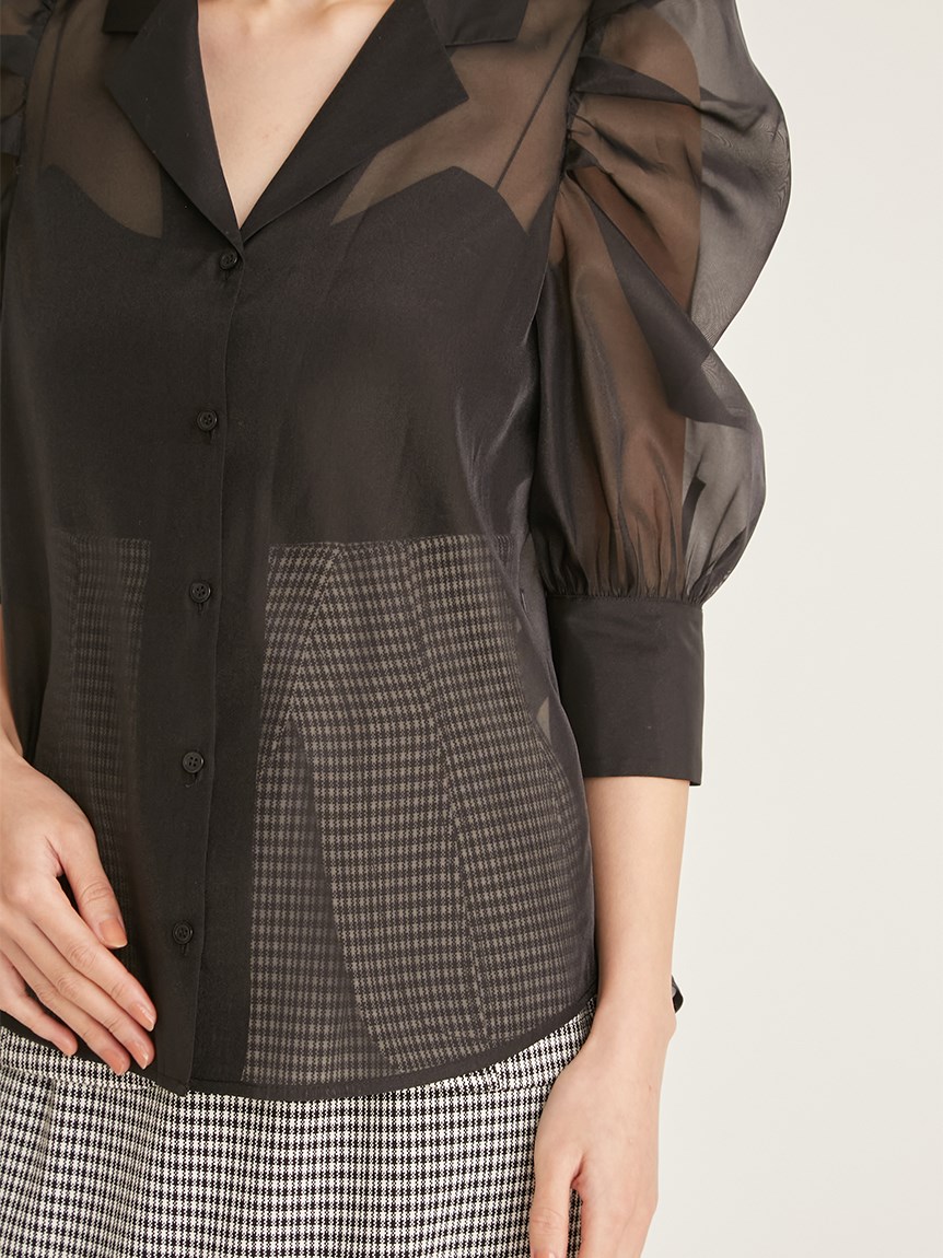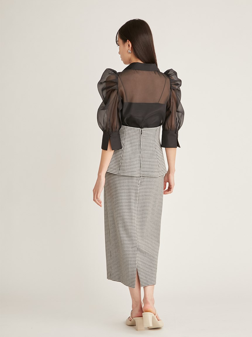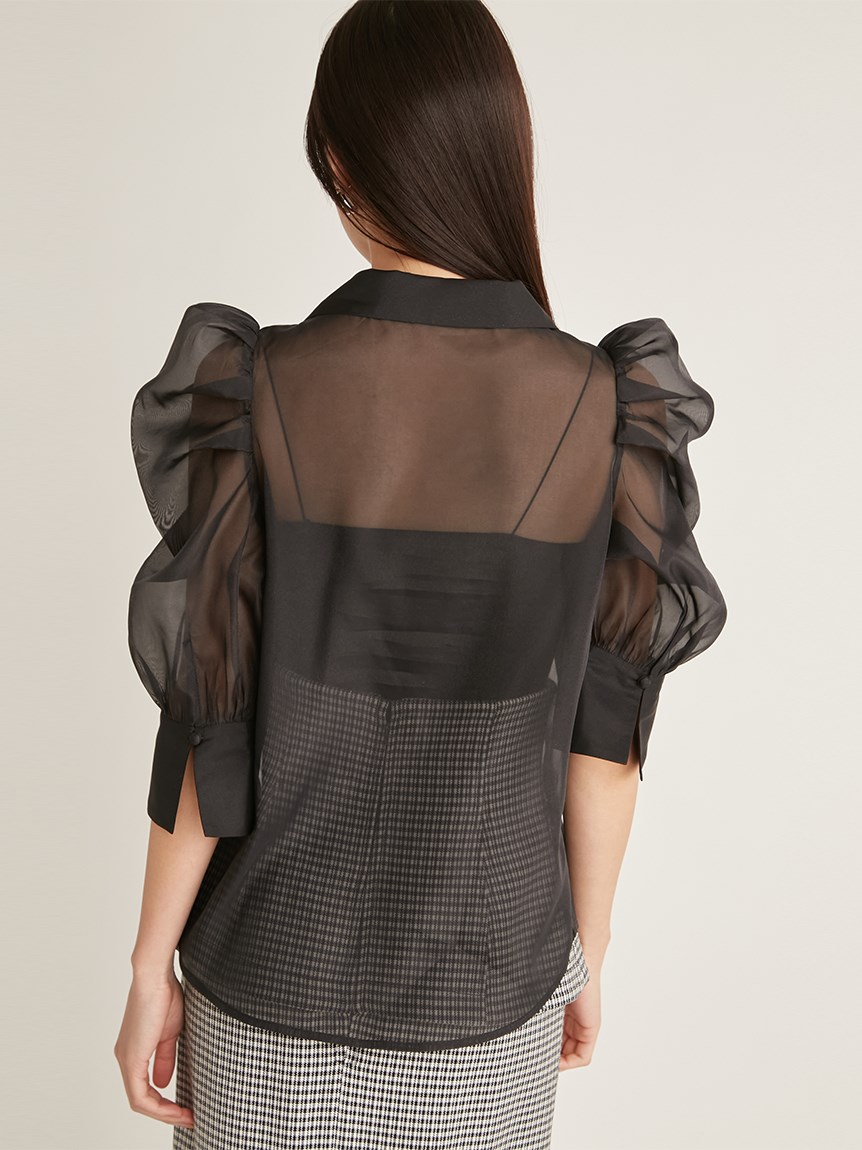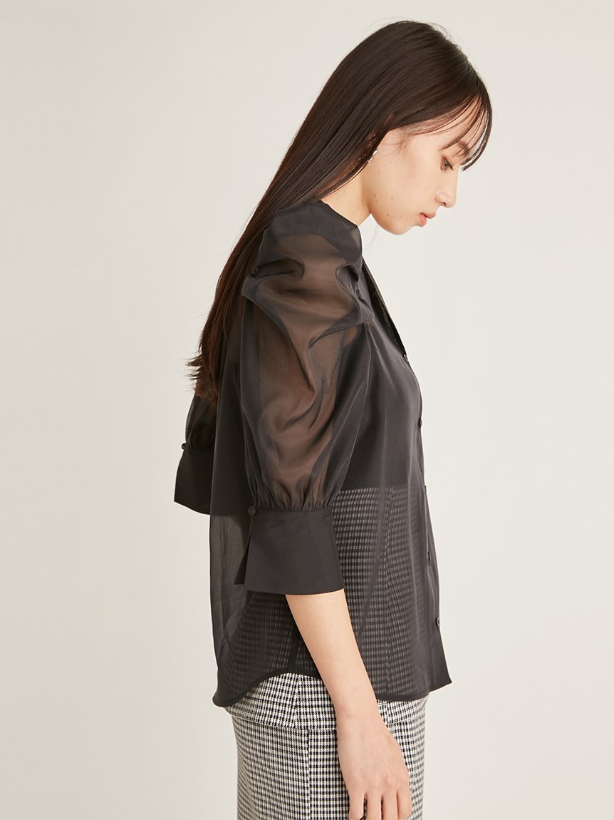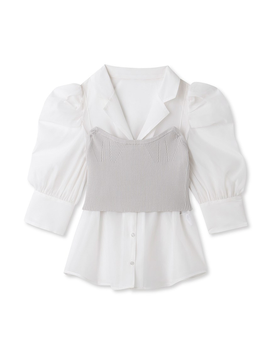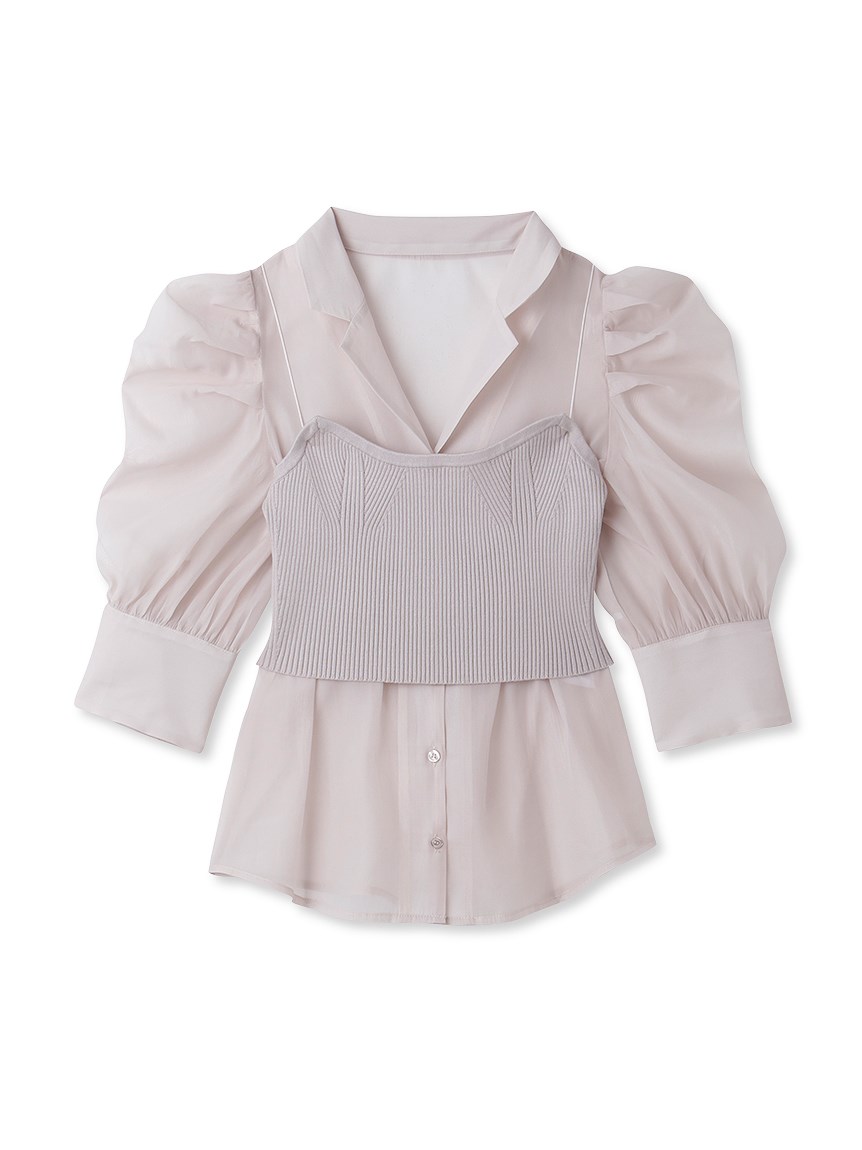 シアーなオーガンジーブラウスにニットビスチェをプラスしたスペシャルなセット。ニットビスチェはインナーキャミとしても着られ、アレンジを存分に楽しめます。巧みなタックワークで立体的に仕上げたボリュームスリーブが女性らしさを引き立てるポイントに。フィット感のある身頃とのメリハリバランスで、スタイルアップへと導いてくれます。