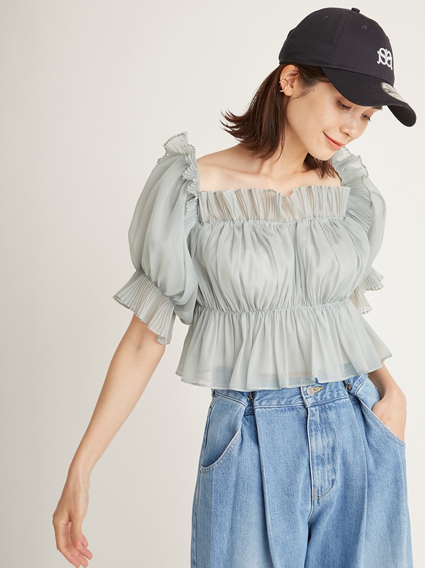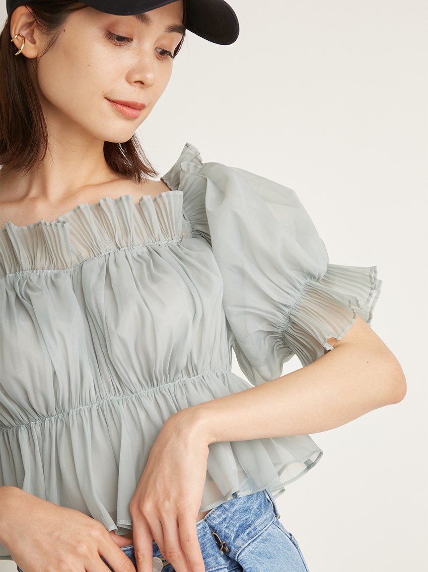 シアーな素材感と大胆な肌見せで、女性らしさを引き立てるオフショルブラウス。華やかなフリルやプリーツをたっぷりと施し、フェミニンな要素をふんだんに詰め込みました。胸下から裾にかけてはフレアラインにすることで、気になる体型をさり気なくカバー。パンツともスカートとも合わせやすく、幅広いコーディネートを楽しめます。