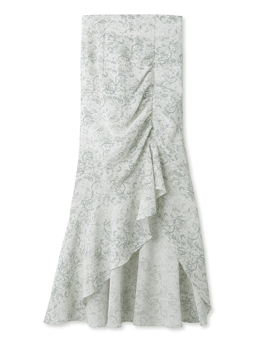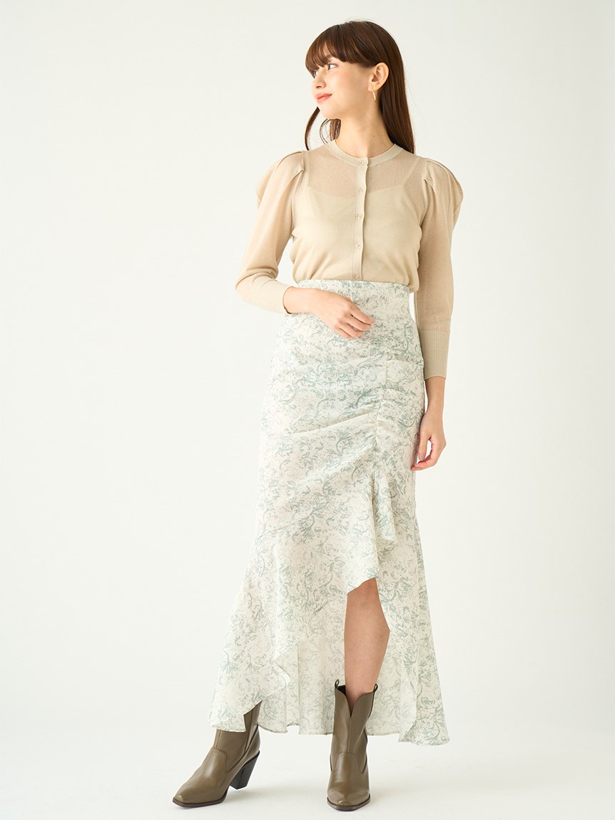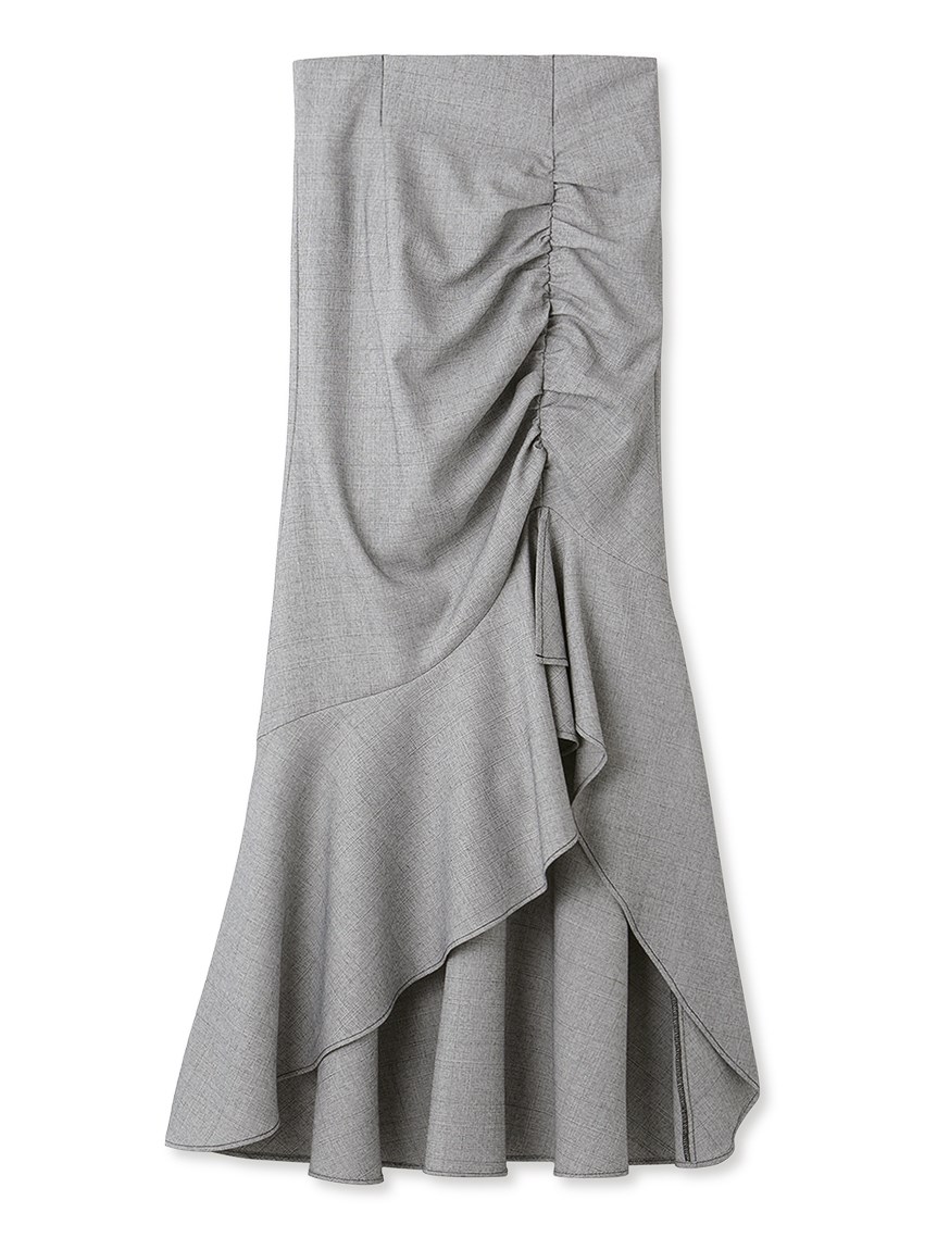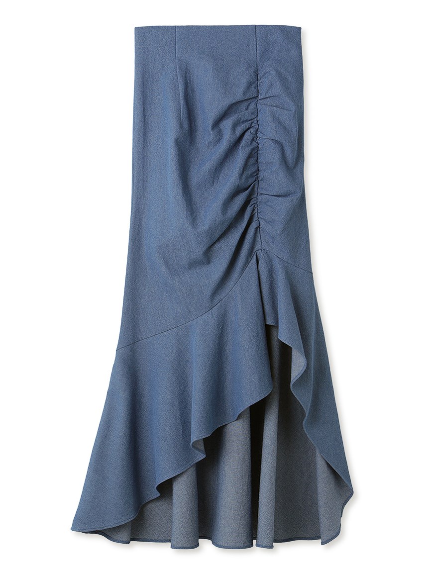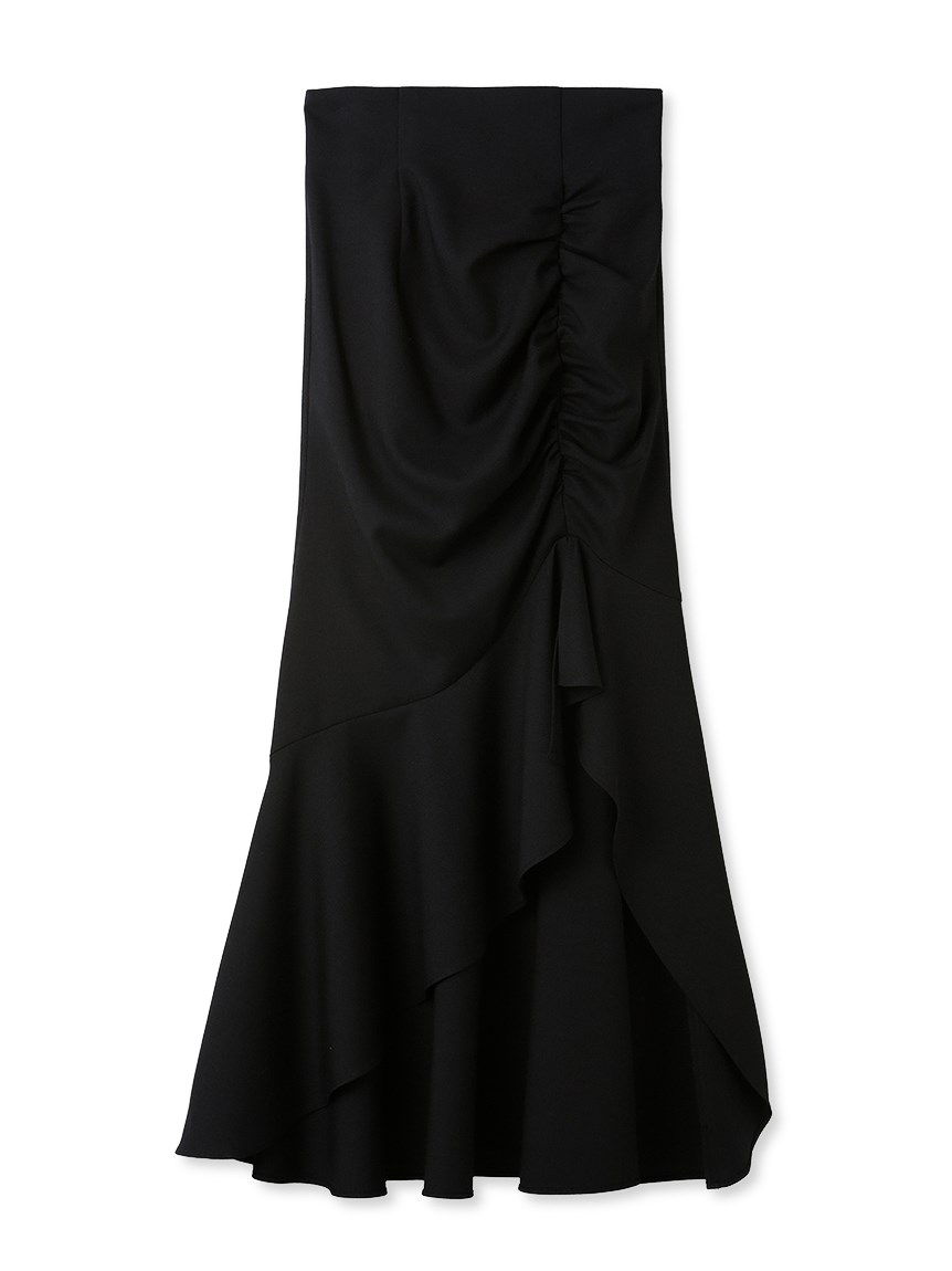 フロント部分に効かせたシャーリングが印象的な、女性らしさ溢れるマーメイドスカート。イレギュラーなラインを描くヘムには深めにスリットを入れ、ヘルシーな肌見せを演出しています。存在感のある華やかなルックスなので、シンプルなトップスを合わせてもサマになる1着。同シリーズのブラウス(SWFB231140)と合わせたワンピースライクなスタイリングもおすすめです。