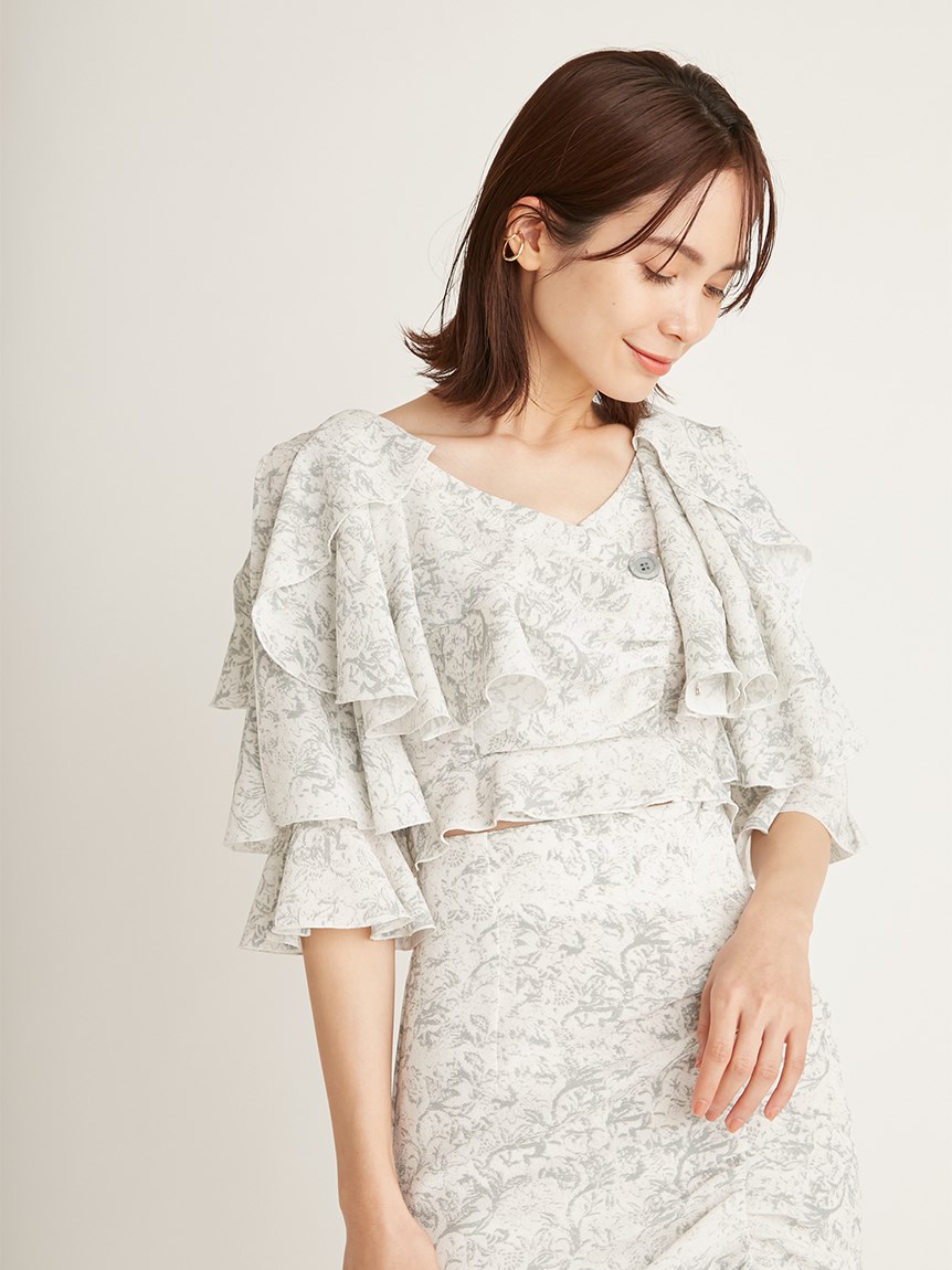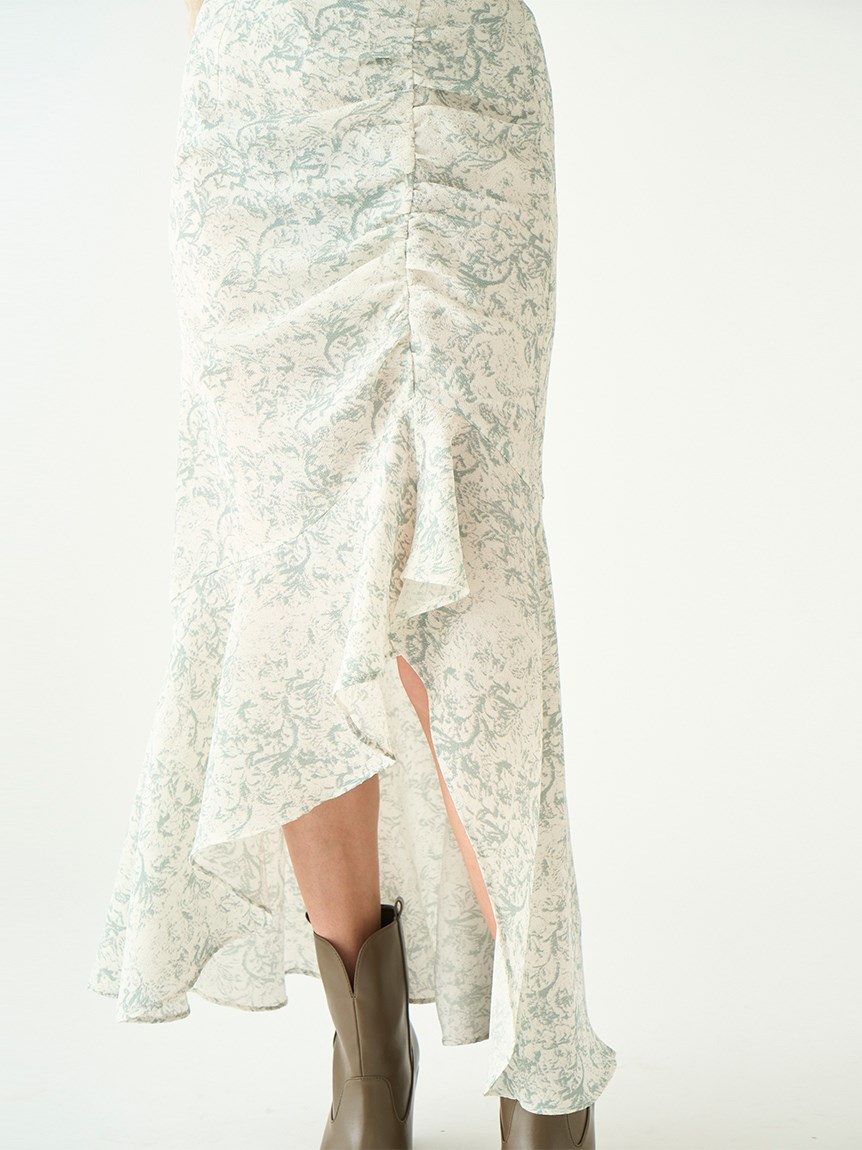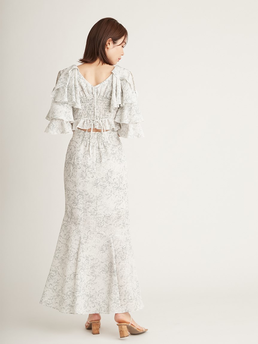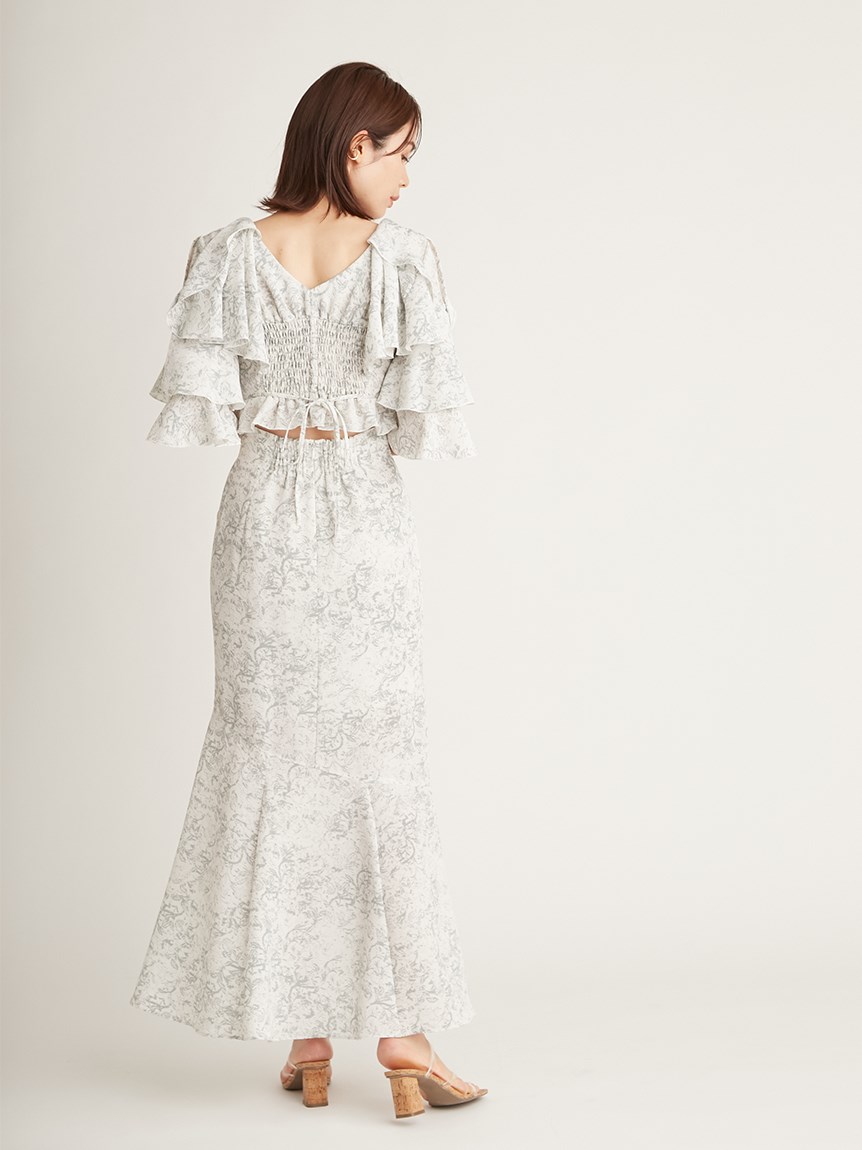フロント部分に効かせたシャーリングが印象的な、女性らしさ溢れるマーメイドスカート。イレギュラーなラインを描くヘムには深めにスリットを入れ、ヘルシーな肌見せを演出しています。存在感のある華やかなルックスなので、シンプルなトップスを合わせてもサマになる1着。同シリーズのブラウス(SWFB231140)と合わせたワンピースライクなスタイリングもおすすめです。