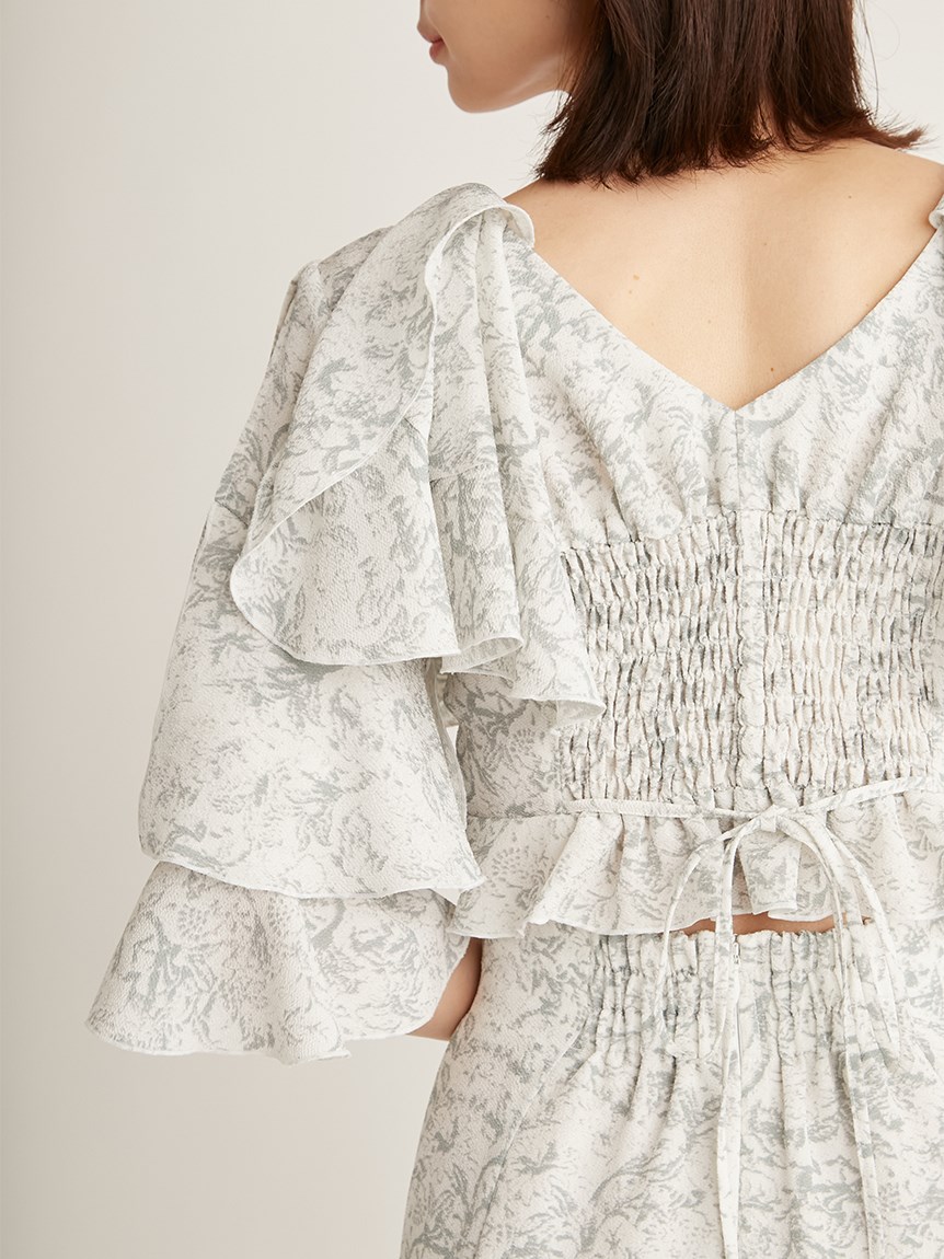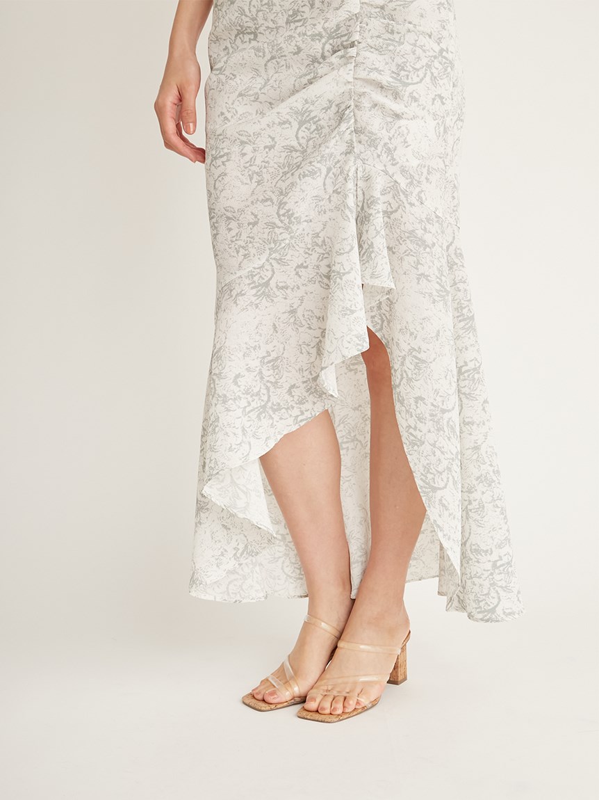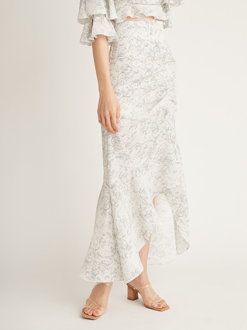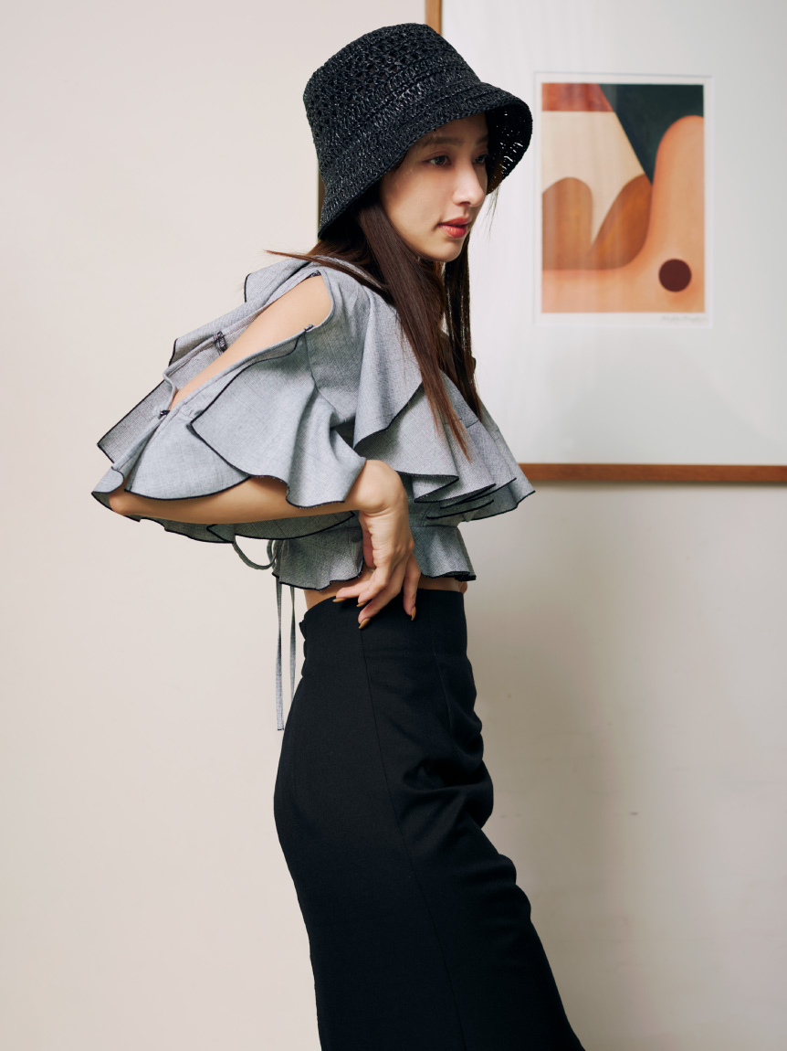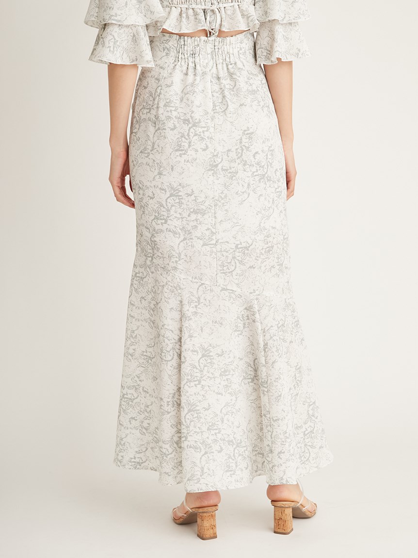 フロント部分に効かせたシャーリングが印象的な、女性らしさ溢れるマーメイドスカート。イレギュラーなラインを描くヘムには深めにスリットを入れ、ヘルシーな肌見せを演出しています。存在感のある華やかなルックスなので、シンプルなトップスを合わせてもサマになる1着。同シリーズのブラウス(SWFB231140)と合わせたワンピースライクなスタイリングもおすすめです。
