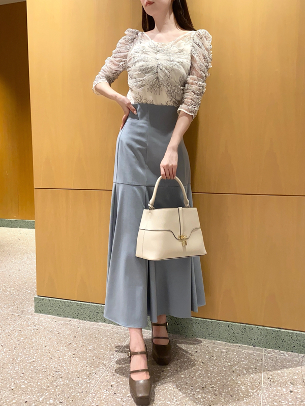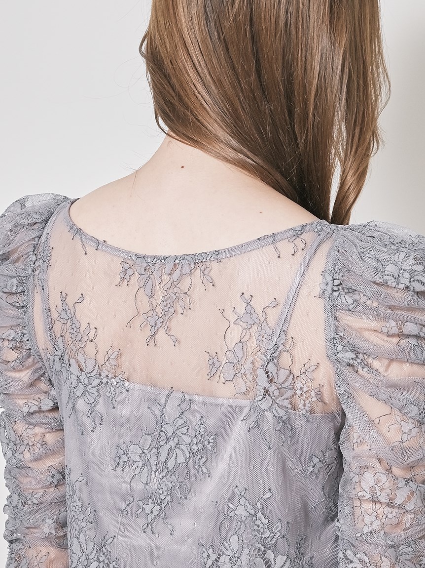 袖とバストにたっぷりとギャザーを効かせた、レディムード溢れるブラウス。透け感のあるレース素材を使用することで、甘さを抑え大人っぽさを演出しました。袖山に高さを持たせた構築的なフォルムのボリュームスリーブがモードなアクセントに。身頃部分はすっきりとしたシルエットに仕上げているのでパンツともスカートとも合わせやすく、サロペットなどのインナーとしてもおすすめです。