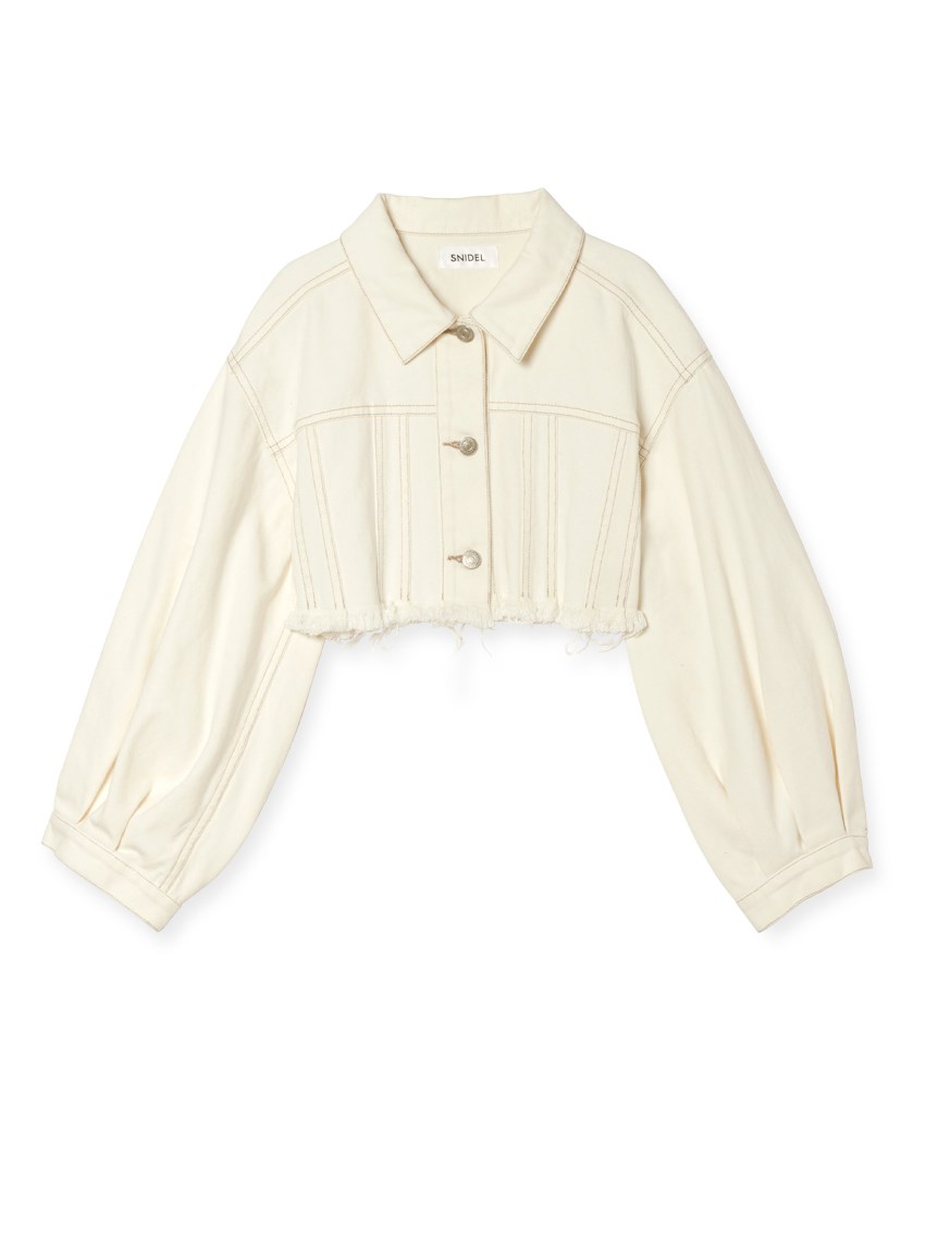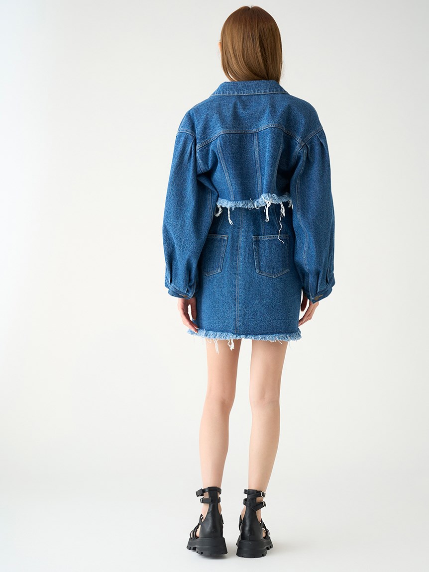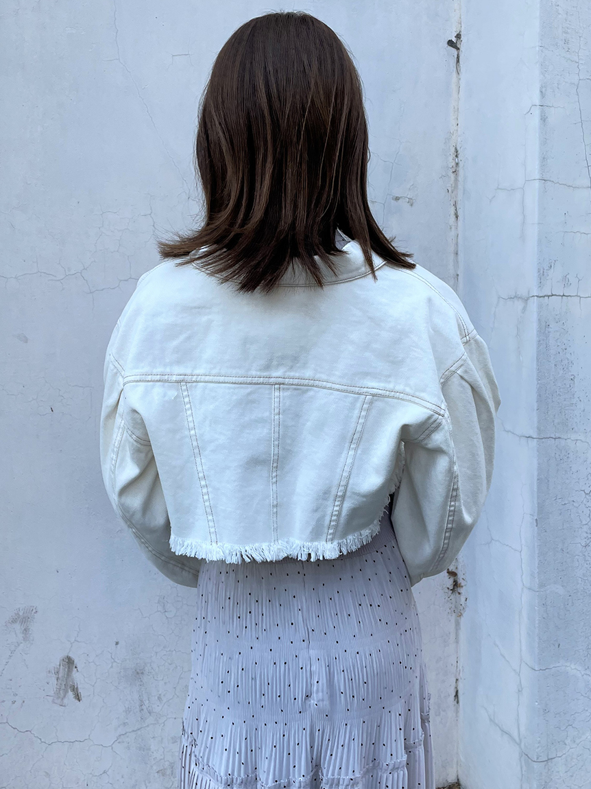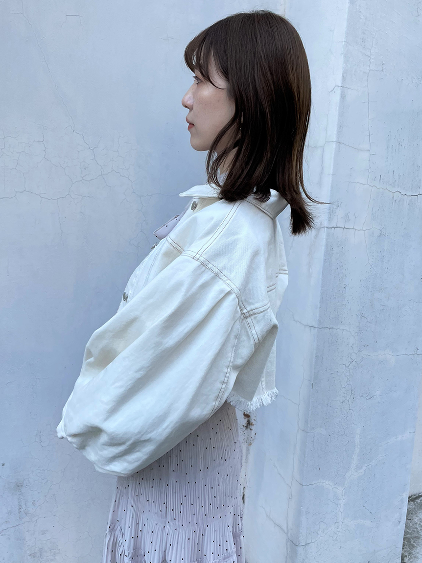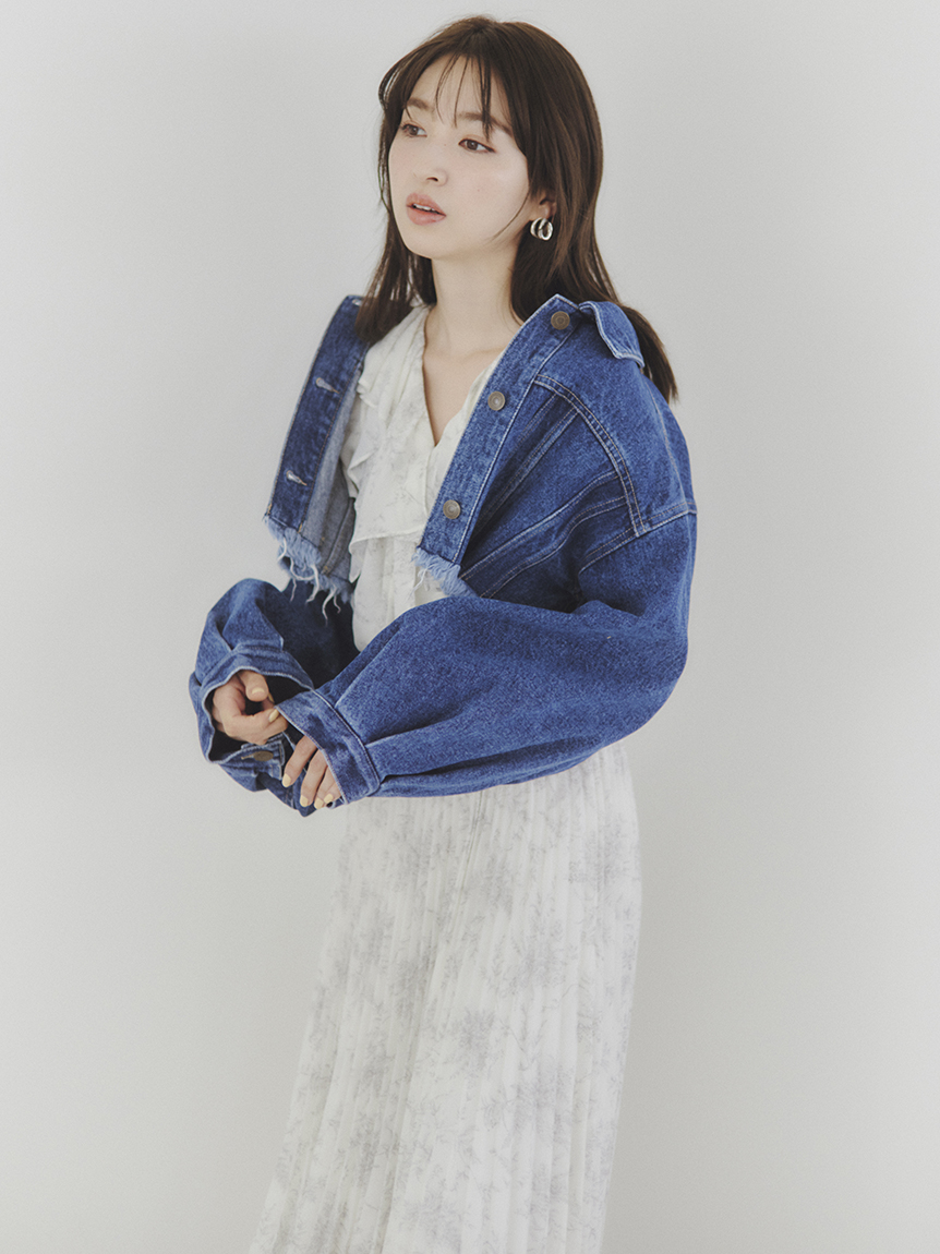 クロップド丈が今年らしいデニムジャケット。裾をカットオフで仕上げることでモードな雰囲気を演出しました。インに合わせるトップス次第で雰囲気ががらりと変わり、幅広いコーディネートが楽しめます。同素材を使用したミニスカート(SWFS231174)と合わせればトレンド感溢れるスタイリングが完成します。