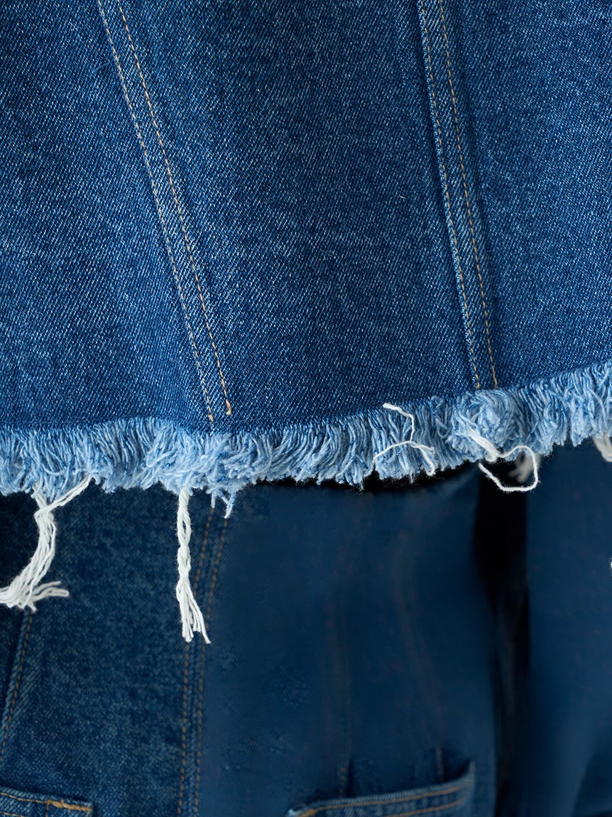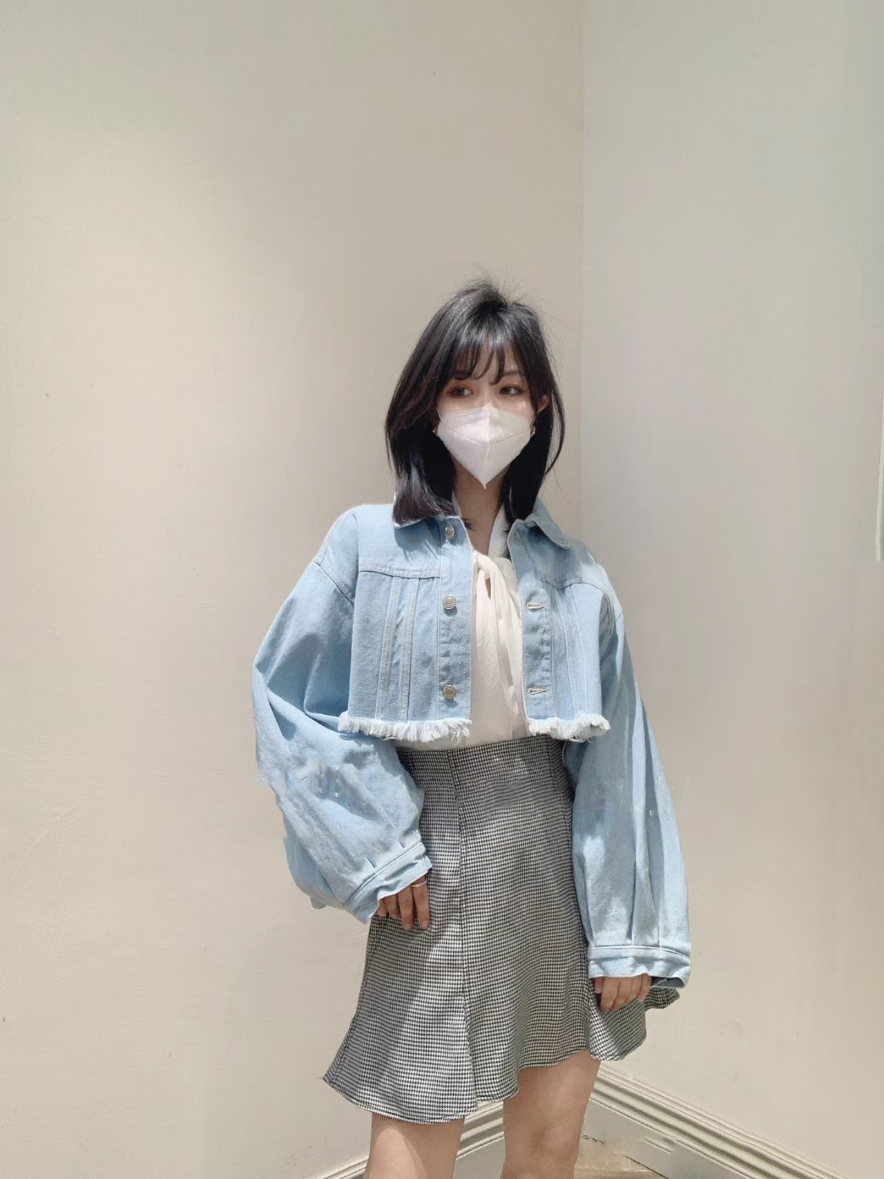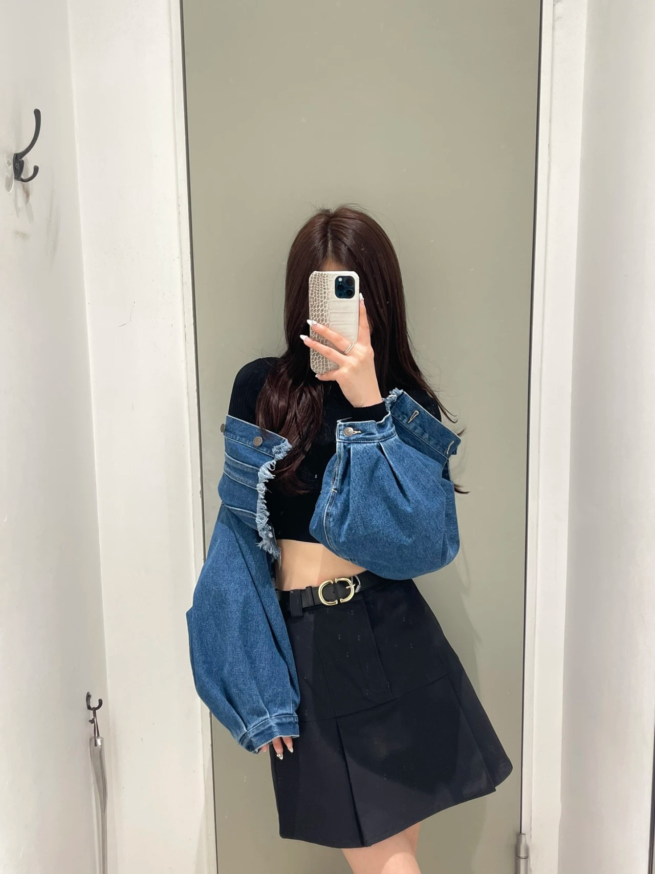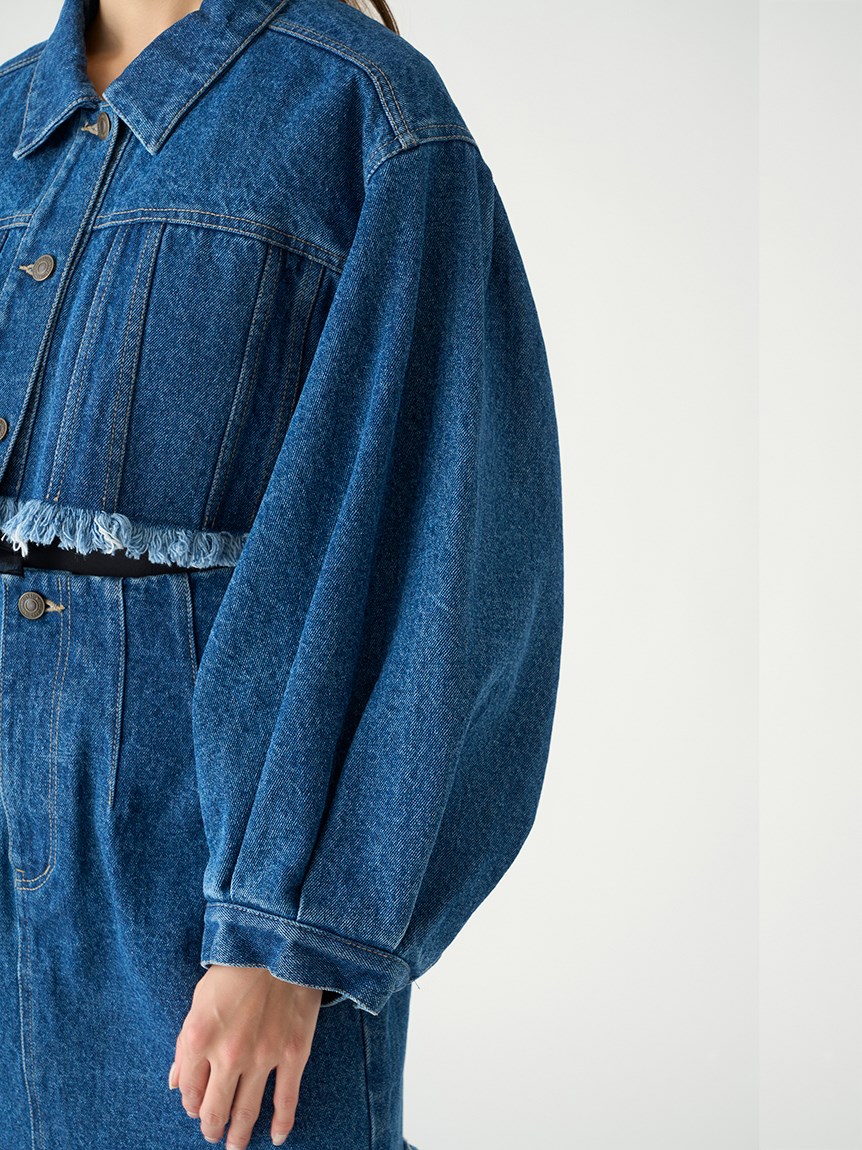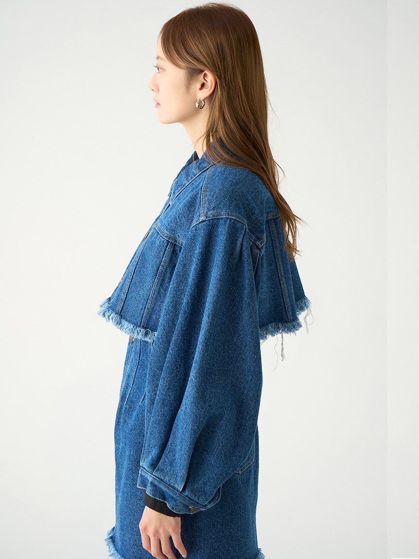 クロップド丈が今年らしいデニムジャケット。裾をカットオフで仕上げることでモードな雰囲気を演出しました。インに合わせるトップス次第で雰囲気ががらりと変わり、幅広いコーディネートが楽しめます。同素材を使用したミニスカート(SWFS231174)と合わせればトレンド感溢れるスタイリングが完成します。