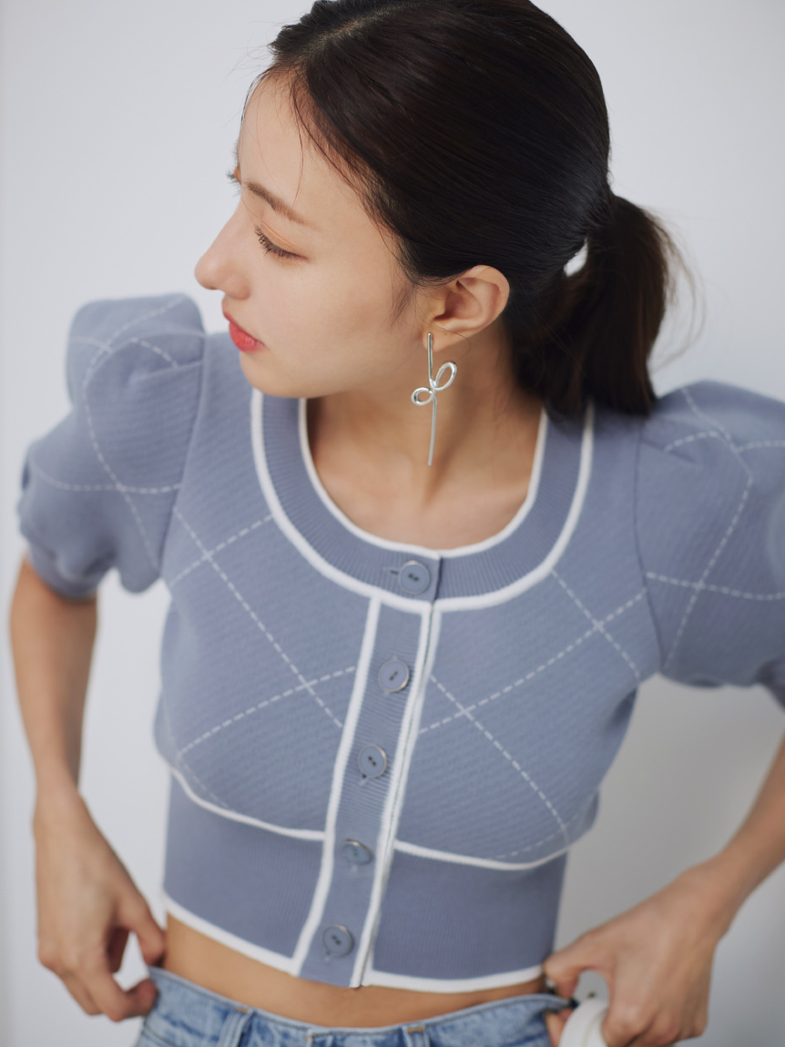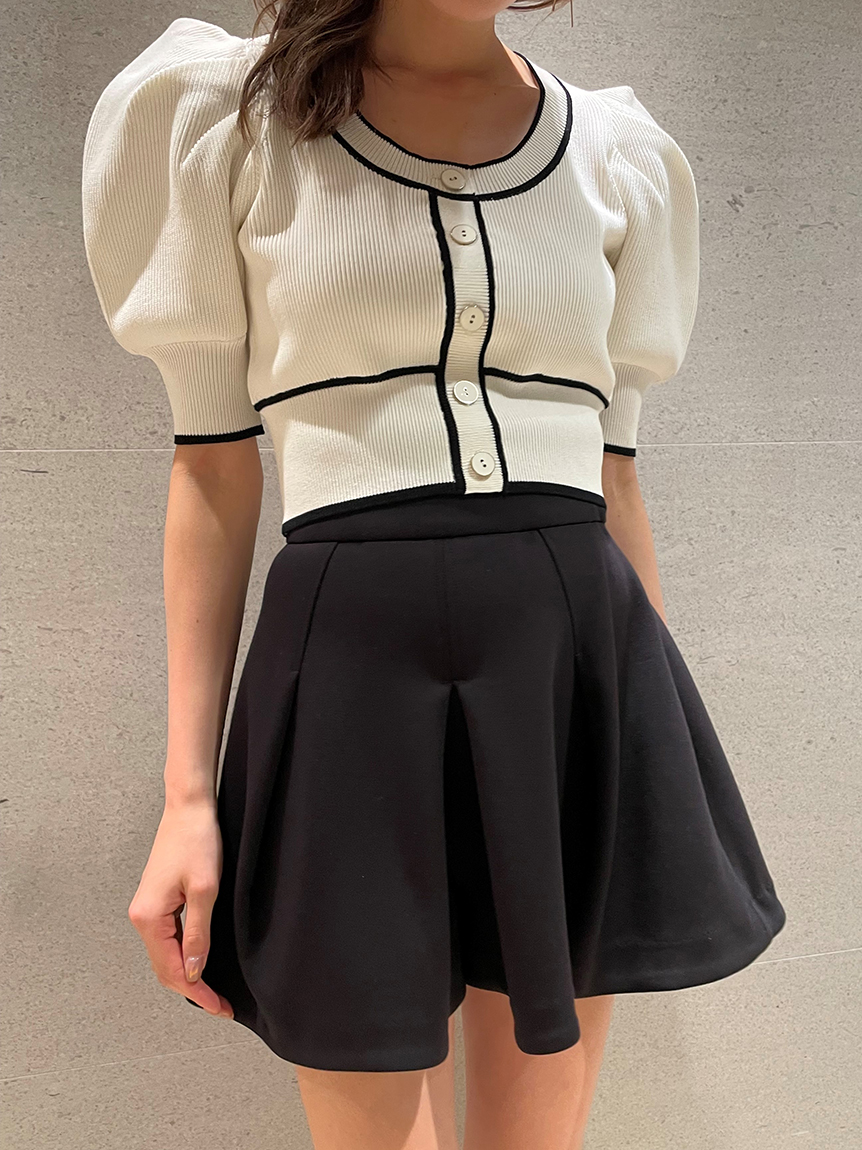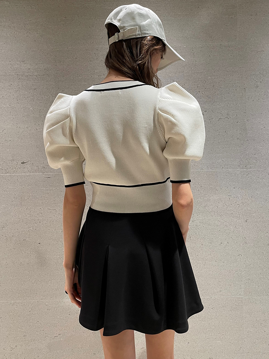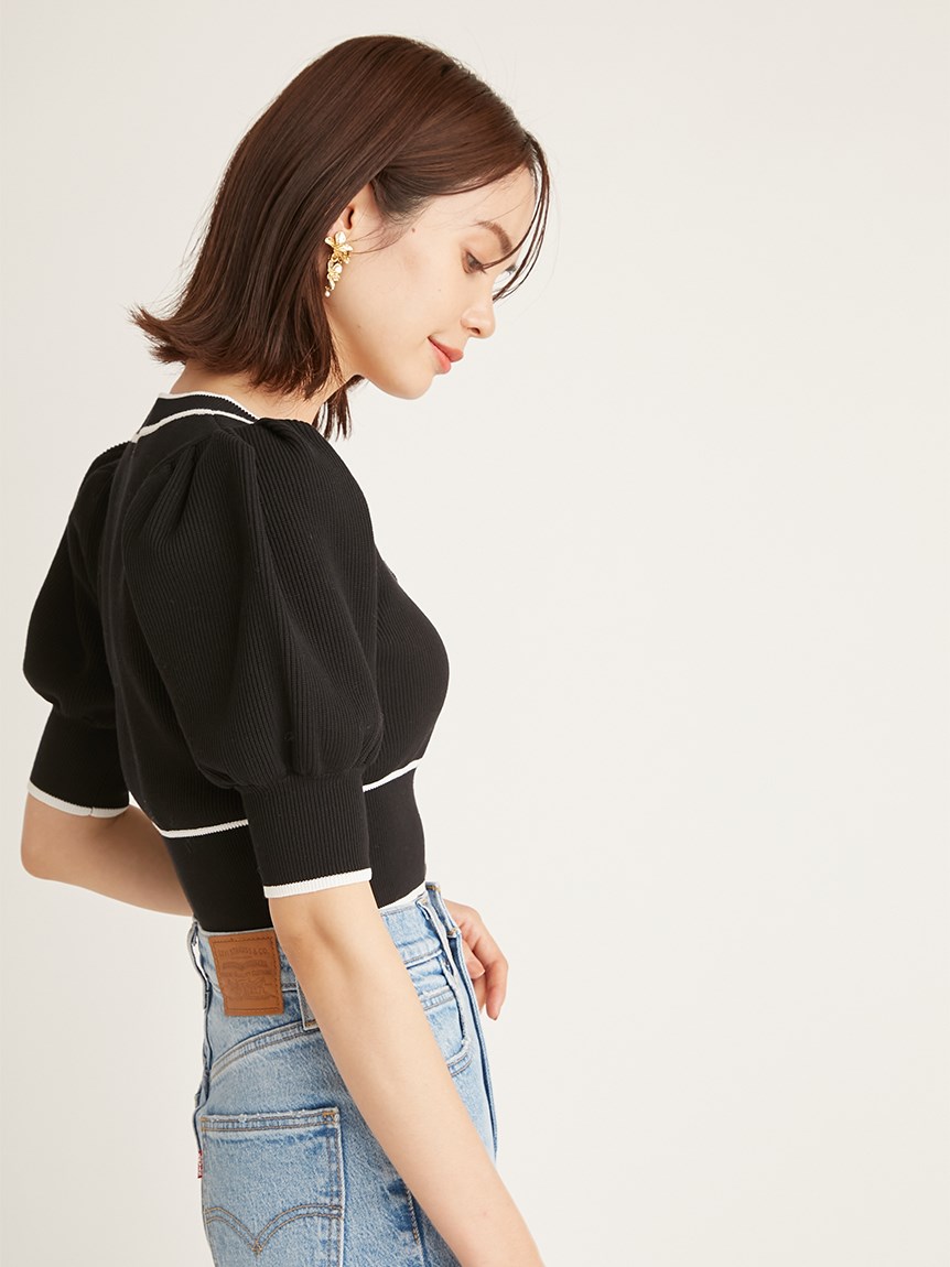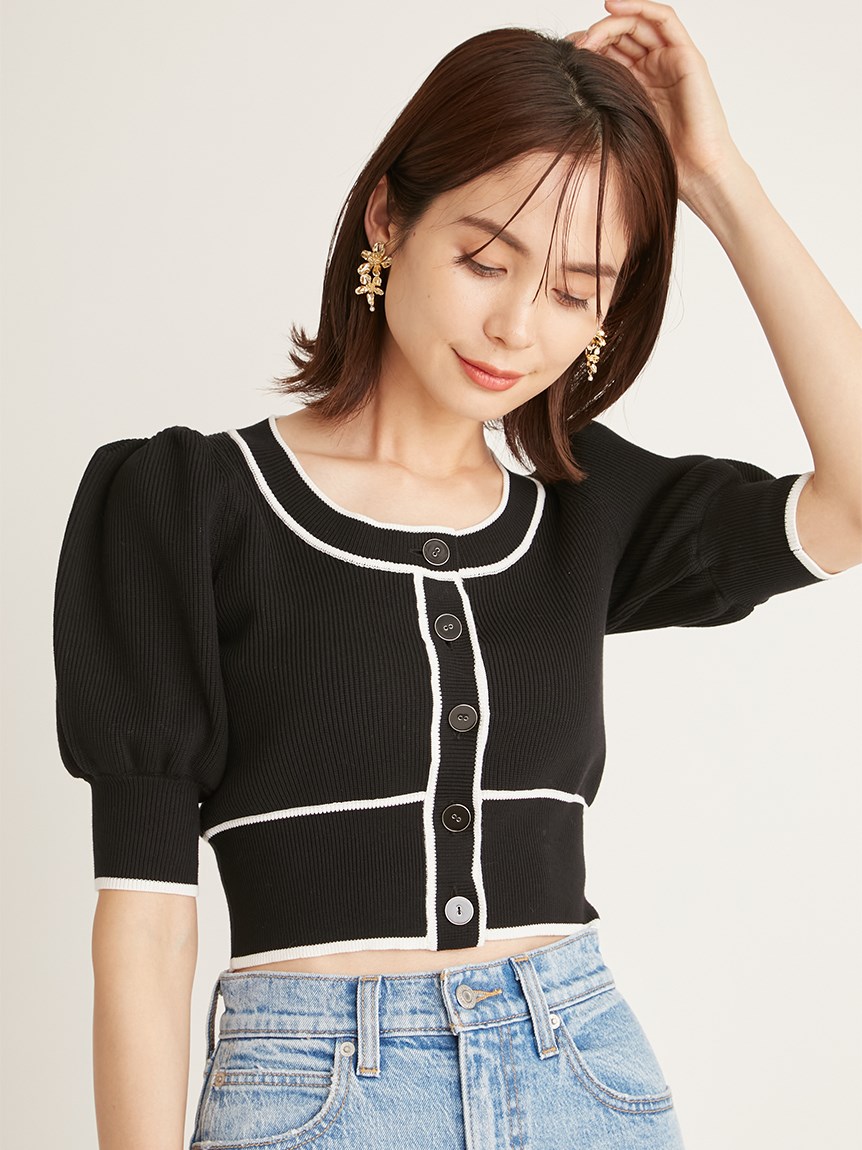 トレンドのクロップド丈を採用した、プラスワンでスタイリングの鮮度が高まるニットプルオーバー。たっぷりとボリュームを持たせたパフスリーブでモードな印象に。バイカラーデザインとカーディガンのようなフロントデザインに金縁ボタンが今年らしいレトロなムードを演出しています。裾&袖口を幅広のリブで切り替えたメリハリシルエットでスタイルアップ効果も抜群です。