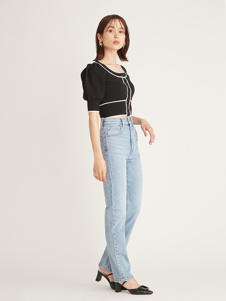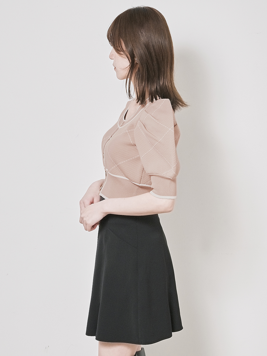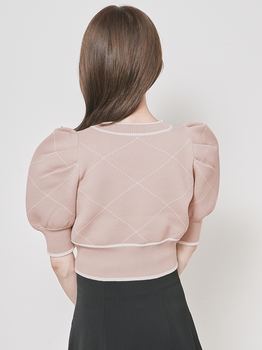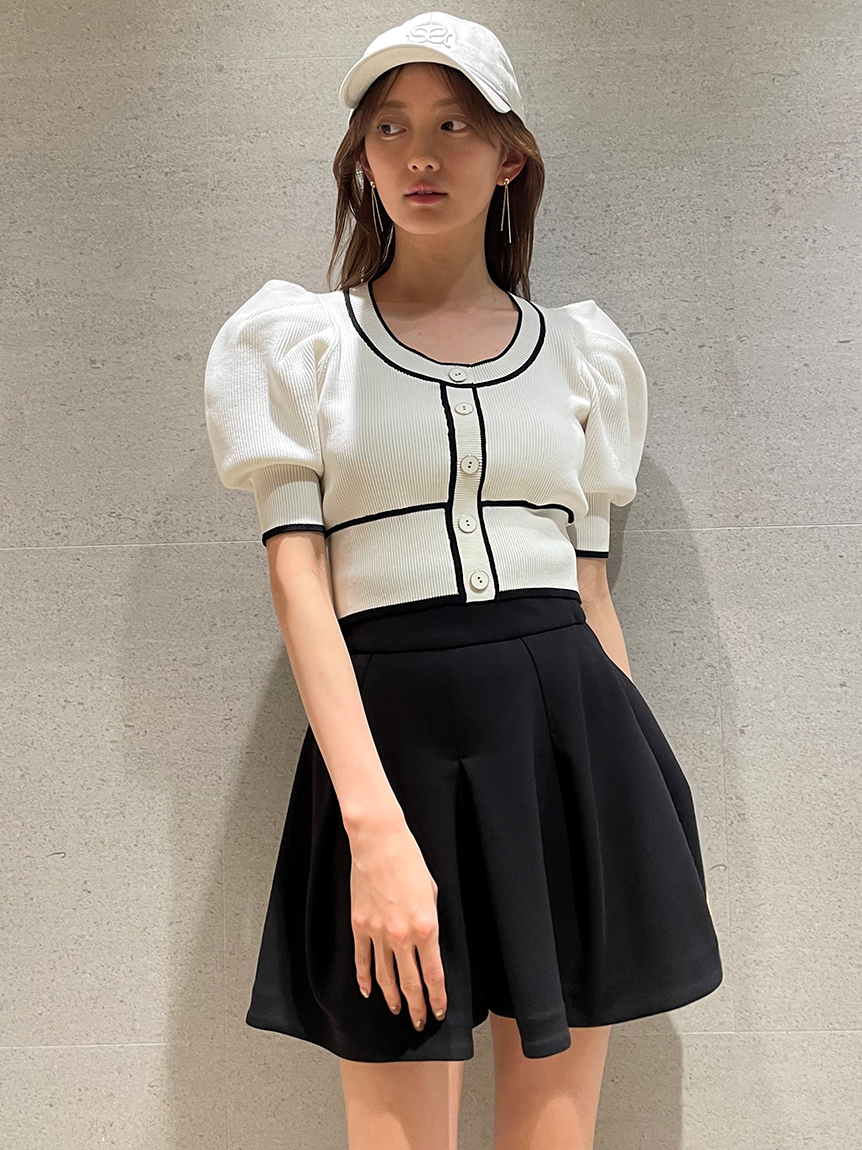 トレンドのクロップド丈を採用した、プラスワンでスタイリングの鮮度が高まるニットプルオーバー。たっぷりとボリュームを持たせたパフスリーブでモードな印象に。バイカラーデザインとカーディガンのようなフロントデザインに金縁ボタンが今年らしいレトロなムードを演出しています。裾&袖口を幅広のリブで切り替えたメリハリシルエットでスタイルアップ効果も抜群です。